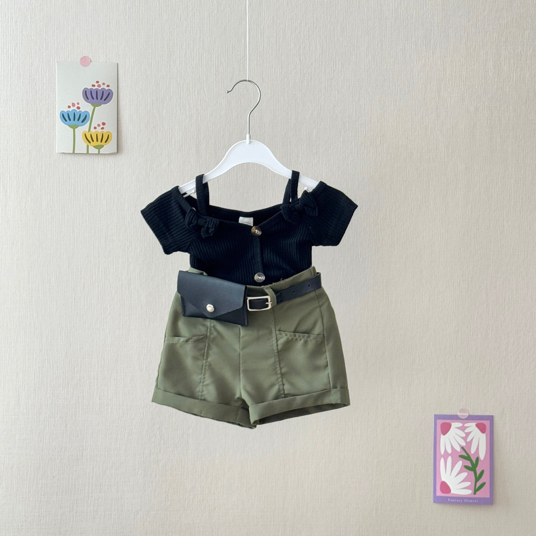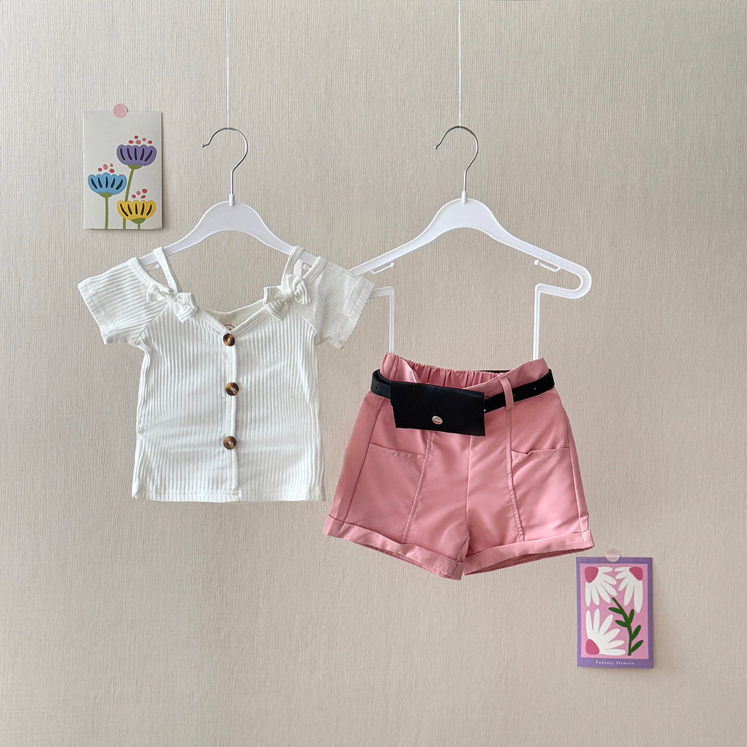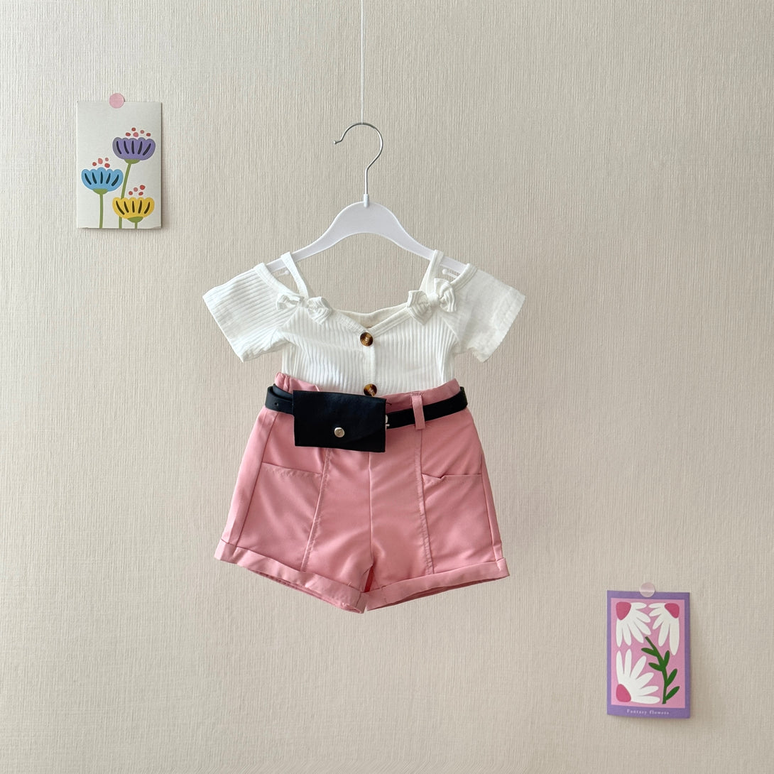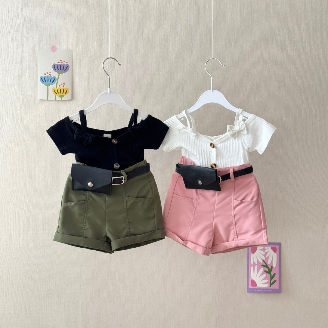 El top con hombros descubiertos presenta una textura acanalada y encantadores detalles de lazos en los hombros, con dos botones dorados en la parte delantera que le dan un toque de elegancia. Los shorts rosas tienen el bajo enrollado y múltiples bolsillos, lo que les da un toque práctico. Combinados con un cinturón negro y una pequeña riñonera, le dan un aspecto elegante y moderno. El top probablemente esté hecho de algodón suave para mayor comodidad, y los shorts parecen estar confeccionados con una resistente mezcla de algodón, ideal para un día divertido y para mantener a los pequeños a la moda.
