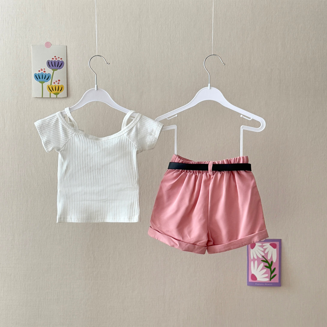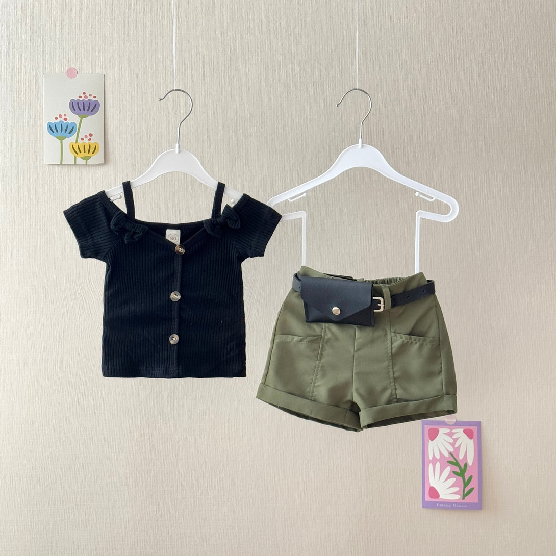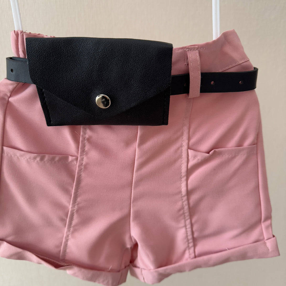 El top con hombros descubiertos presenta una textura acanalada y encantadores detalles de lazos en los hombros, con dos botones dorados en la parte delantera que le dan un toque de elegancia. Los shorts rosas tienen el bajo enrollado y múltiples bolsillos, lo que les da un toque práctico. Combinados con un cinturón negro y una pequeña riñonera, le dan un aspecto elegante y moderno. El top probablemente esté hecho de algodón suave para mayor comodidad, y los shorts parecen estar confeccionados con una resistente mezcla de algodón, ideal para un día divertido y para mantener a los pequeños a la moda.