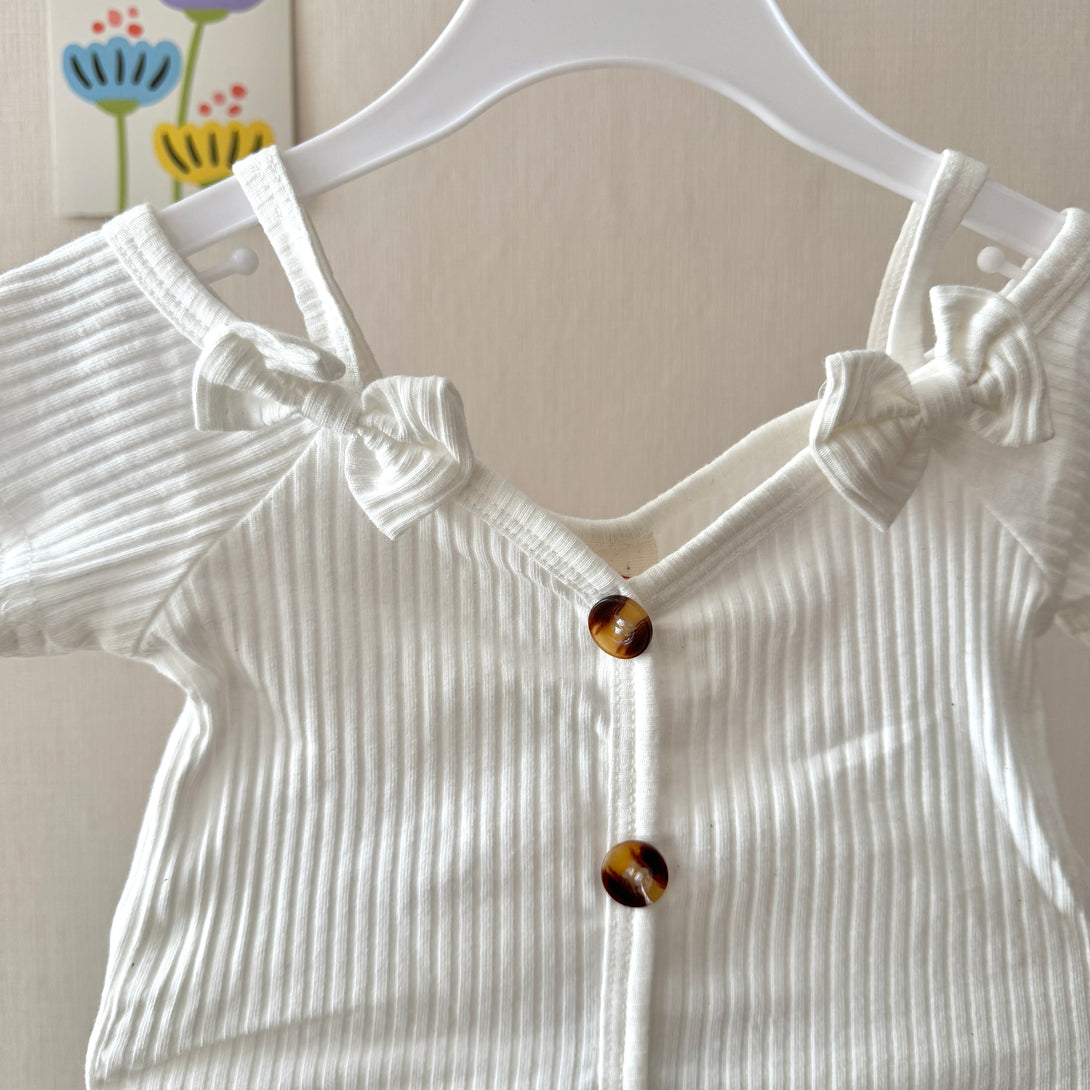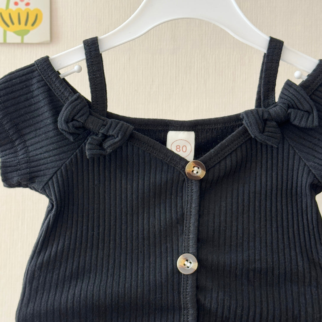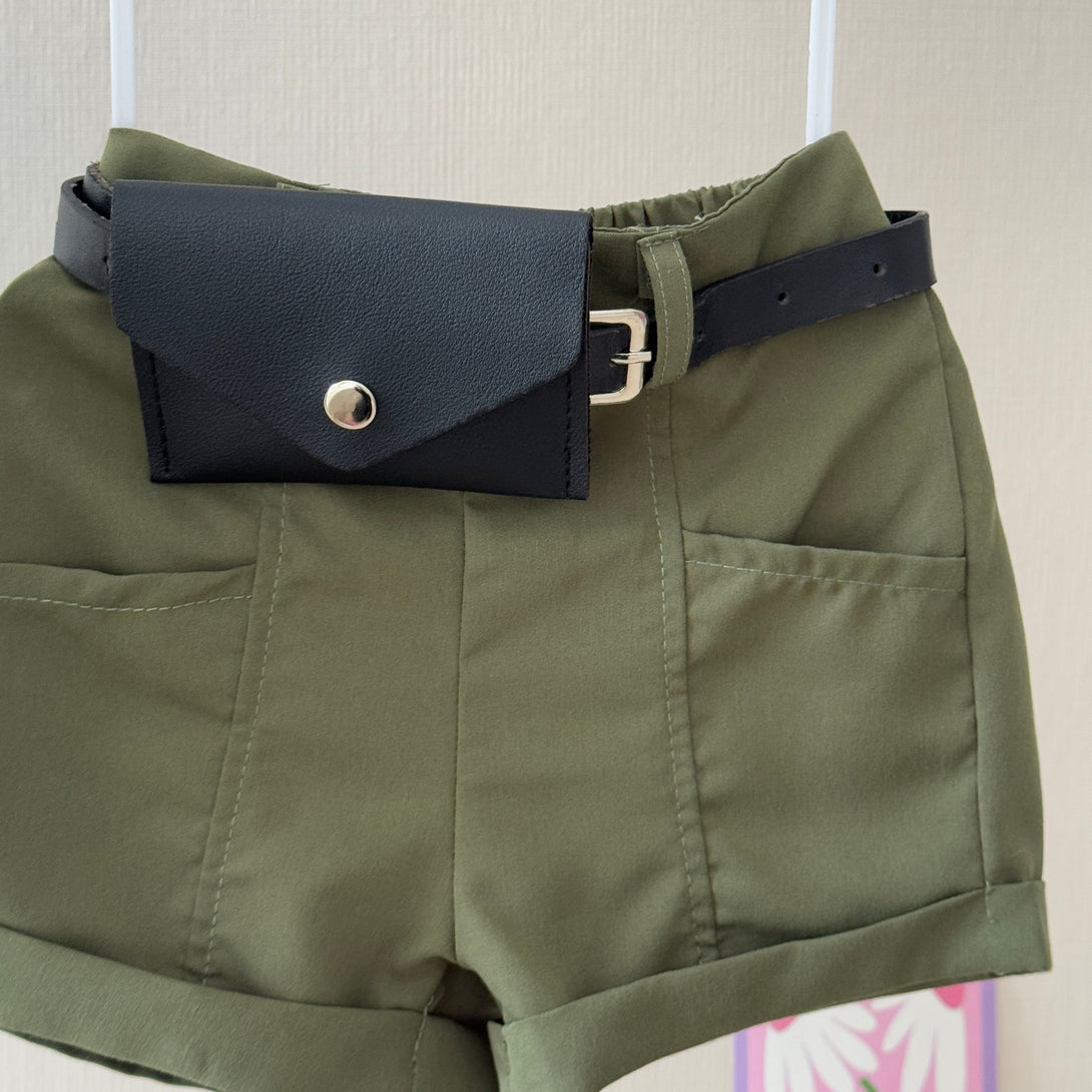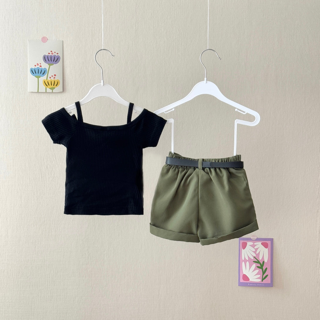 El top con hombros descubiertos presenta una textura acanalada y encantadores detalles de lazos en los hombros, con dos botones dorados en la parte delantera que le dan un toque de elegancia. Los shorts rosas tienen el bajo enrollado y múltiples bolsillos, lo que les da un toque práctico. Combinados con un cinturón negro y una pequeña riñonera, le dan un aspecto elegante y moderno. El top probablemente esté hecho de algodón suave para mayor comodidad, y los shorts parecen estar confeccionados con una resistente mezcla de algodón, ideal para un día divertido y para mantener a los pequeños a la moda.