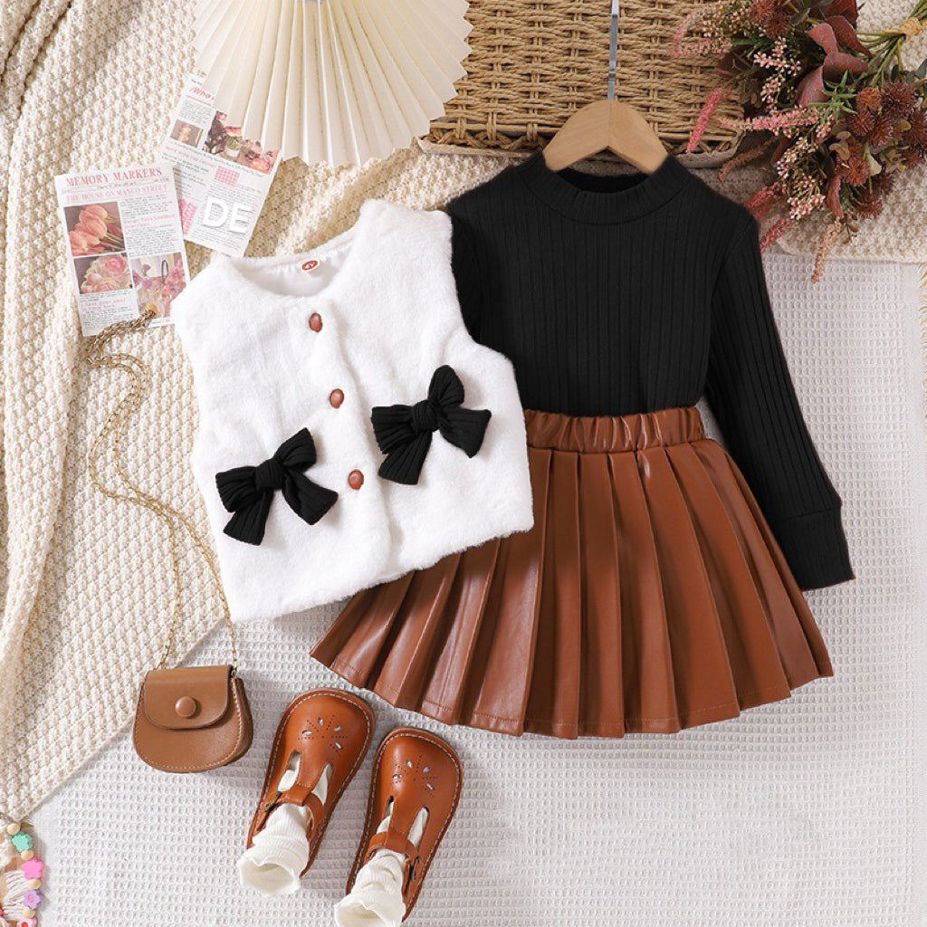 Add a dash of autumn brilliance with our Amber Charm Fur Set. Featuring a black ribbed knit top and a glossy caramel pleated skirt, this look is both playful and chic. The soft white faux fur vest with black bow accents adds cozy flair and contrast. A standout choice for cool-weather adventures or family gatherings.