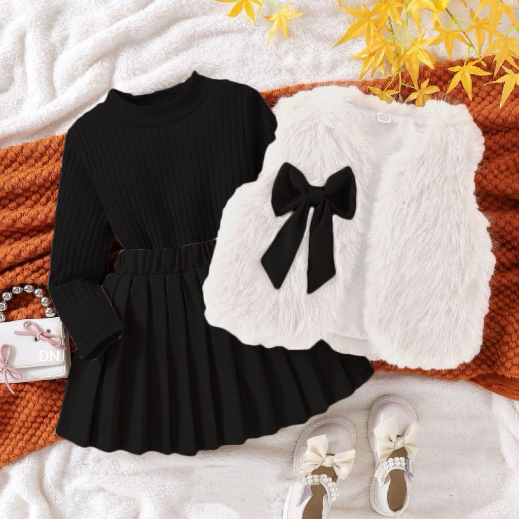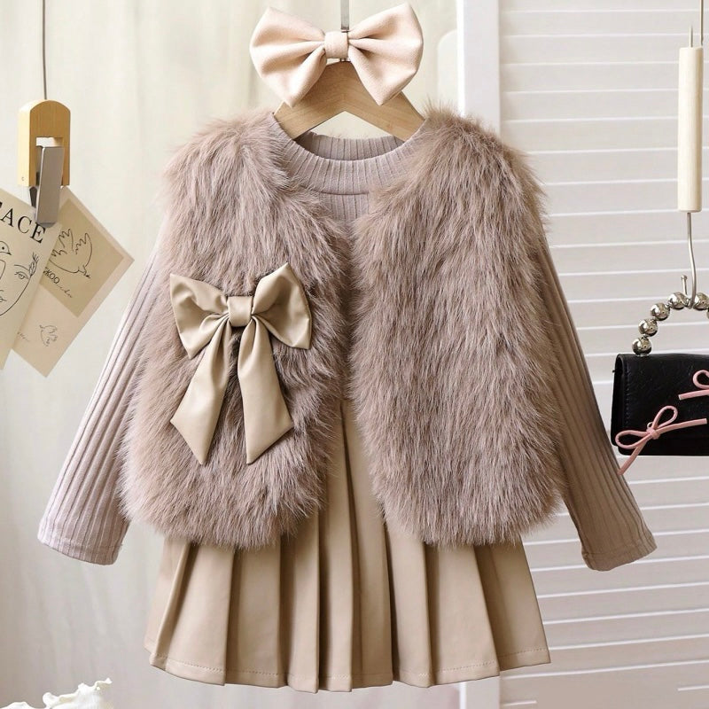 Wrap your little one in elegance and warmth with our Autumn Grace set. This adorable two-piece outfit features a soft ribbed knit dress in , perfectly paired with a faux fur vest in beige and white color. A large satin bow adds a charming, feminine touch, while the pleated skirt enhances the outfit’s classic appeal. Ideal for chilly seasons, this set combines cozy textures with refined style—perfect for special outings or stylish everyday wear.