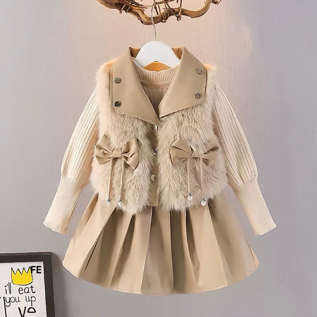 This adorable two-piece outfit features a soft ribbed knit dress in a warm beige tone, perfectly paired with a faux fur vest in a muted taupe color. A large satin bow adds a charming, feminine touch, while the pleated skirt enhances the outfit’s classic appeal. Ideal for chilly seasons, this set combines cozy textures with refined style—perfect for special outings or stylish everyday wear.