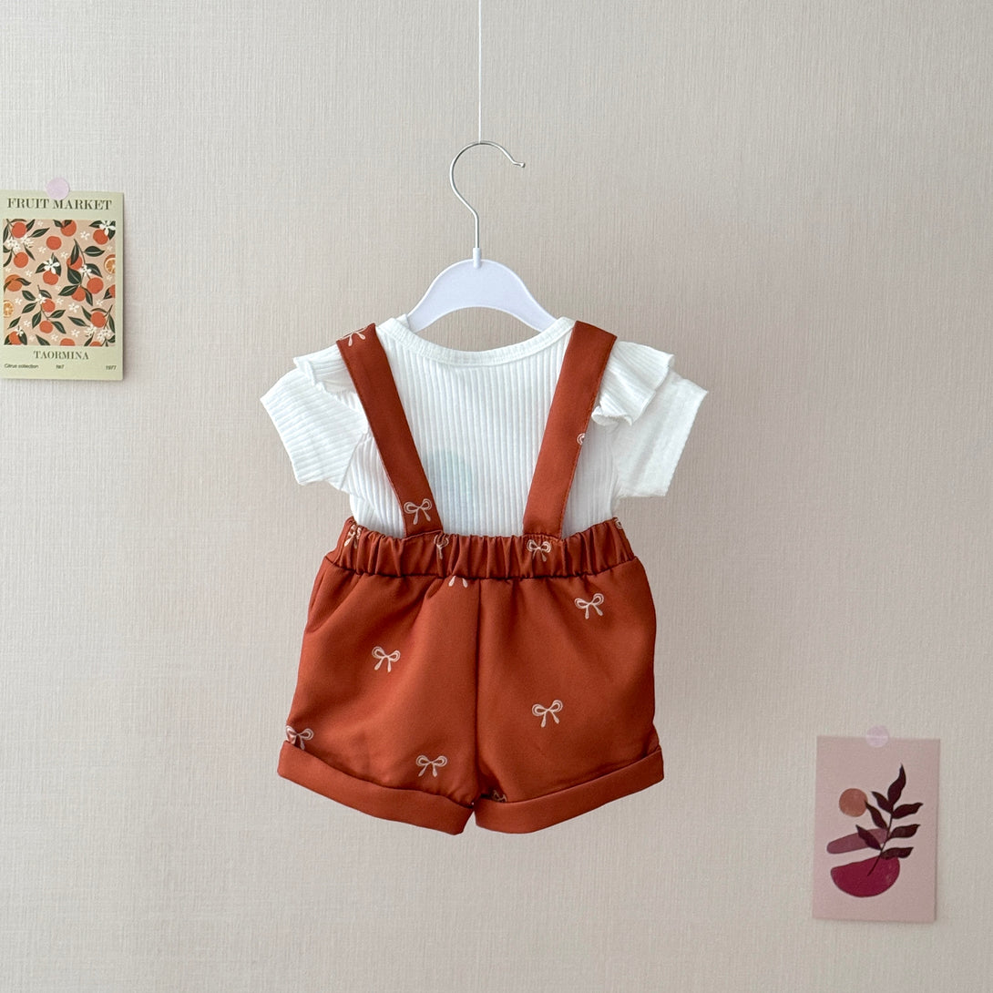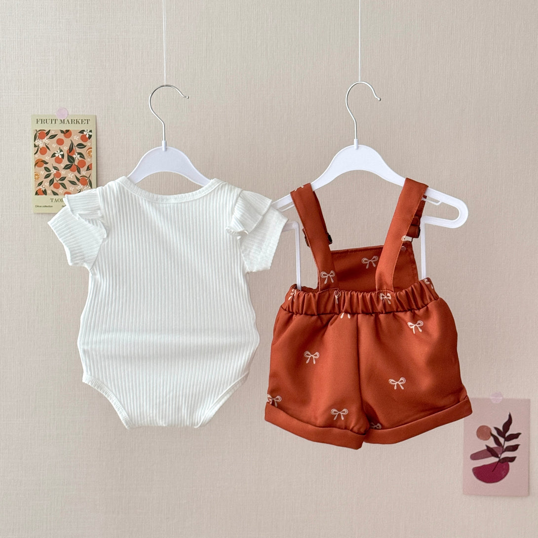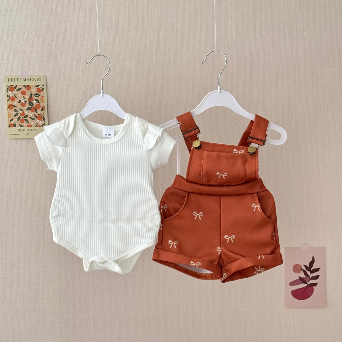 This baby outfit combines a white rib knit bodysuit with flutter sleeves and brown colored overalls. The overalls have adjustable straps, bow patterns, and cuffed shorts. Made of soft, durable materials, perfect for any baby occasion.
