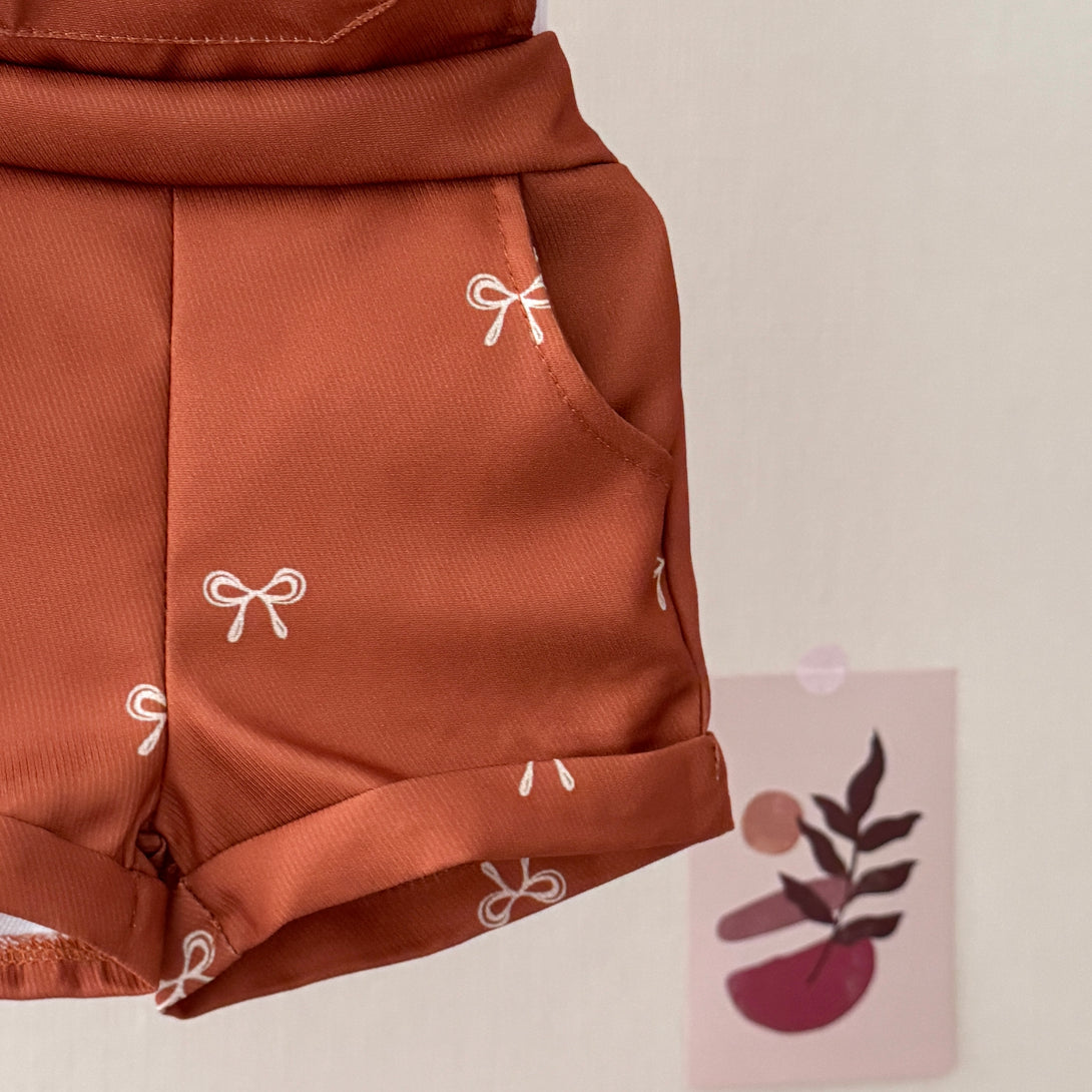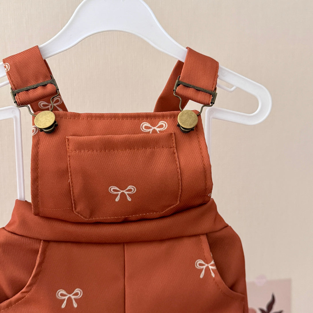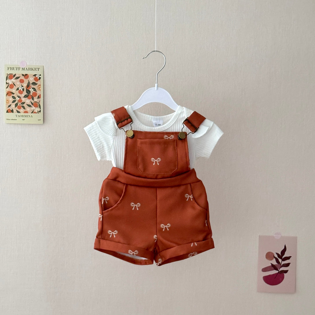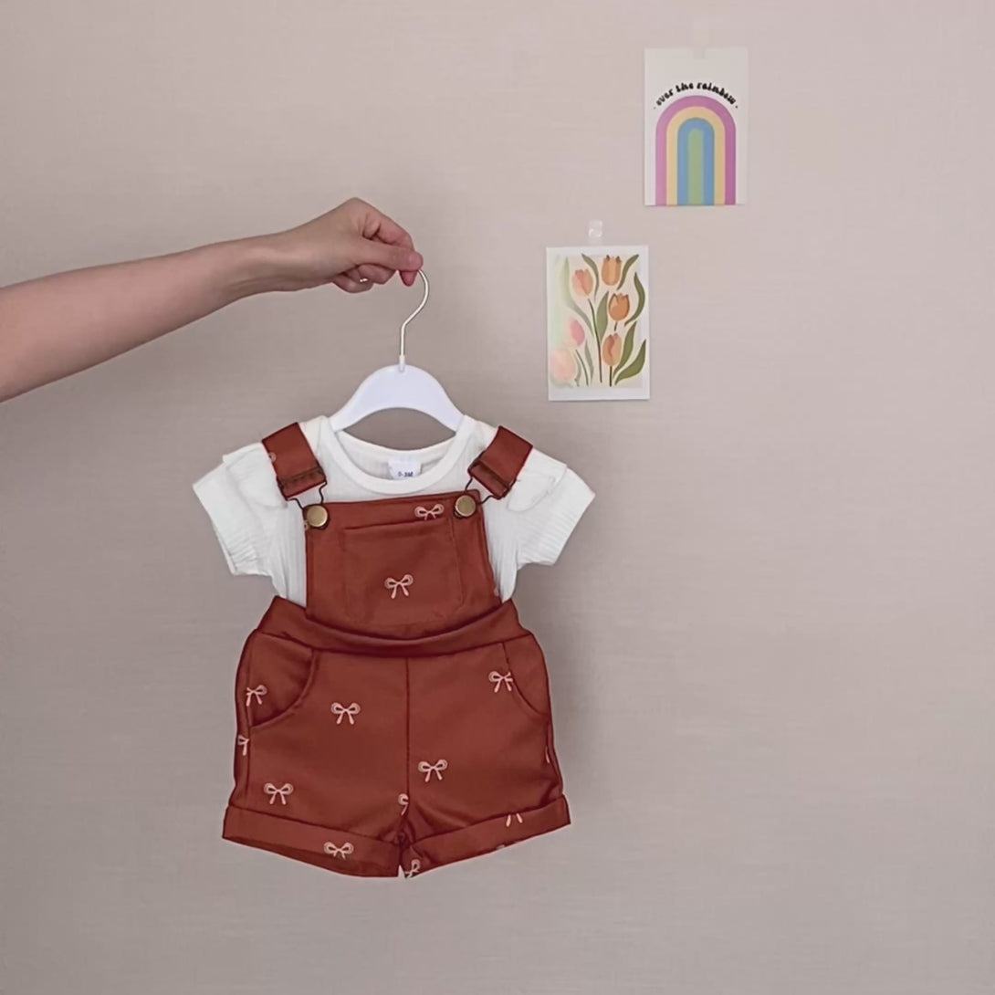 This baby outfit combines a white rib knit bodysuit with flutter sleeves and brown colored overalls. The overalls have adjustable straps, bow patterns, and cuffed shorts. Made of soft, durable materials, perfect for any baby occasion.