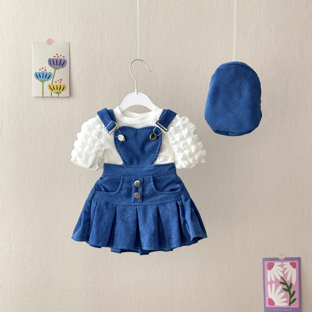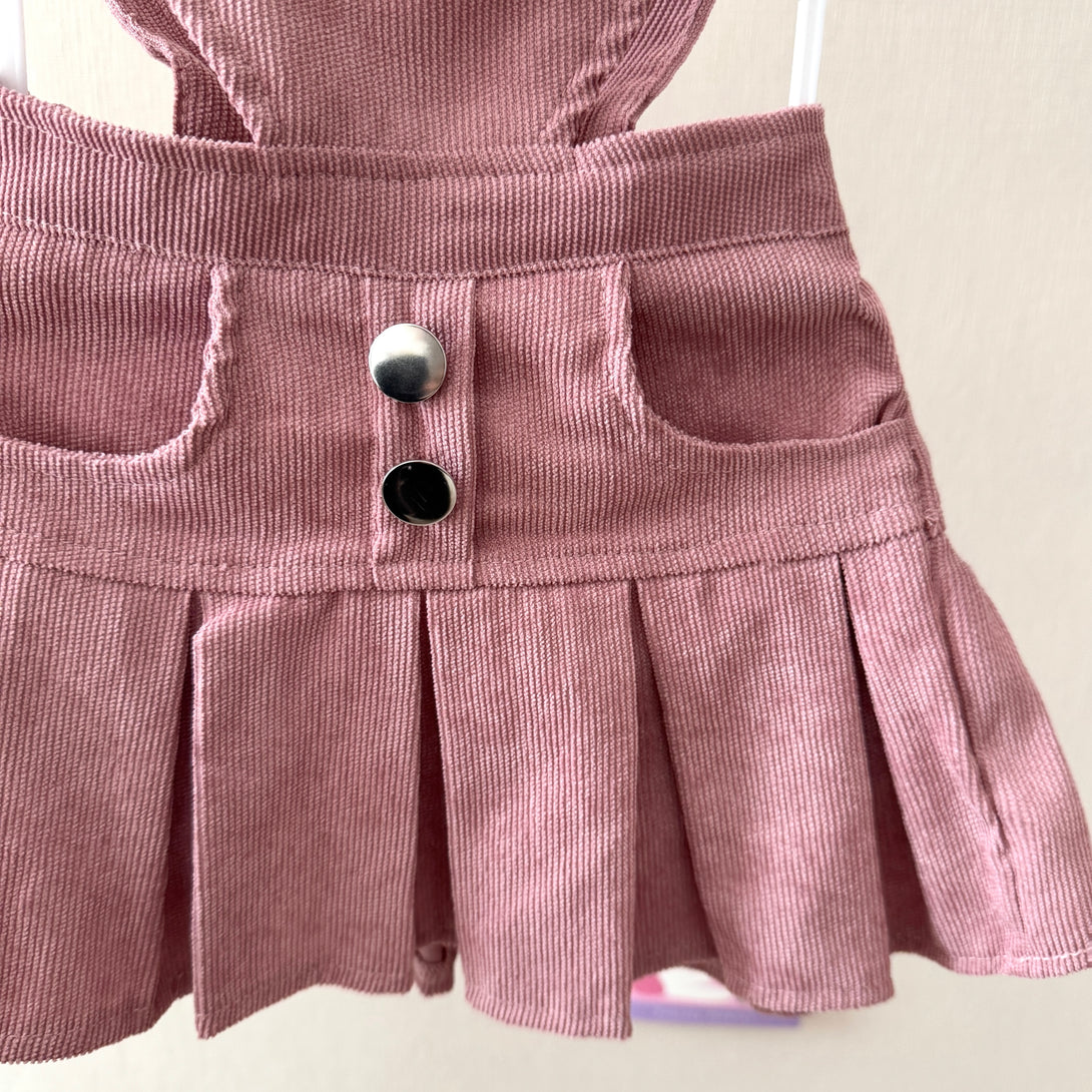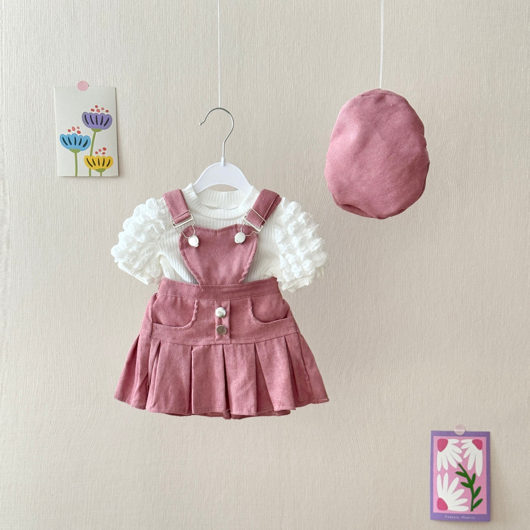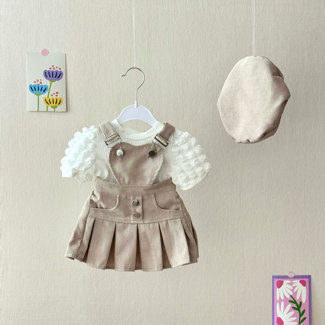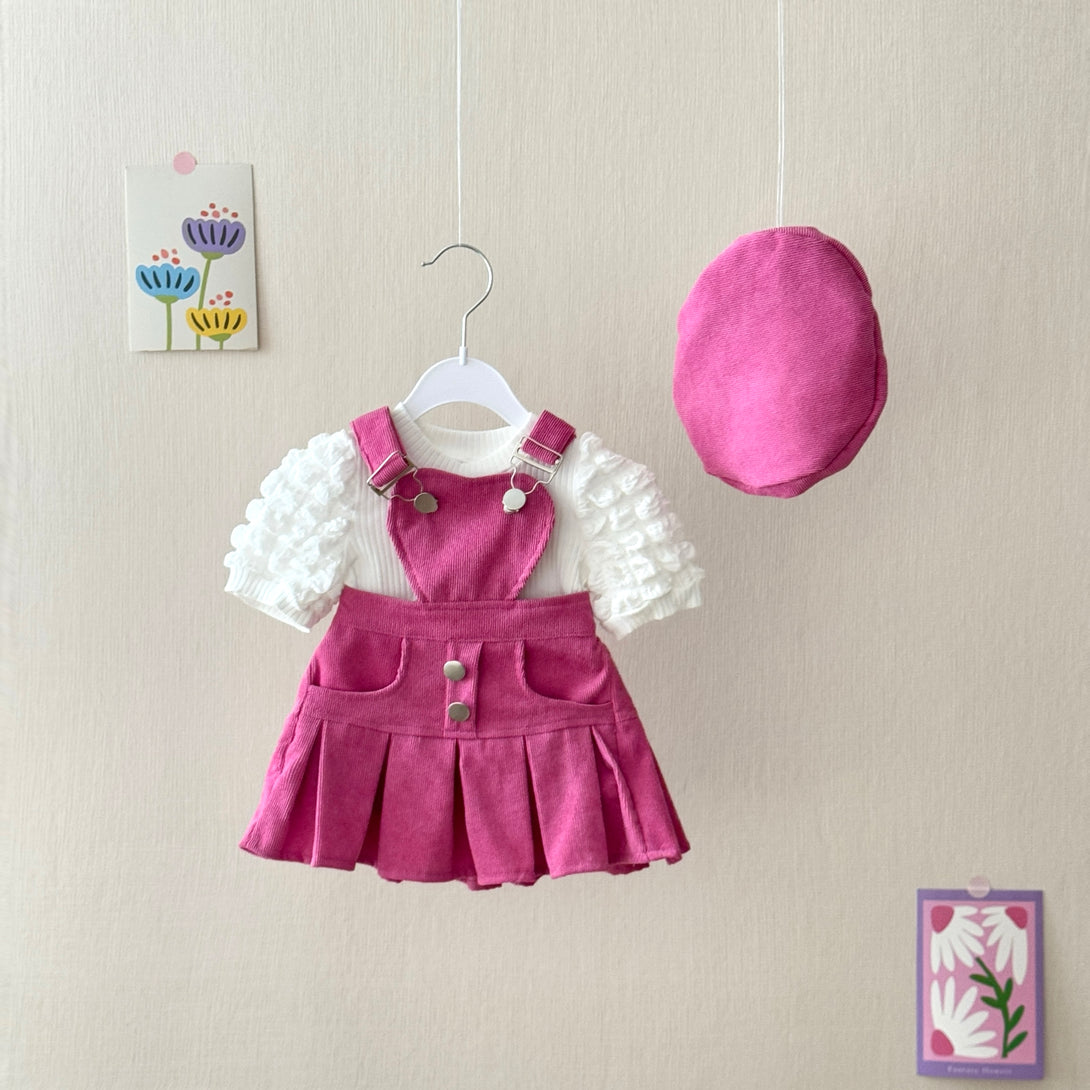 This set features a corduroy suspender dress with a pleated skirt, decorative buttons, and adjustable gold-tone buckle straps for a charming vintage look. The textured puff-sleeve top adds a soft and feminine touch, while the matching beret-style hat completes the ensemble with a chic flair. Available in blue, pink, rose red, and beige, this outfit is made from soft corduroy and breathable cotton, ensuring comfort and durability. Perfect for outings, parties, or casual days, it’s a must-have for your little fashionista!