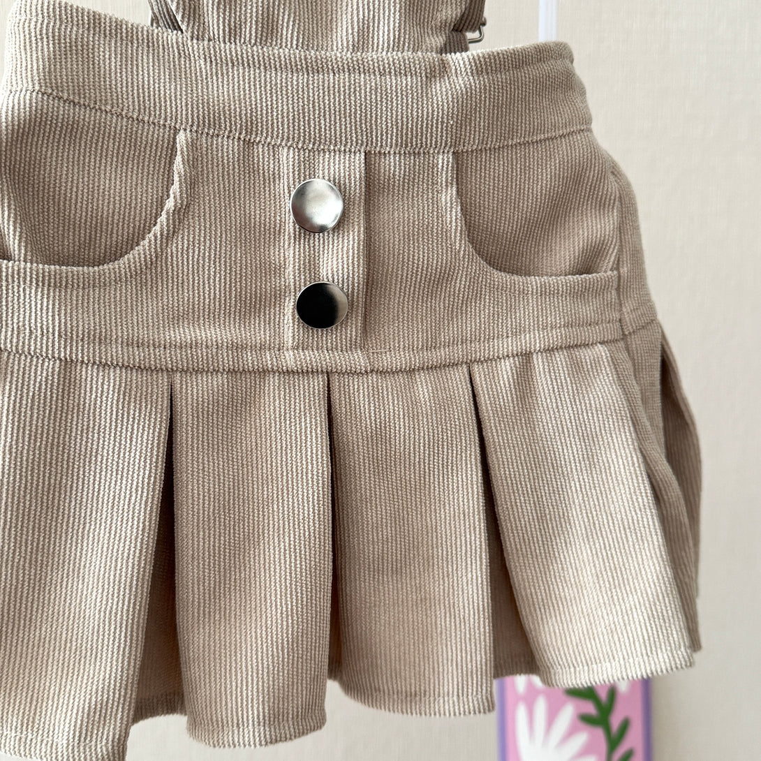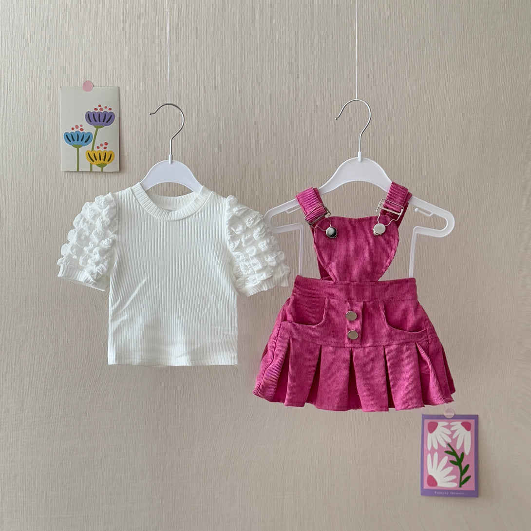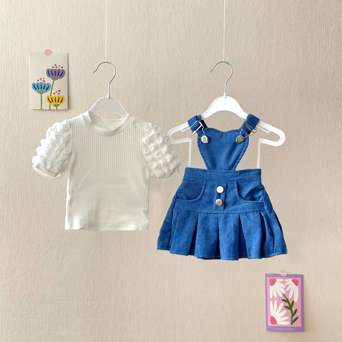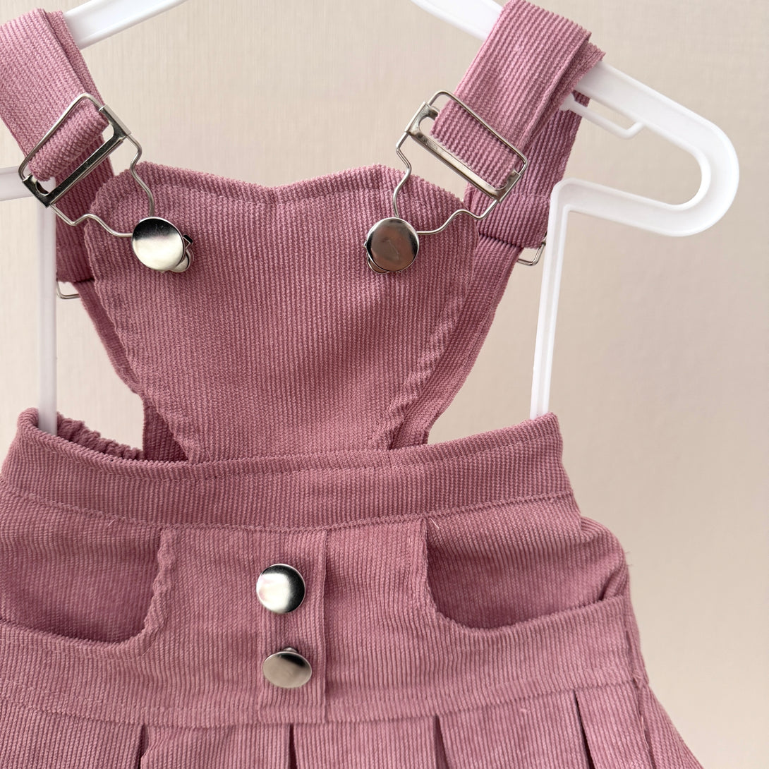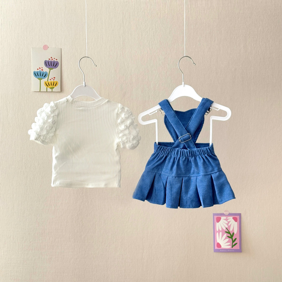This set features a corduroy suspender dress with a pleated skirt, decorative buttons, and adjustable gold-tone buckle straps for a charming vintage look. The textured puff-sleeve top adds a soft and feminine touch, while the matching beret-style hat completes the ensemble with a chic flair. Available in blue, pink, rose red, and beige, this outfit is made from soft corduroy and breathable cotton, ensuring comfort and durability. Perfect for outings, parties, or casual days, it’s a must-have for your little fashionista!