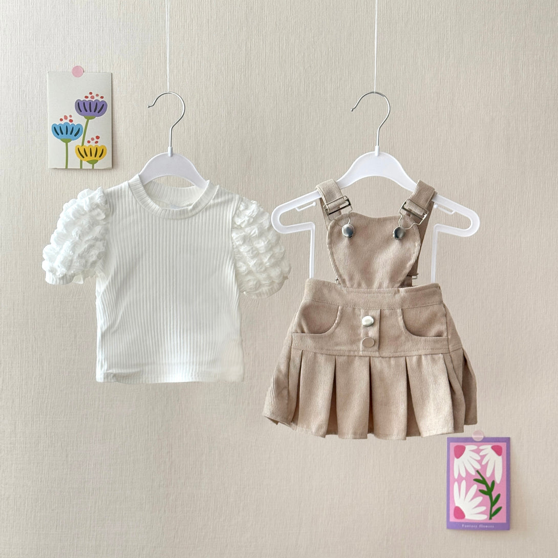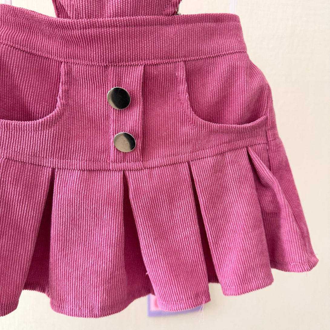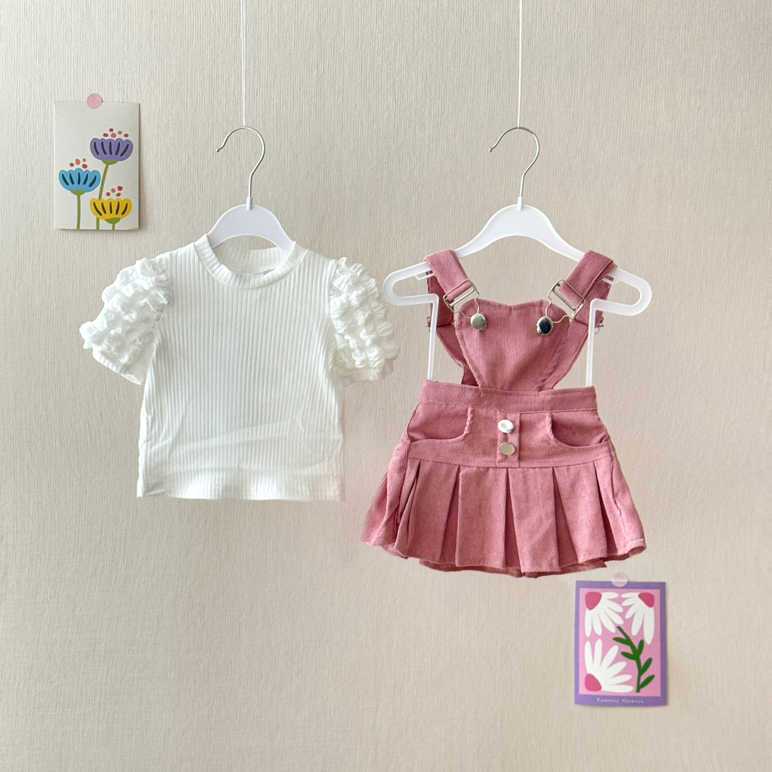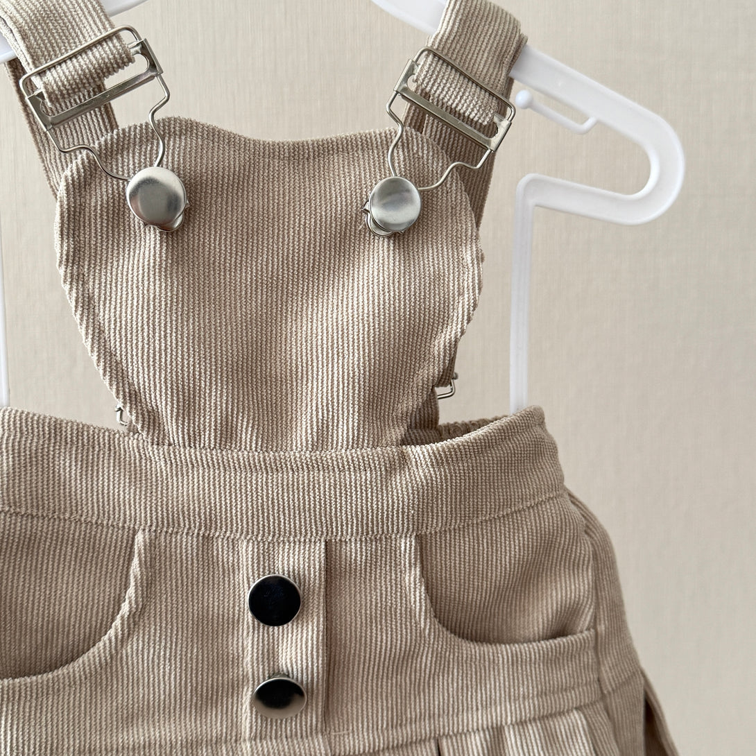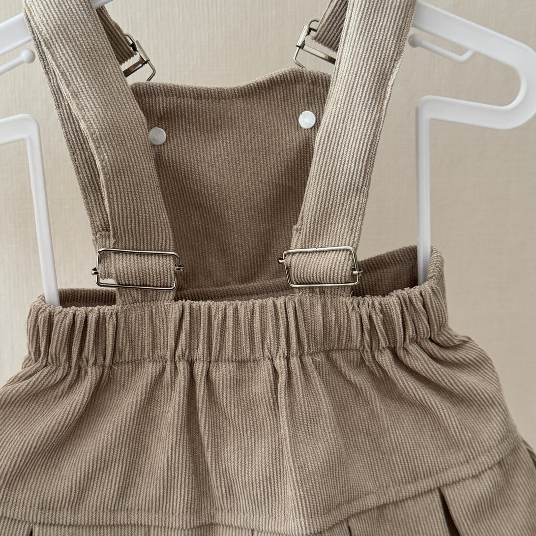This set features a corduroy suspender dress with a pleated skirt, decorative buttons, and adjustable gold-tone buckle straps for a charming vintage look. The textured puff-sleeve top adds a soft and feminine touch, while the matching beret-style hat completes the ensemble with a chic flair. Available in blue, pink, rose red, and beige, this outfit is made from soft corduroy and breathable cotton, ensuring comfort and durability. Perfect for outings, parties, or casual days, it’s a must-have for your little fashionista!