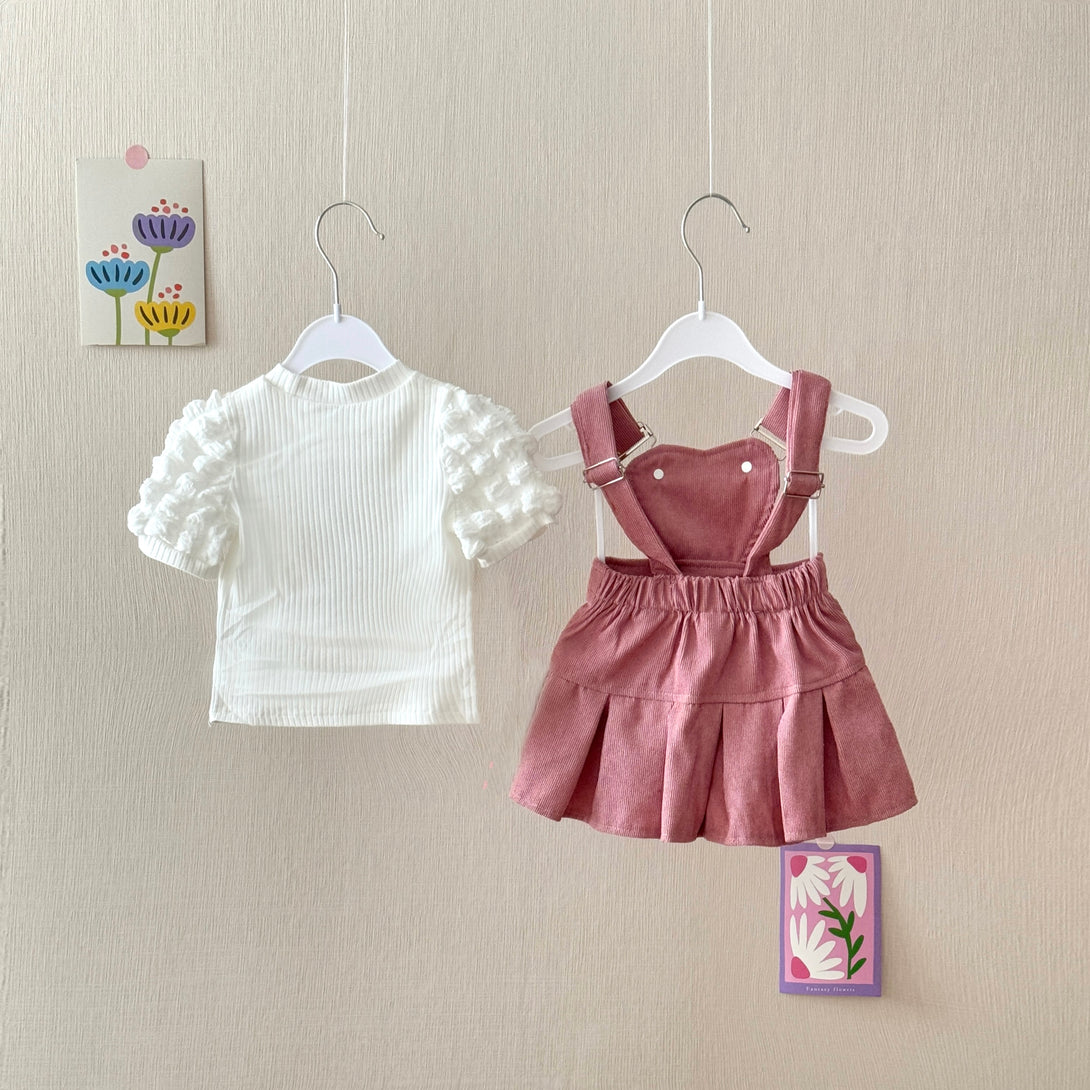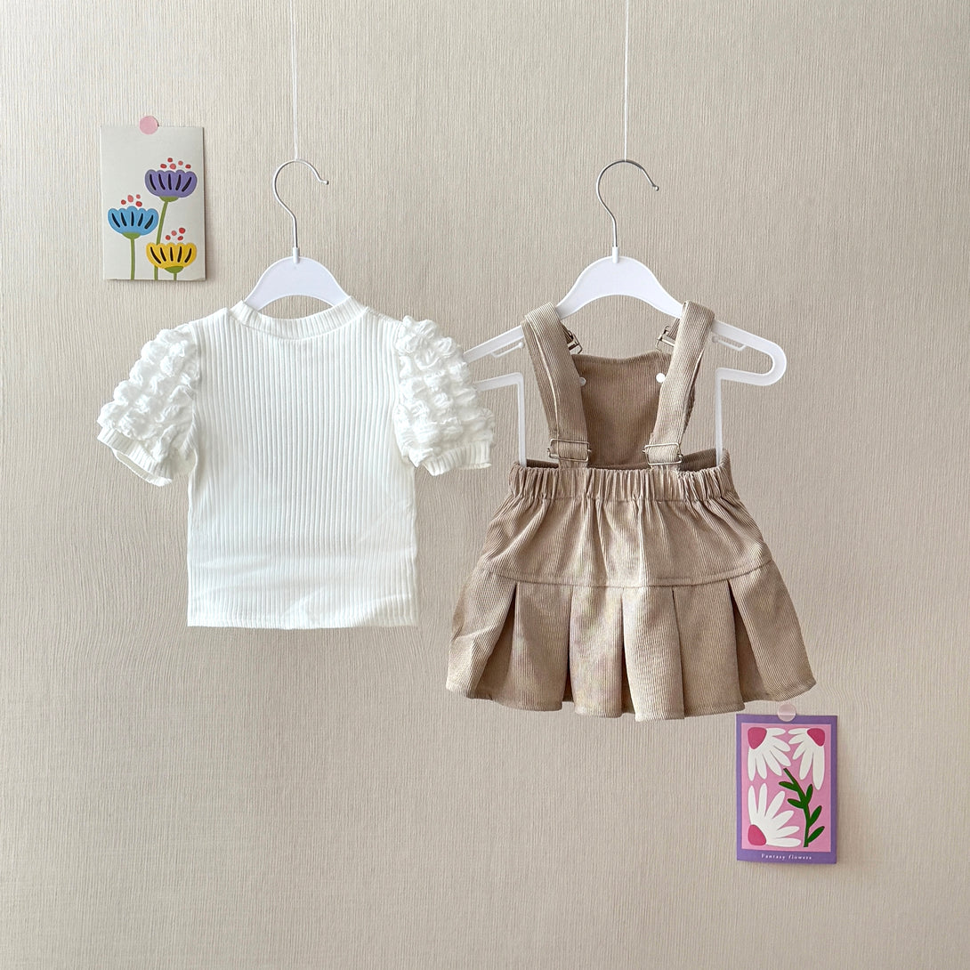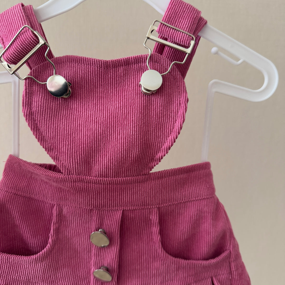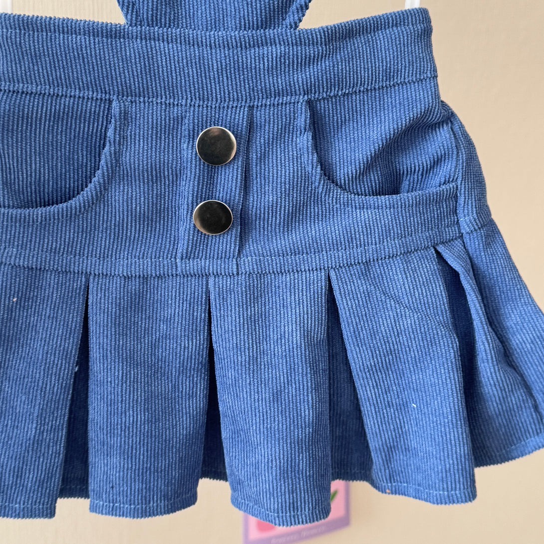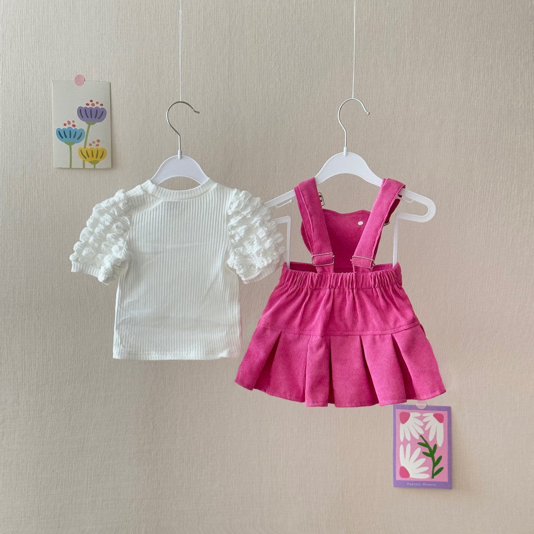This set features a corduroy suspender dress with a pleated skirt, decorative buttons, and adjustable gold-tone buckle straps for a charming vintage look. The textured puff-sleeve top adds a soft and feminine touch, while the matching beret-style hat completes the ensemble with a chic flair. Available in blue, pink, rose red, and beige, this outfit is made from soft corduroy and breathable cotton, ensuring comfort and durability. Perfect for outings, parties, or casual days, it’s a must-have for your little fashionista!