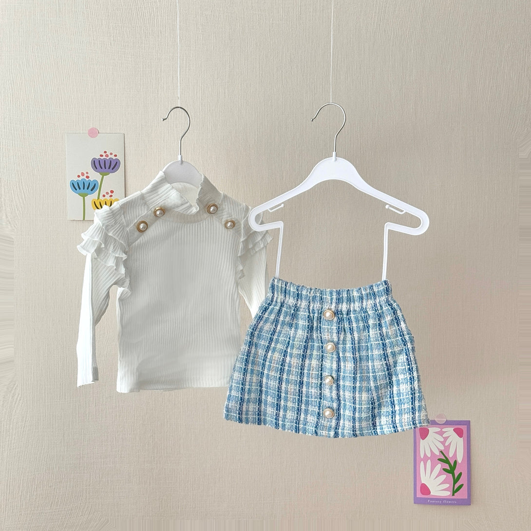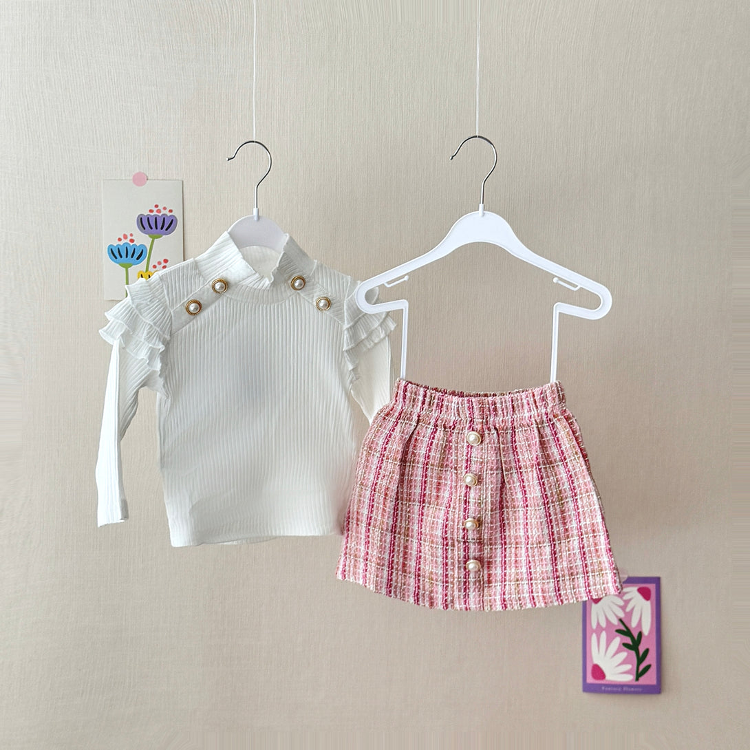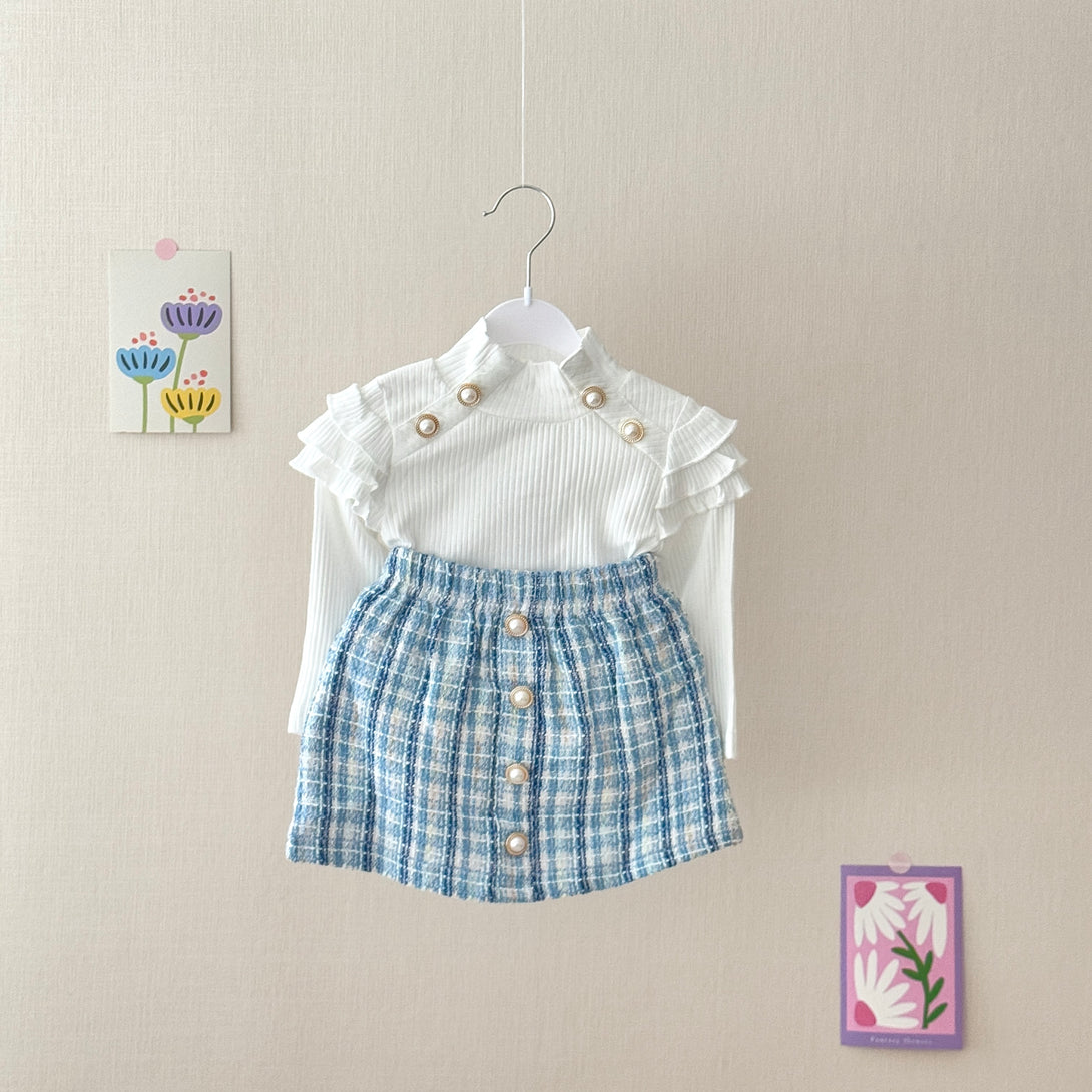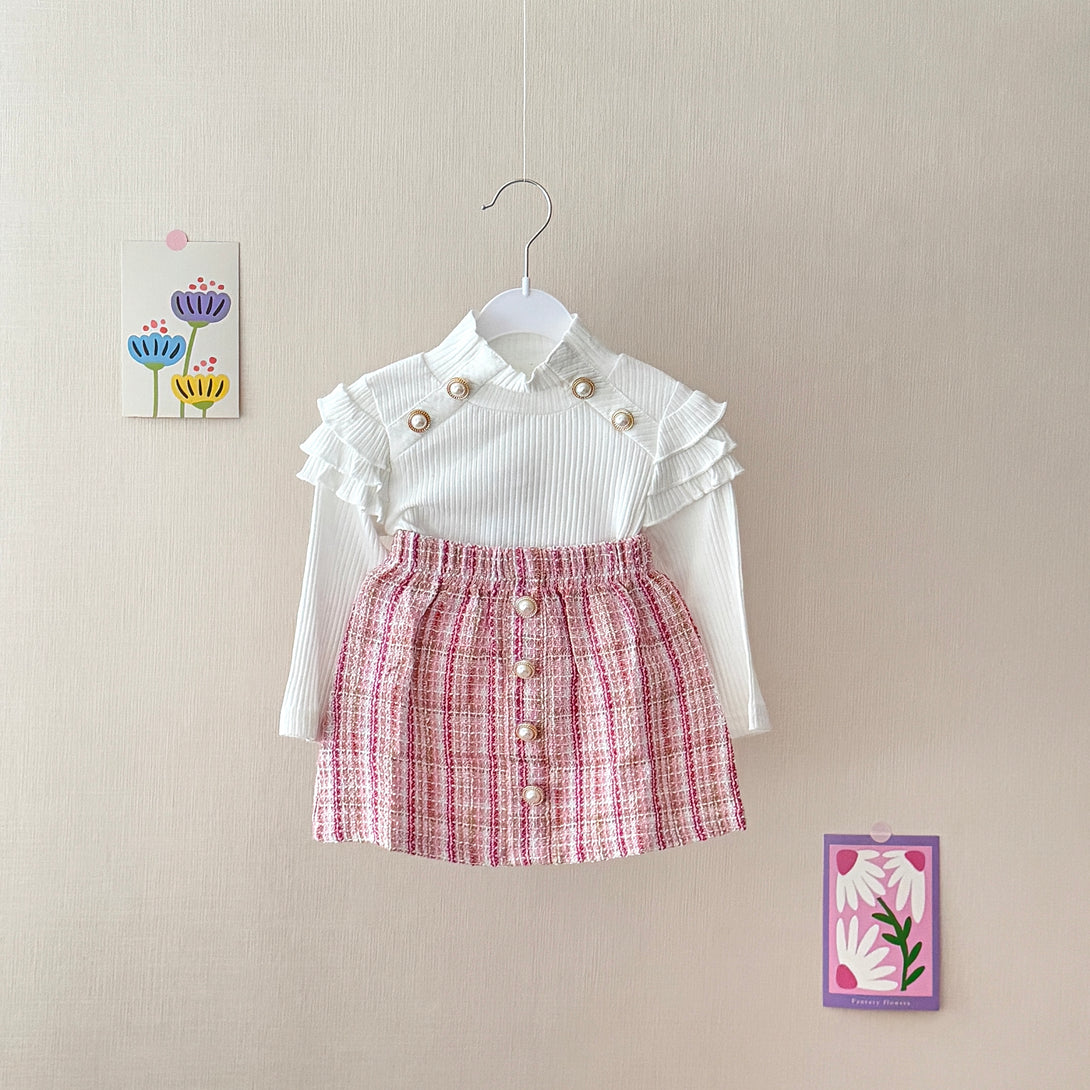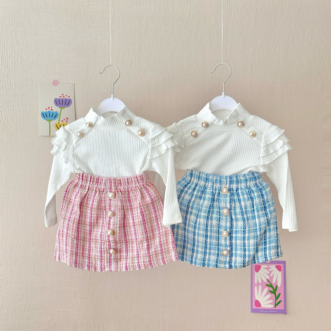 This charming set features a white ribbed long-sleeve top with ruffle detailing on the shoulders, adorned with elegant pearl buttons. The fabric of the top is soft and stretchy, making it comfortable to wear. Paired with it is a tweed knit plaid skirt with a row of pearl buttons down the front. It is a perfect choice for a stylish and sophisticated look.