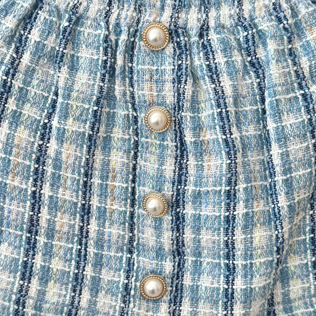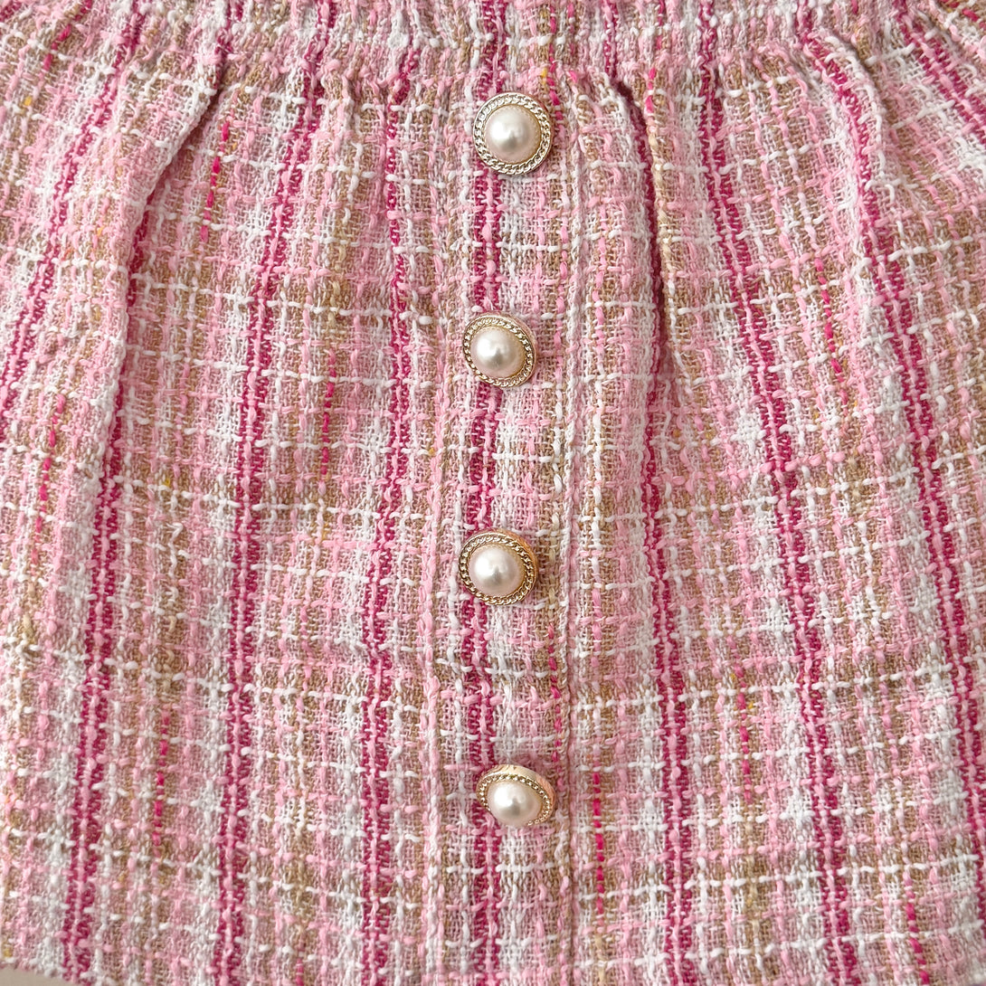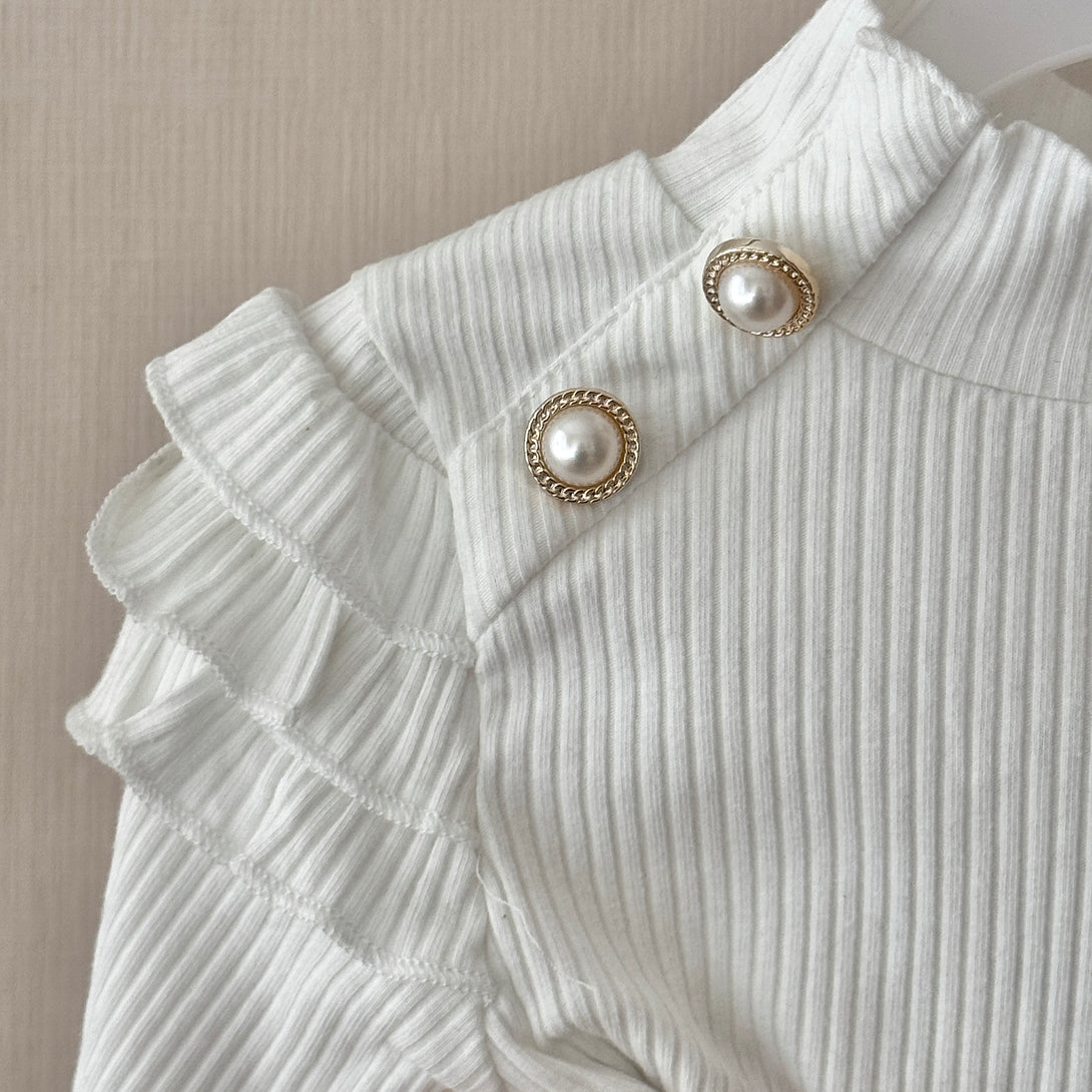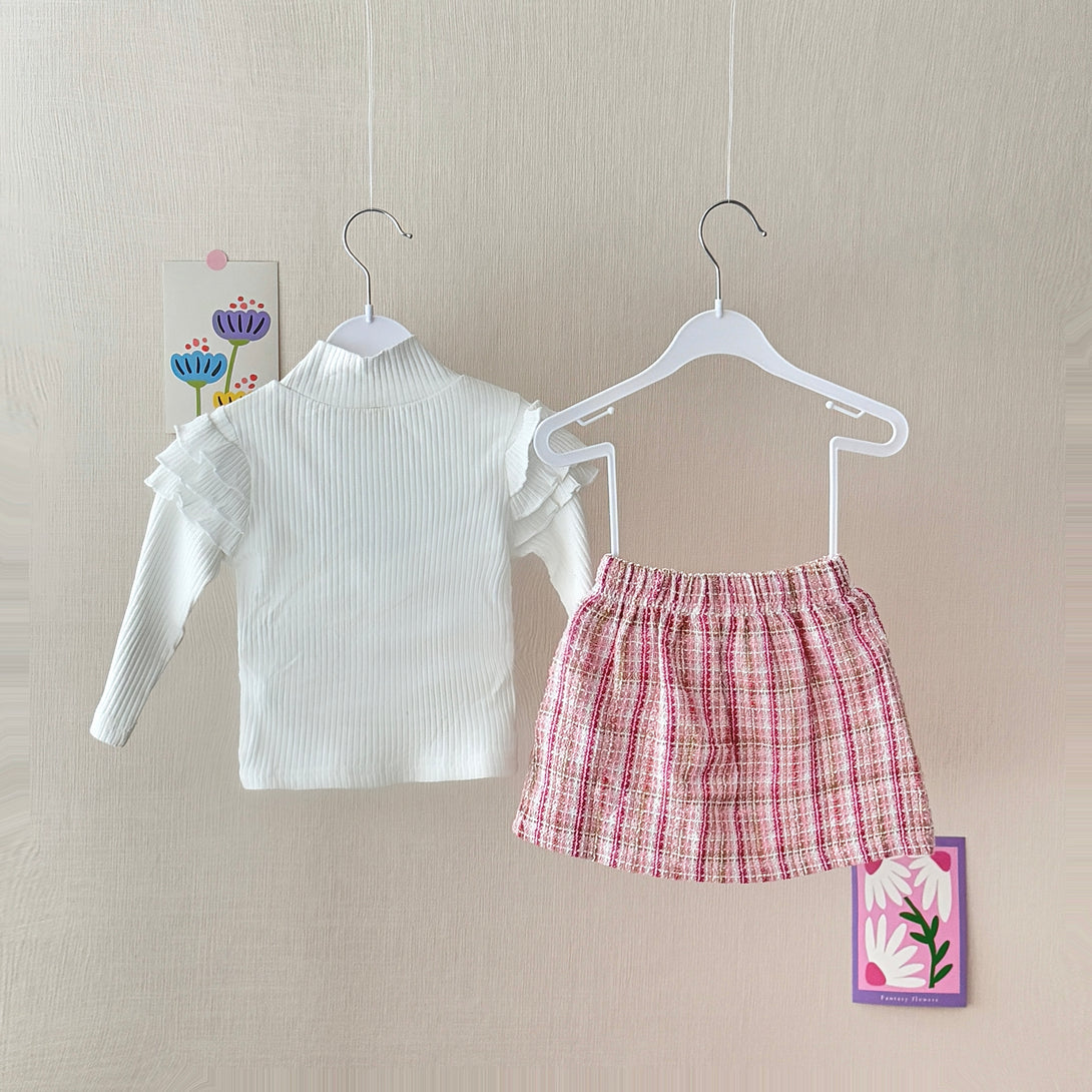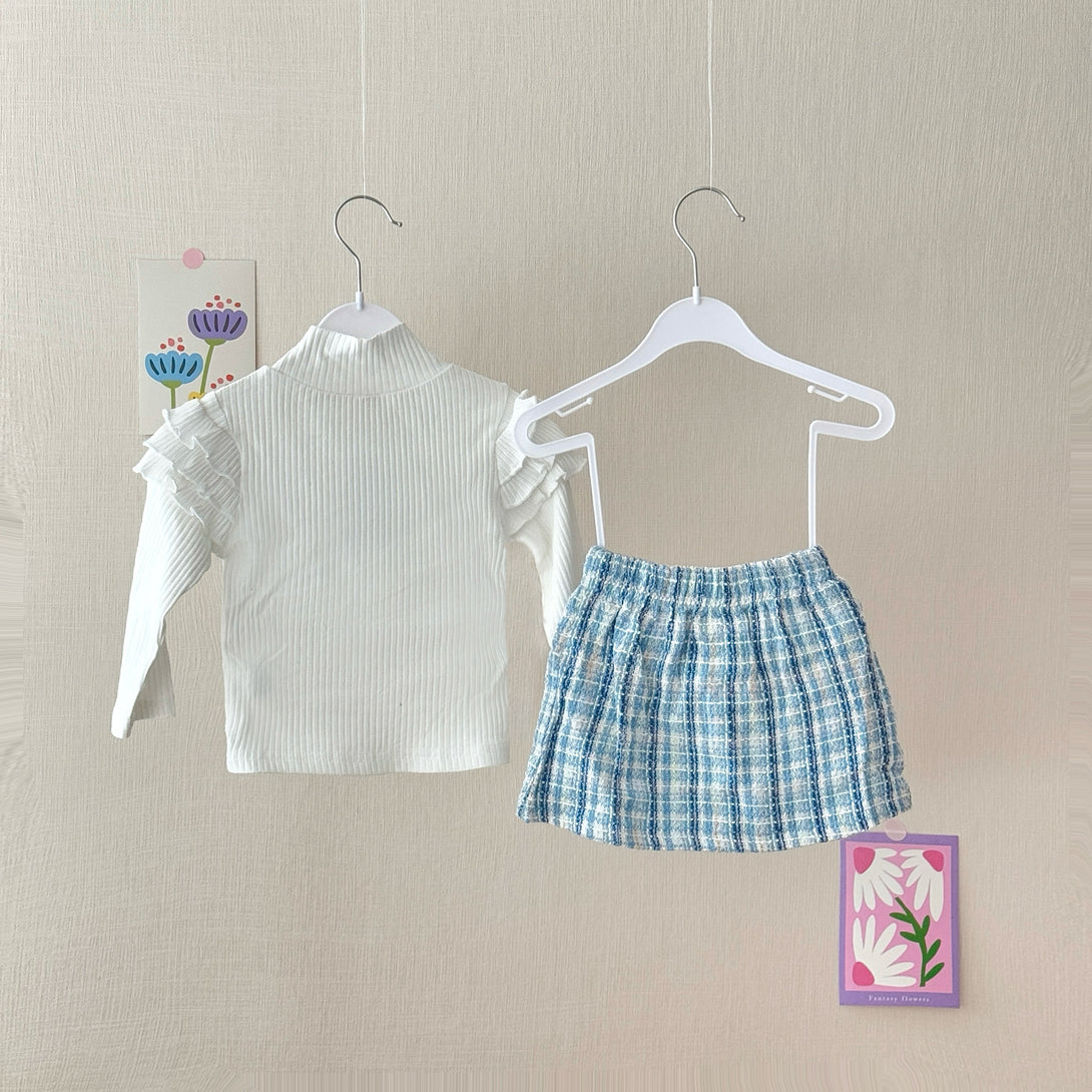 This charming set features a white ribbed long-sleeve top with ruffle detailing on the shoulders, adorned with elegant pearl buttons. The fabric of the top is soft and stretchy, making it comfortable to wear. Paired with it is a tweed knit plaid skirt with a row of pearl buttons down the front. It is a perfect choice for a stylish and sophisticated look.