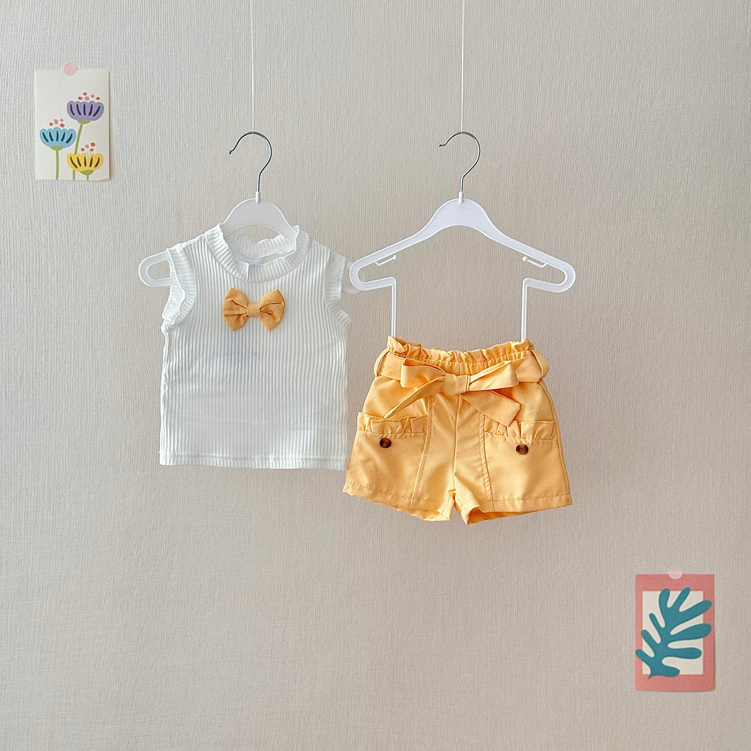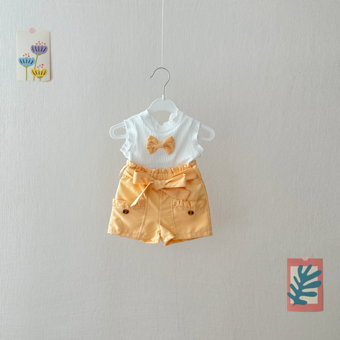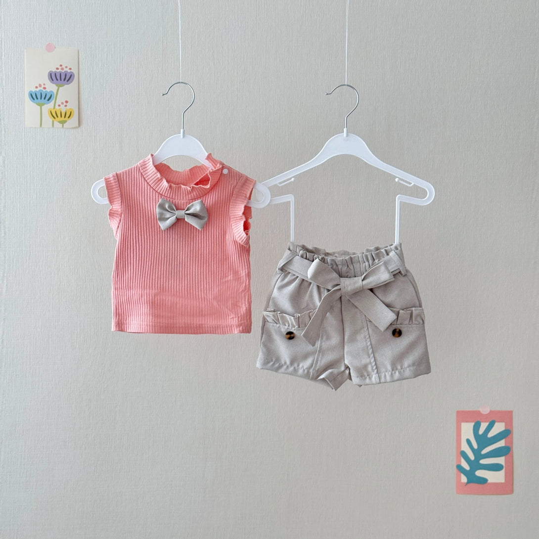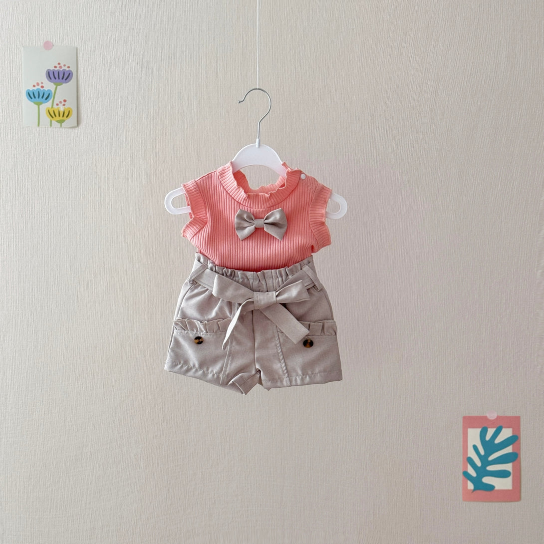 The sleeveless tops feature a ribbed texture, giving them a snug and stretchy fit. Each top is embellished with a cute bow at the front, adding a touch of sweetness. The shorts have a wide - waistband with a large, decorative bow that not only enhances the aesthetic but also allows for an adjustable fit. The shorts also include ruffled pockets with button details, which are both functional and stylish. Made from soft and breathable fabrics, these sets are ideal for active little ones, ensuring they stay comfortable while looking adorable.