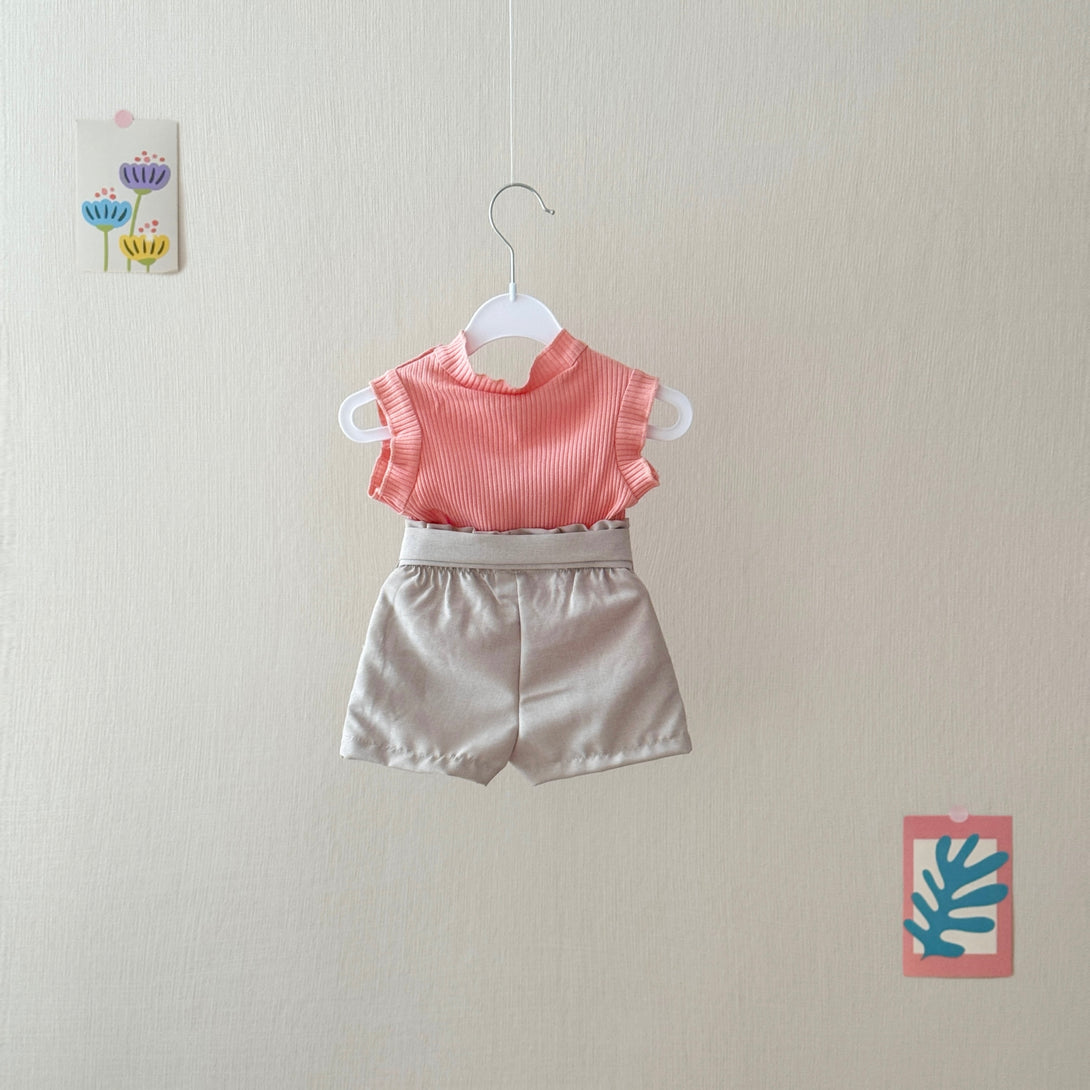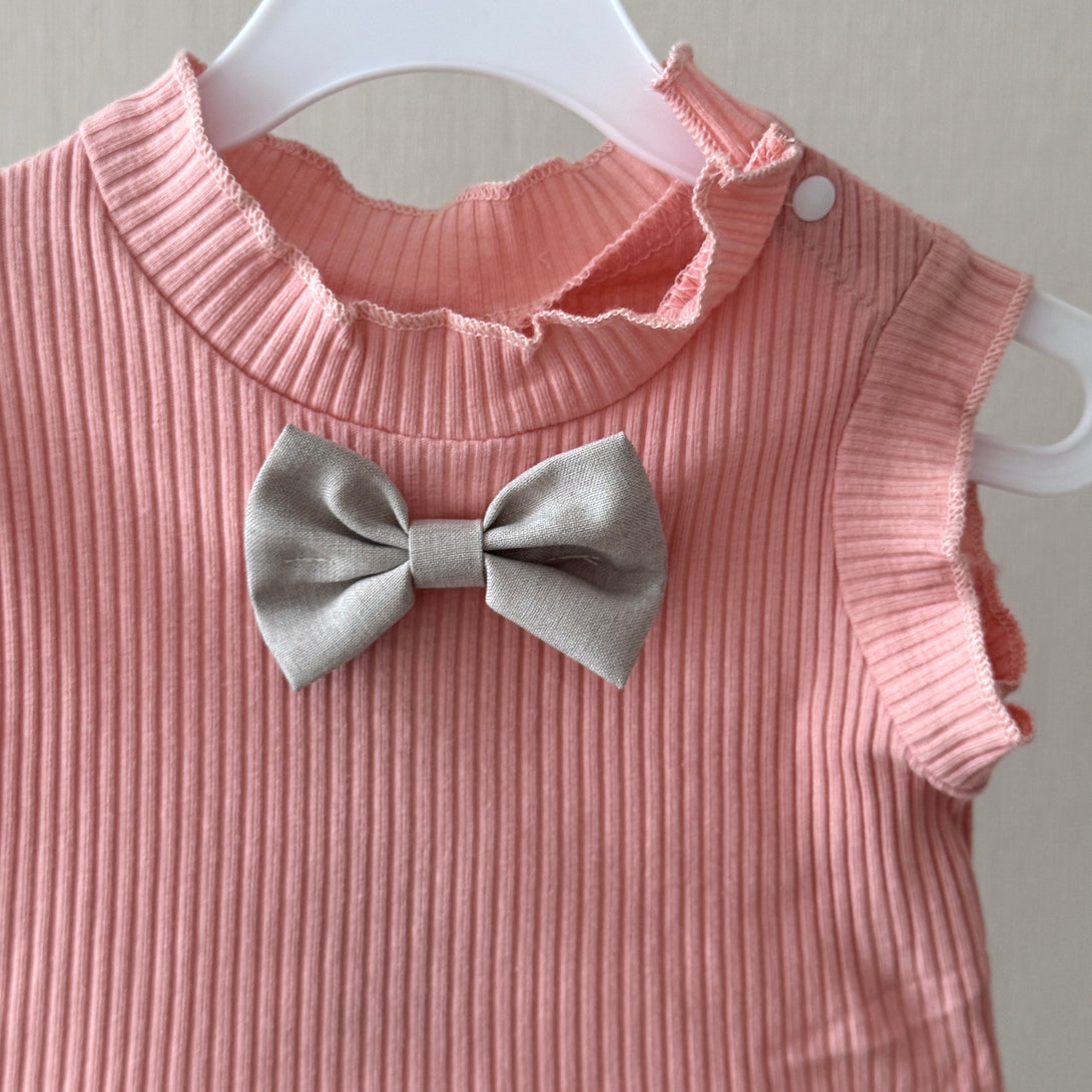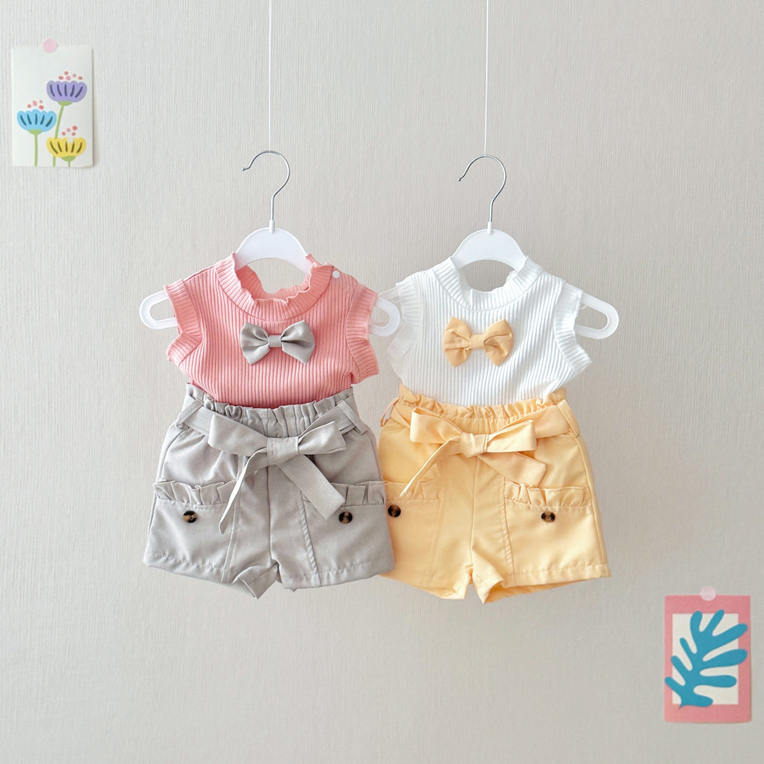 The sleeveless tops feature a ribbed texture, giving them a snug and stretchy fit. Each top is embellished with a cute bow at the front, adding a touch of sweetness. The shorts have a wide - waistband with a large, decorative bow that not only enhances the aesthetic but also allows for an adjustable fit. The shorts also include ruffled pockets with button details, which are both functional and stylish. Made from soft and breathable fabrics, these sets are ideal for active little ones, ensuring they stay comfortable while looking adorable.