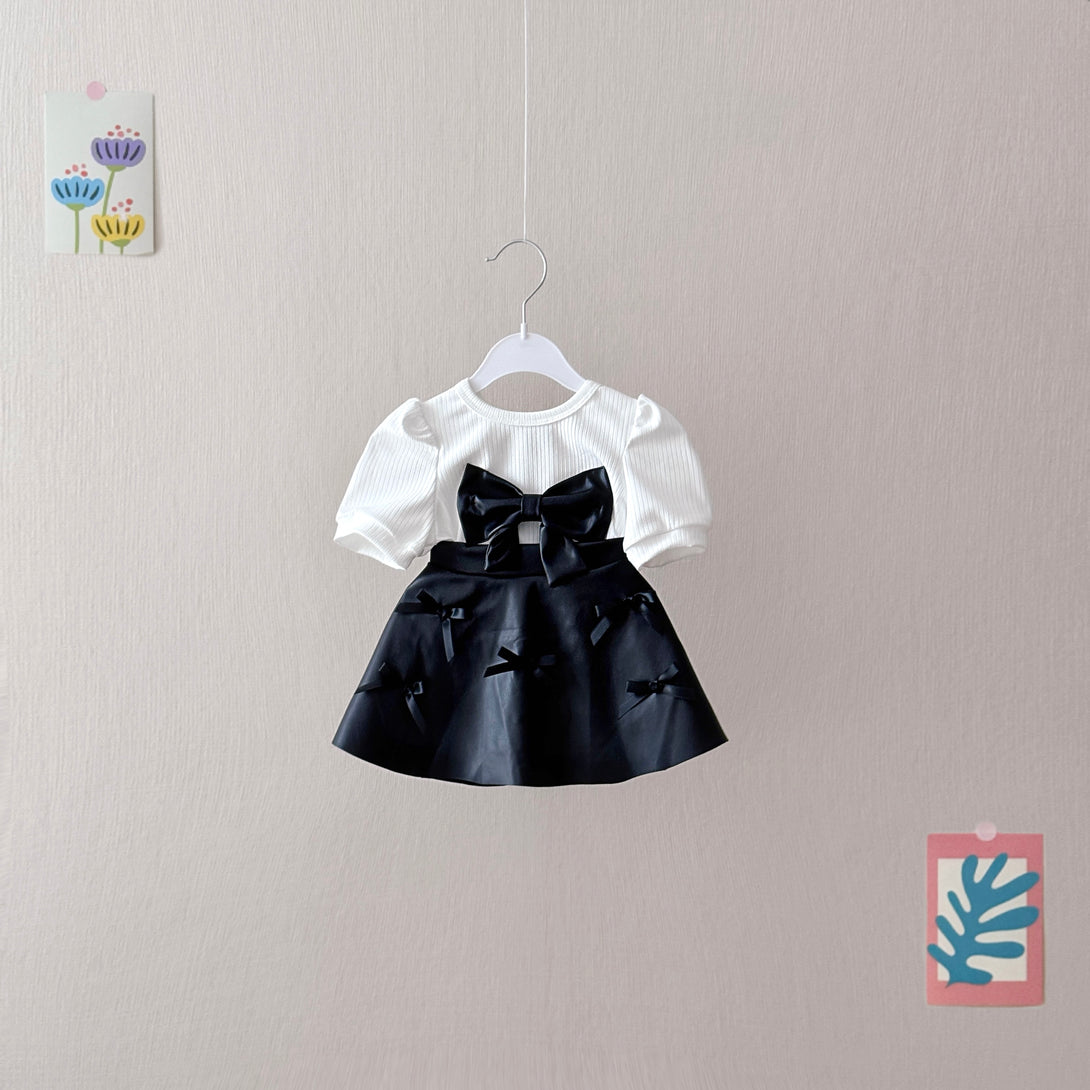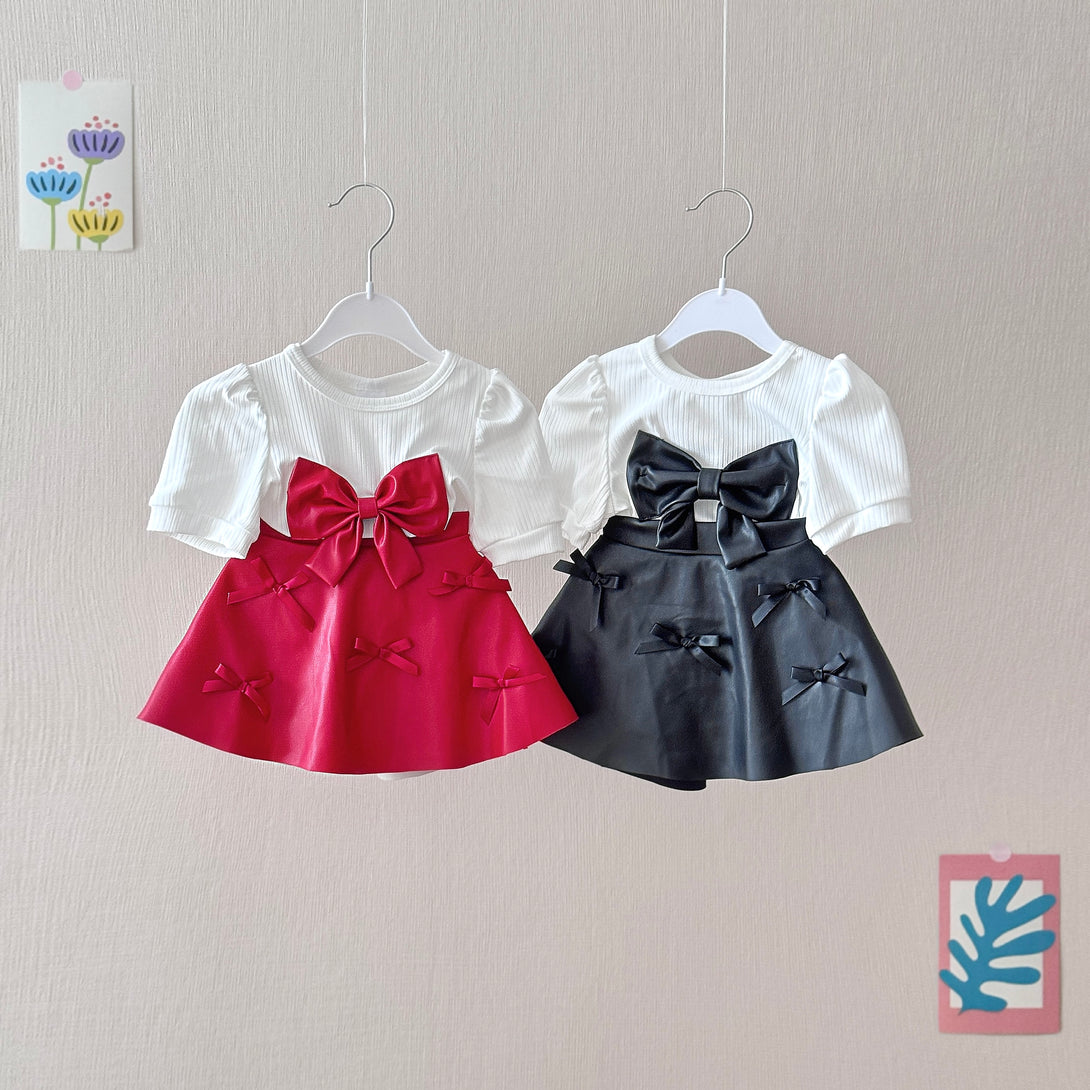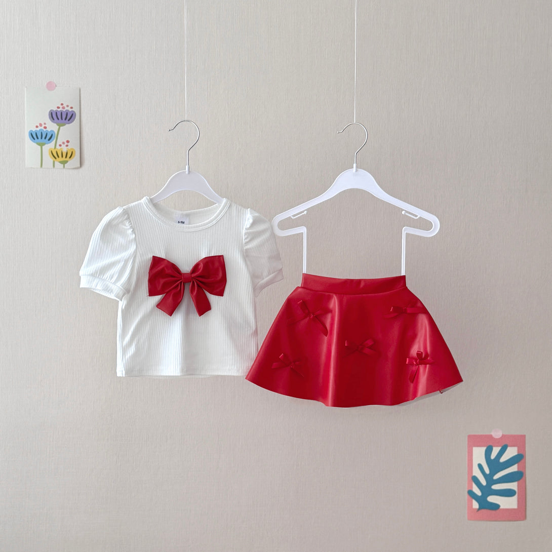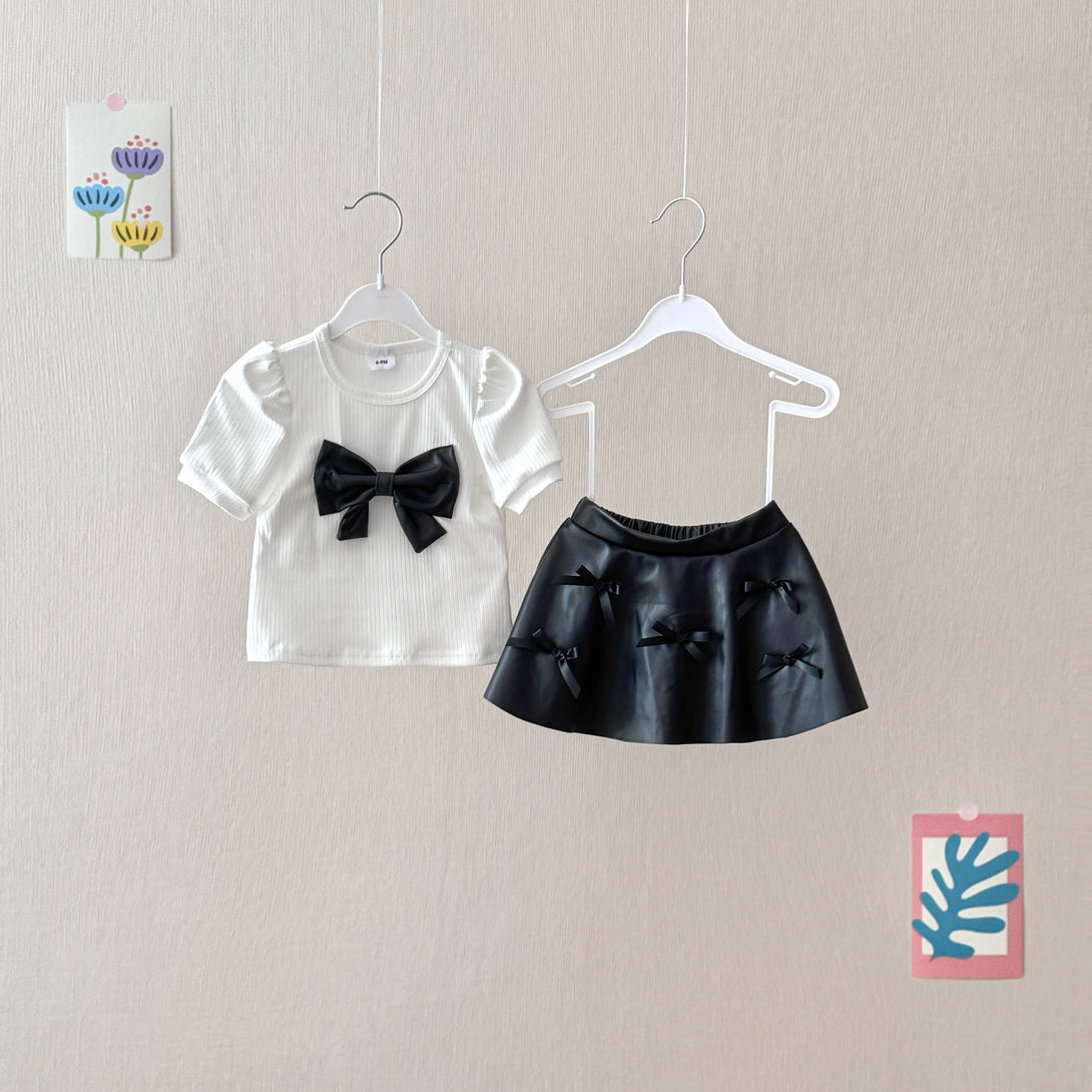 This eye - catching set combines a short sleeved t-shirt featuring a large bow graphic. The shirt is made from a soft, breathable cotton fabric for comfort. Paired with it is a leather skirt, which has a flared design and is adorned with multiple small bows, adding a charming and trendy touch. Ideal for creating a fashionable and cute look for young fashion enthusiasts.