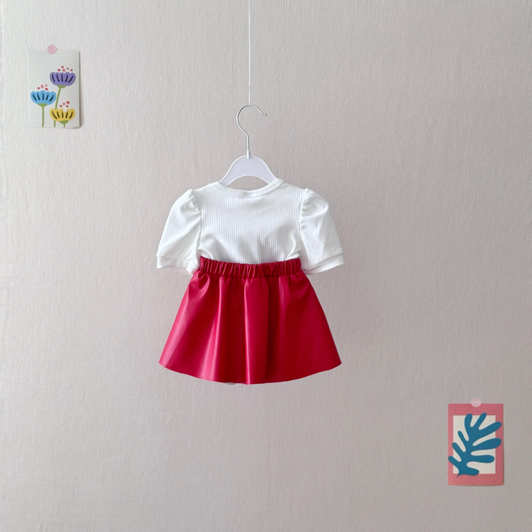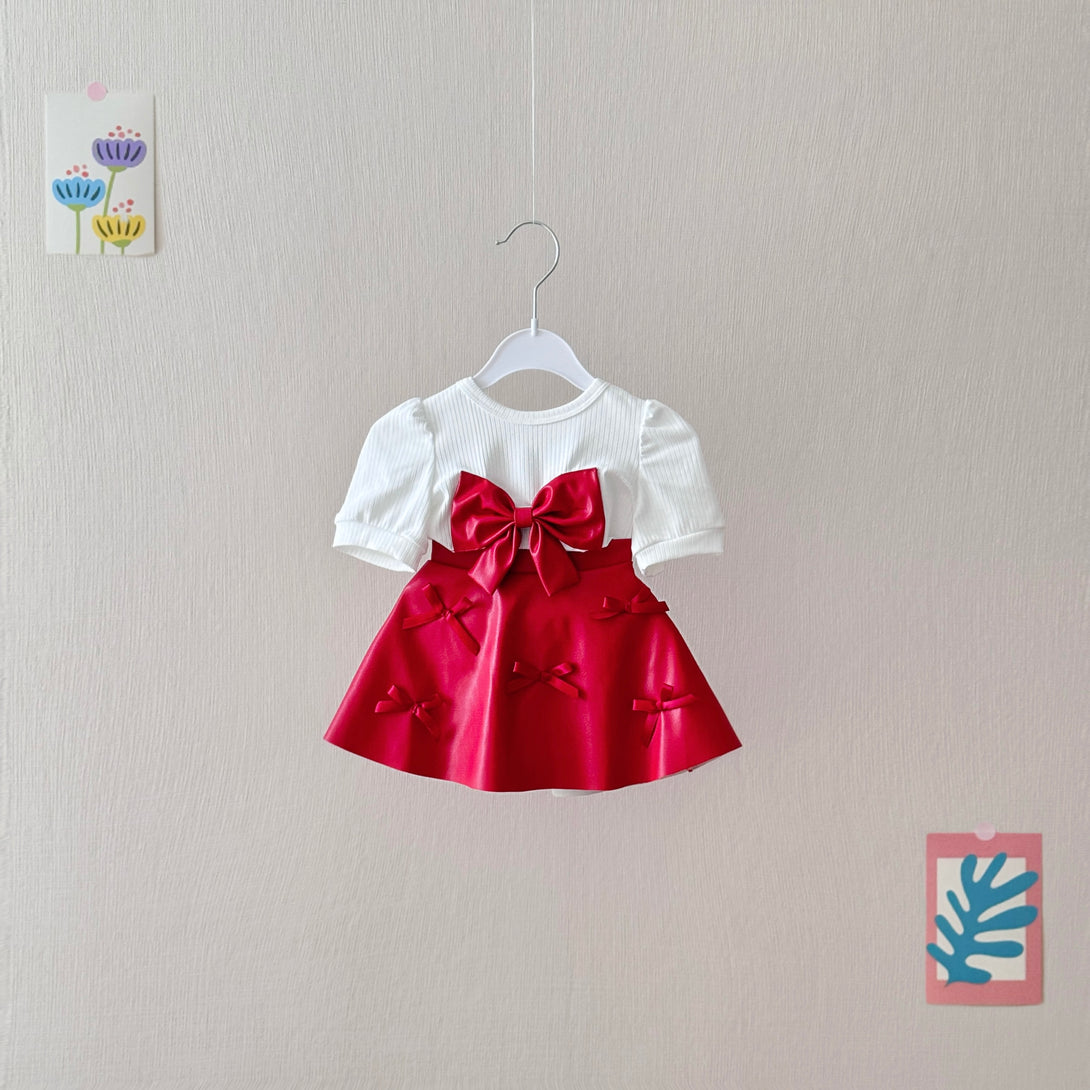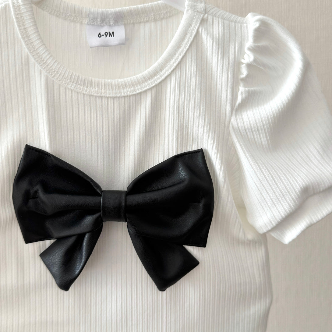 This eye - catching set combines a short sleeved t-shirt featuring a large bow graphic. The shirt is made from a soft, breathable cotton fabric for comfort. Paired with it is a leather skirt, which has a flared design and is adorned with multiple small bows, adding a charming and trendy touch. Ideal for creating a fashionable and cute look for young fashion enthusiasts.