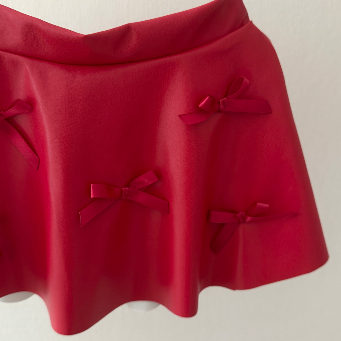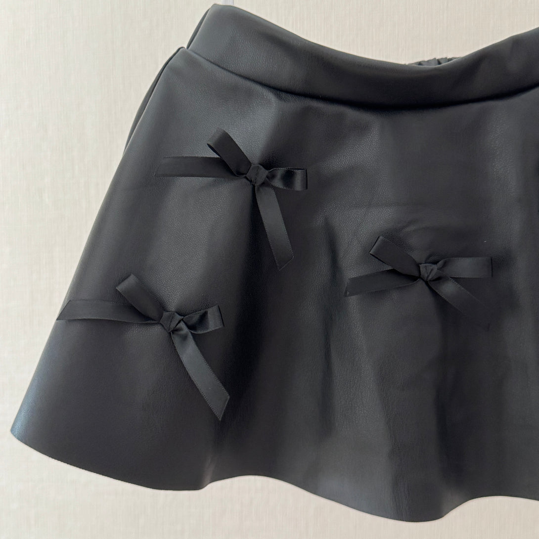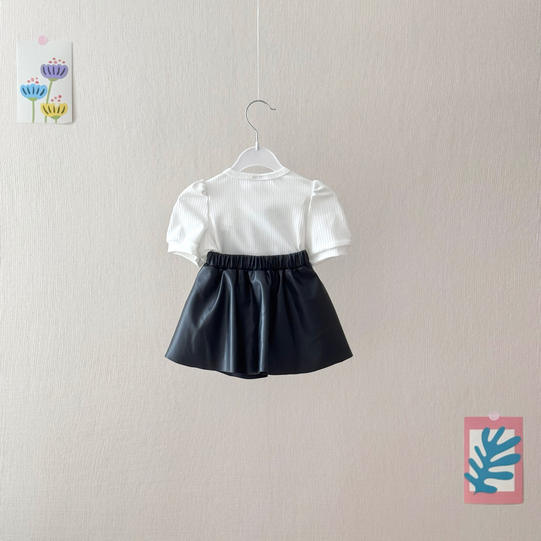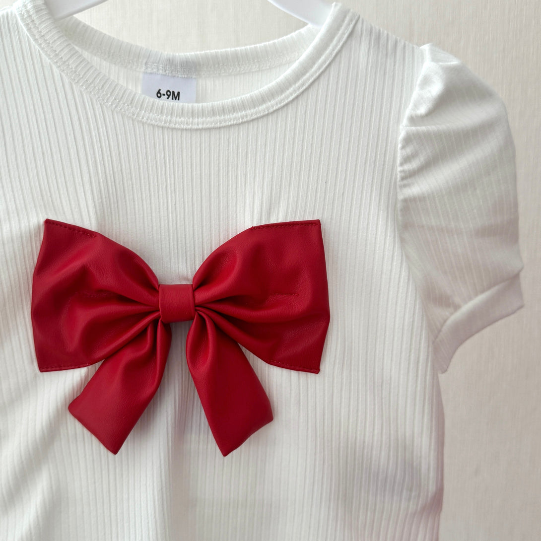 This eye - catching set combines a short sleeved t-shirt featuring a large bow graphic. The shirt is made from a soft, breathable cotton fabric for comfort. Paired with it is a leather skirt, which has a flared design and is adorned with multiple small bows, adding a charming and trendy touch. Ideal for creating a fashionable and cute look for young fashion enthusiasts.