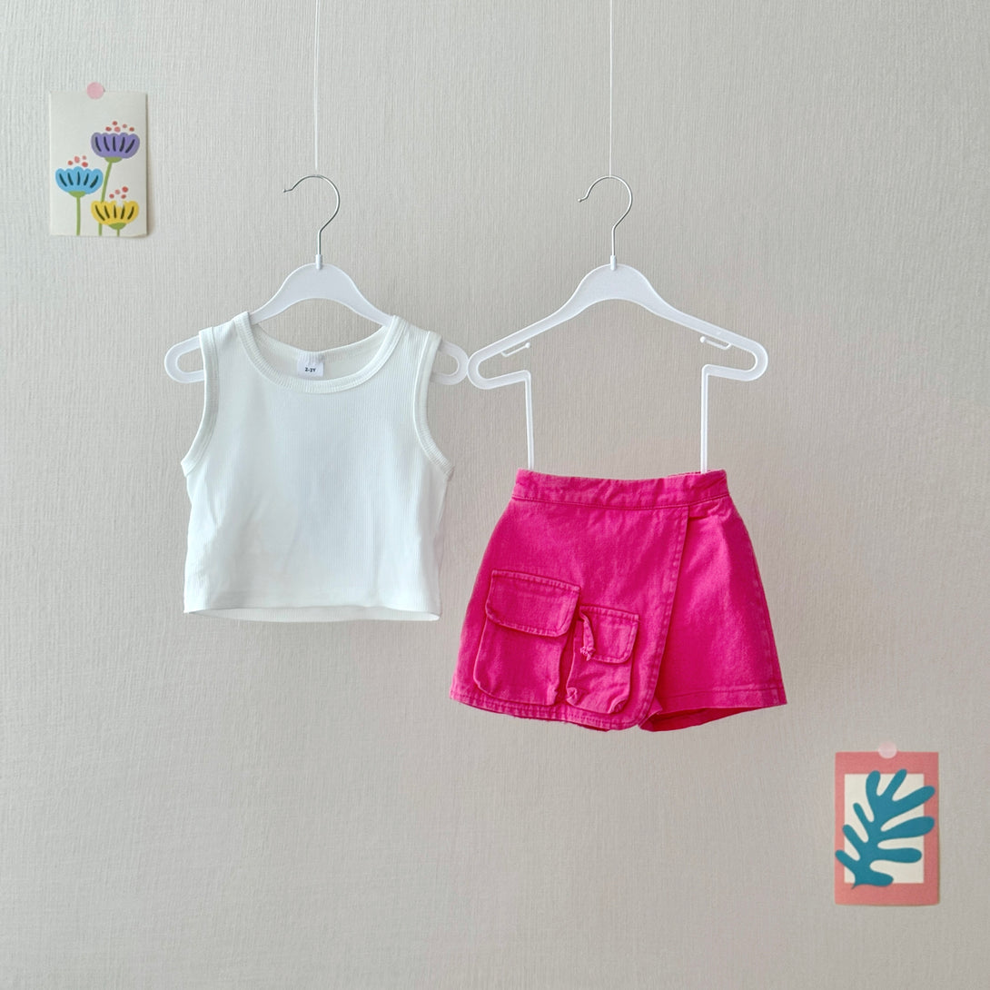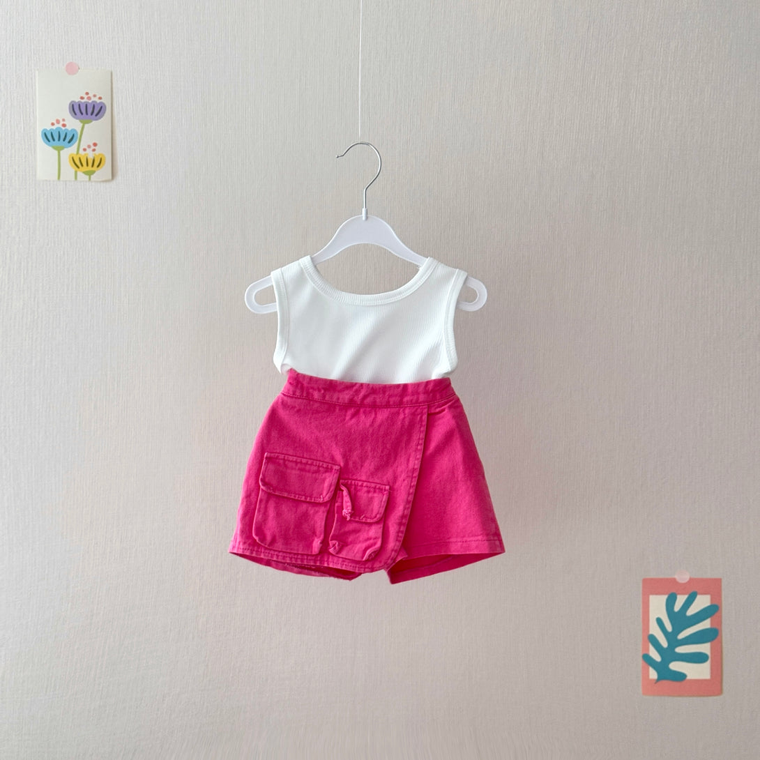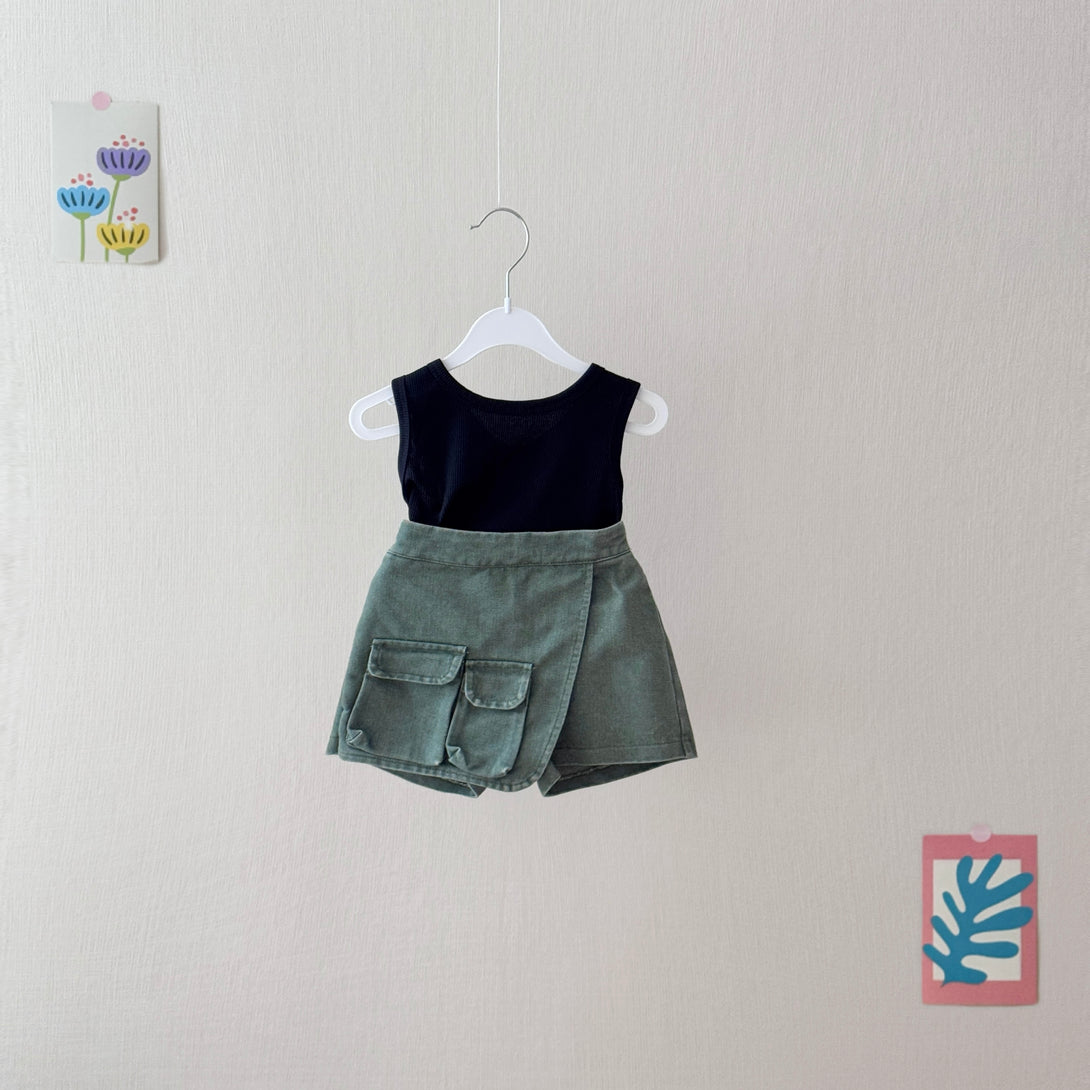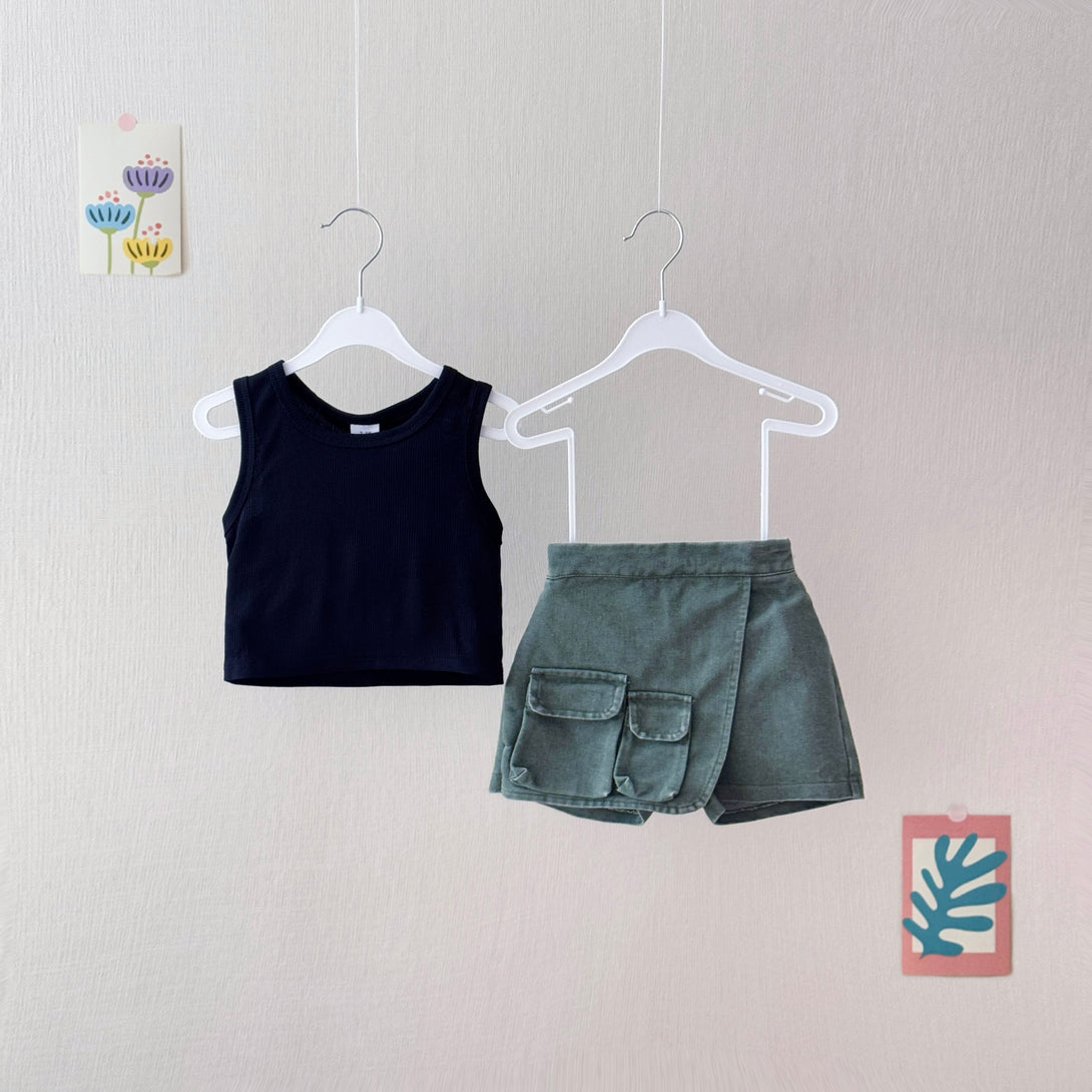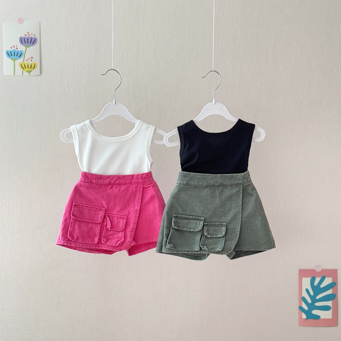 This set is a combination of a simple sleeveless top and a denim wrap skirt (pink and army green). The top is made of soft and breathable fabric, which makes it comfortable to wear. The shorts have a unique wrap design and two practical front pockets, giving babies a stylish and casual look, perfect for everyday wear.
