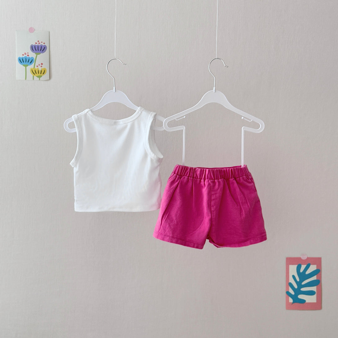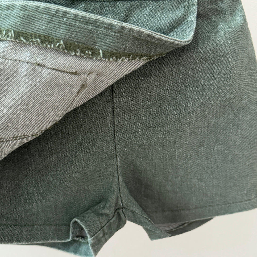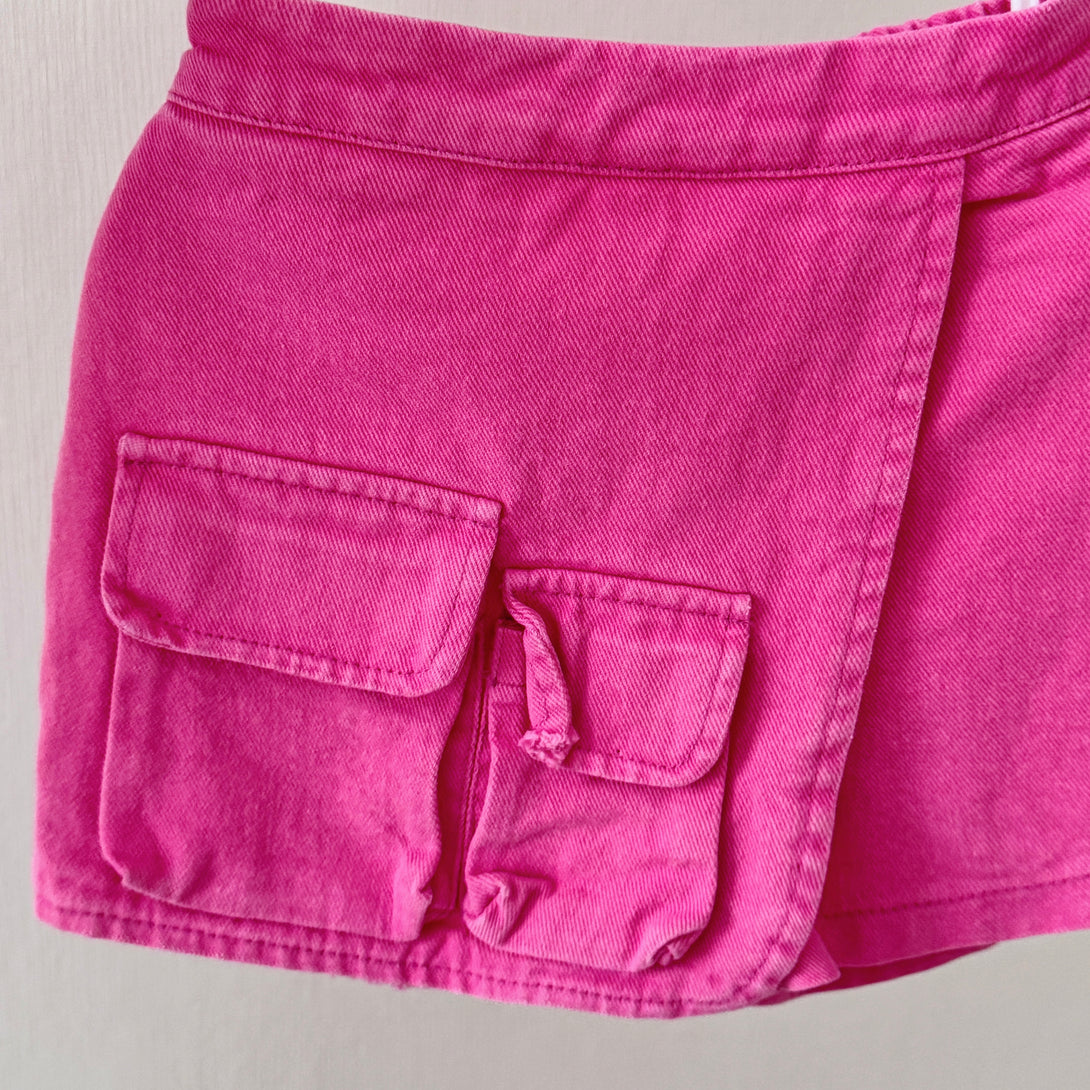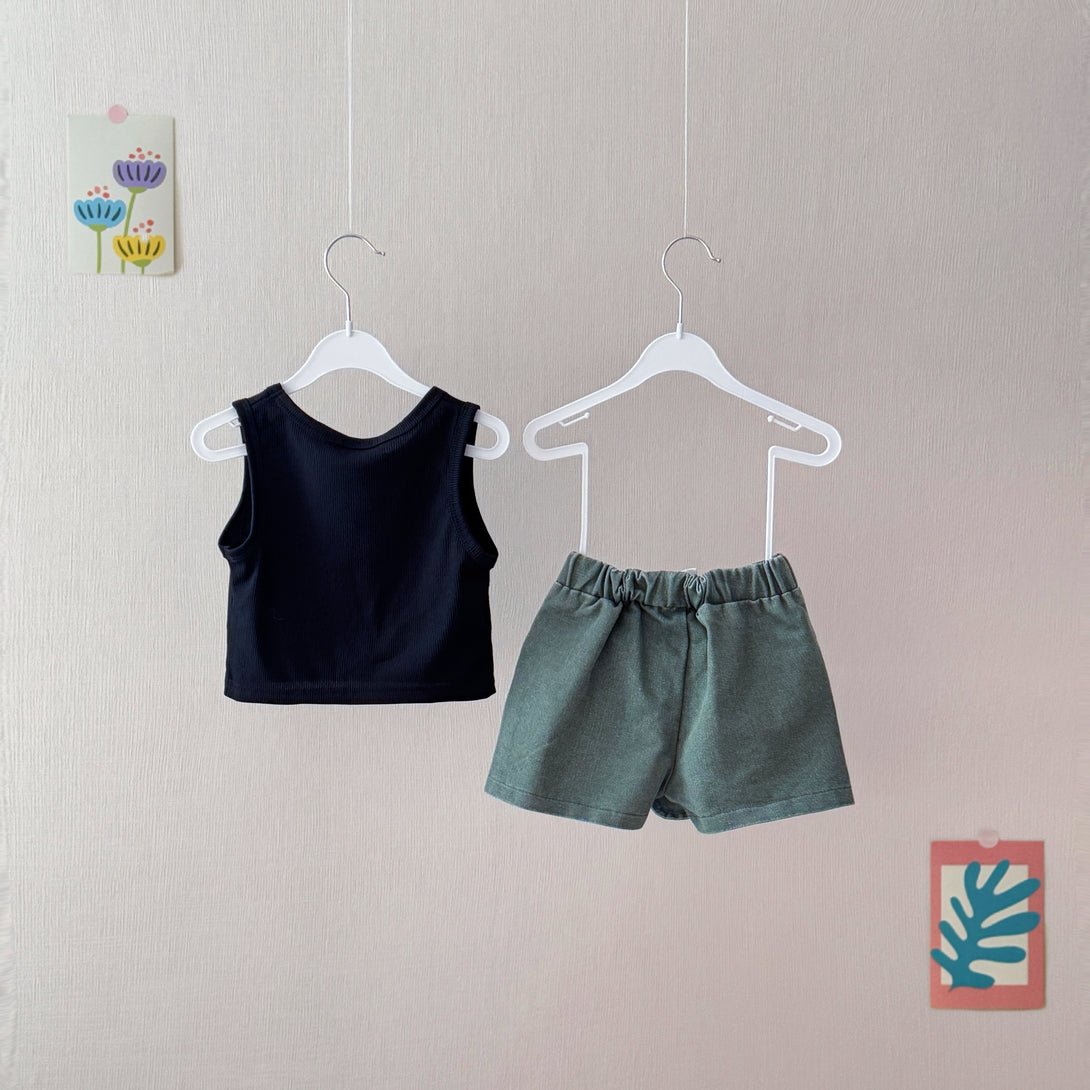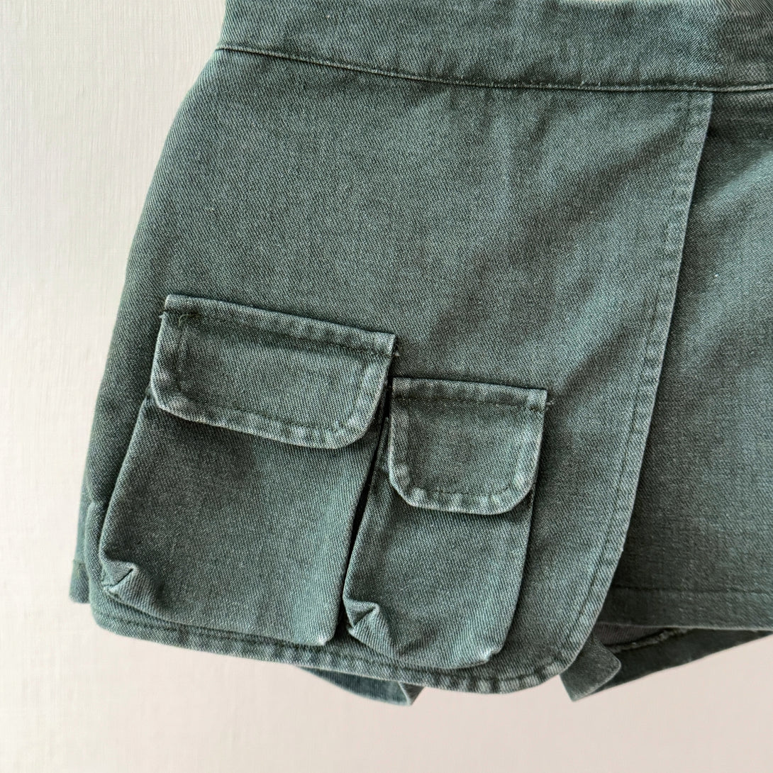 This set is a combination of a simple sleeveless top and a denim wrap skirt (pink and army green). The top is made of soft and breathable fabric, which makes it comfortable to wear. The shorts have a unique wrap design and two practical front pockets, giving babies a stylish and casual look, perfect for everyday wear.