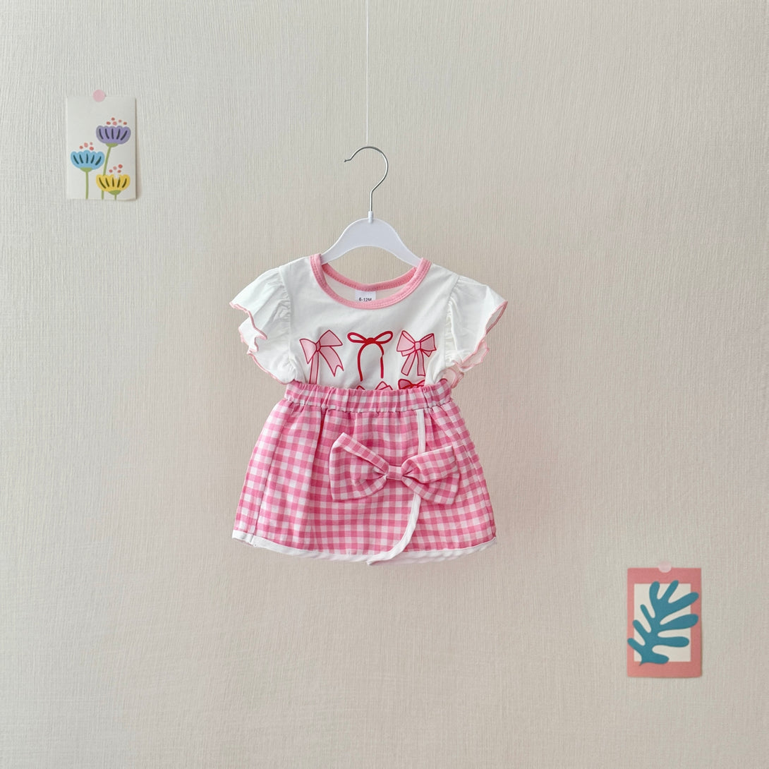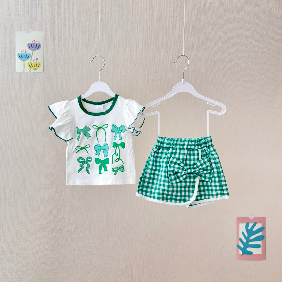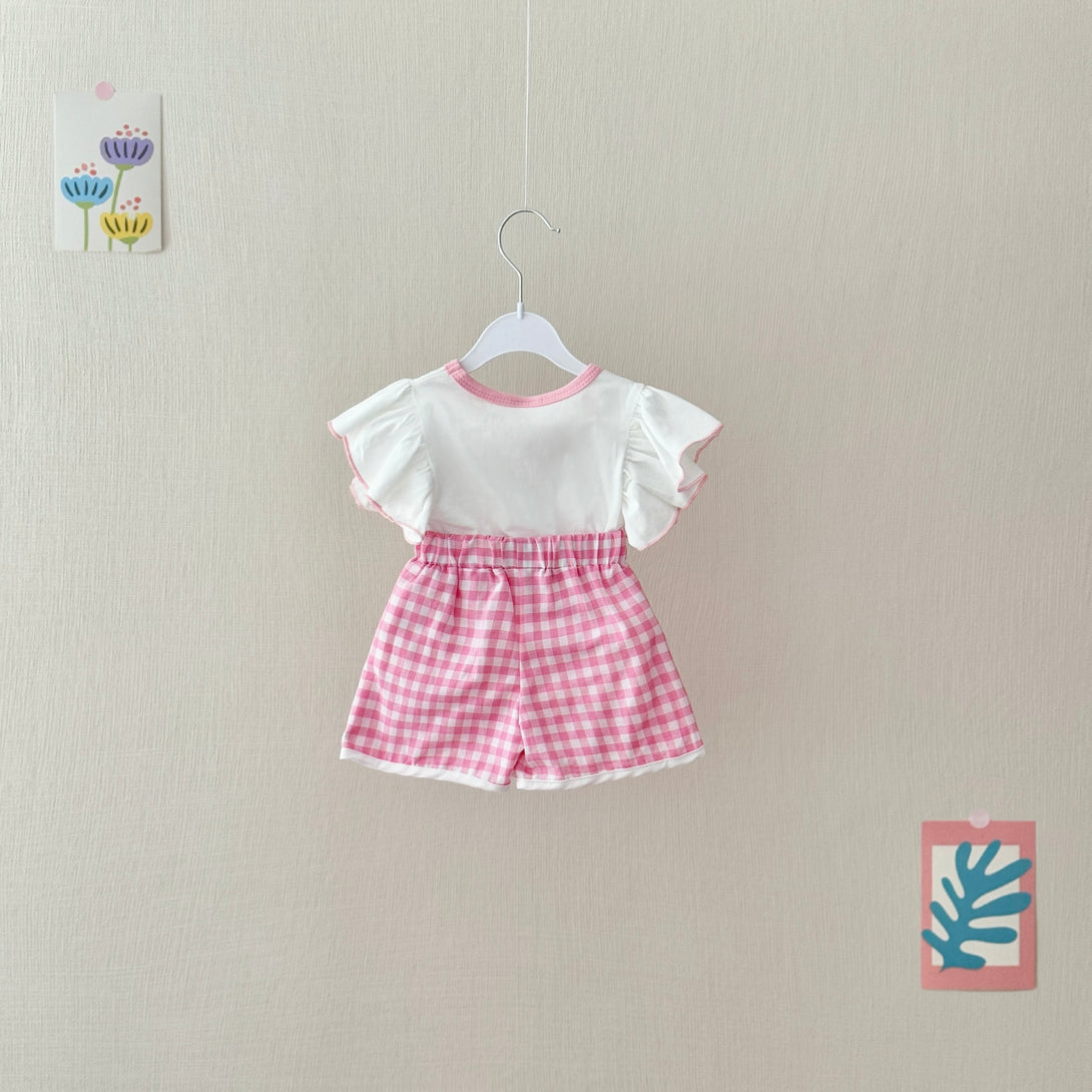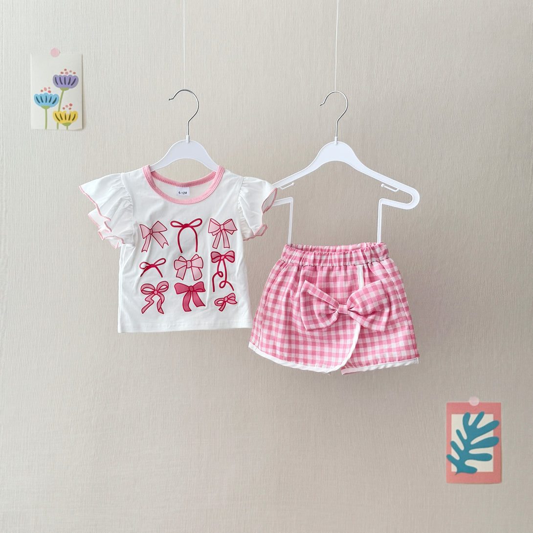 This set includes a white short-sleeved top with ruffled sleeves and pink trim. The top is adorned with different bow prints that add a cute touch. Paired with it are plaid patterned shorts with a large bow on the front. The fabric of the top is soft and breathable and the shorts are lightweight and comfortable, making them perfect for little ones.