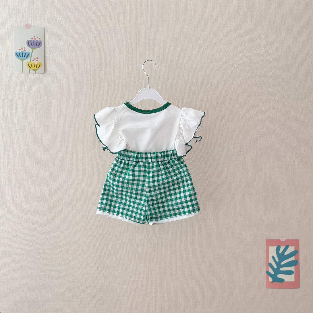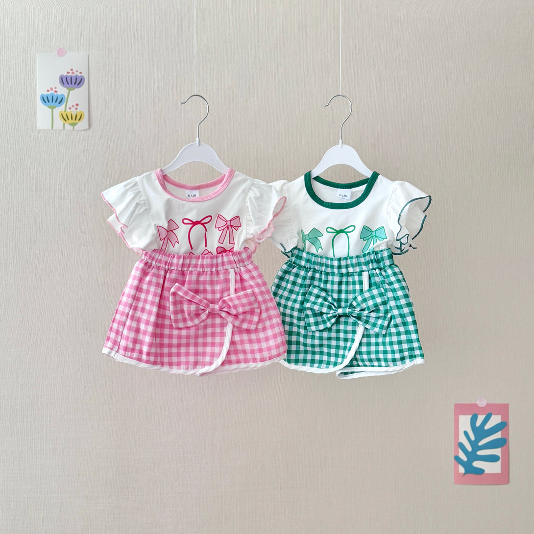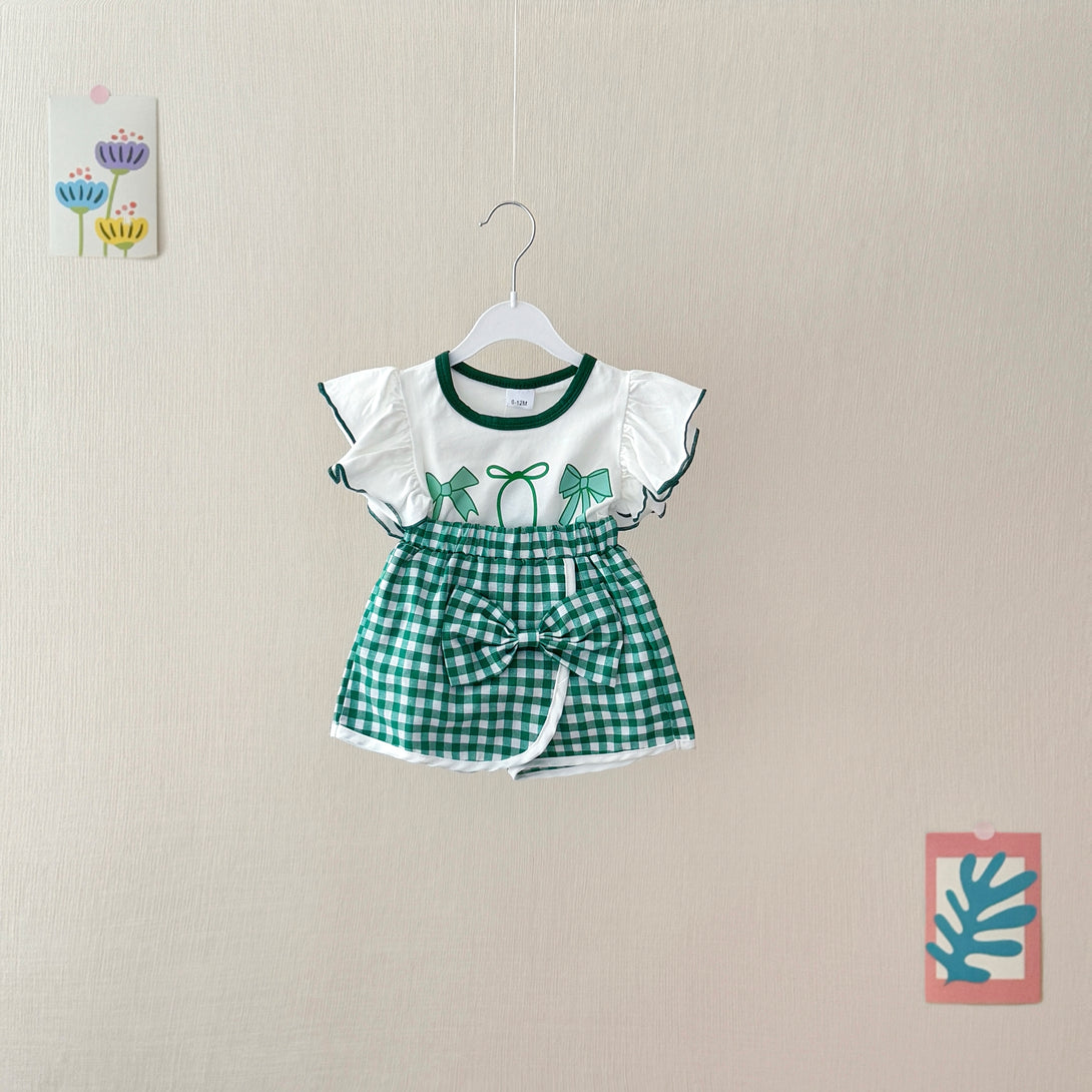 This set includes a white short-sleeved top with ruffled sleeves and pink trim. The top is adorned with different bow prints that add a cute touch. Paired with it are plaid patterned shorts with a large bow on the front. The fabric of the top is soft and breathable and the shorts are lightweight and comfortable, making them perfect for little ones.