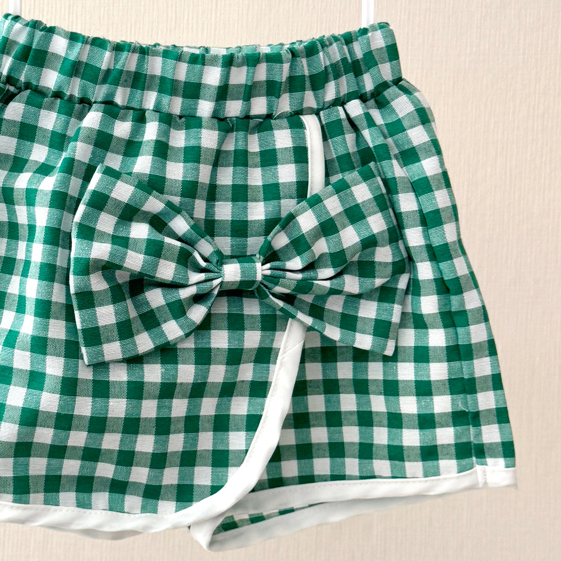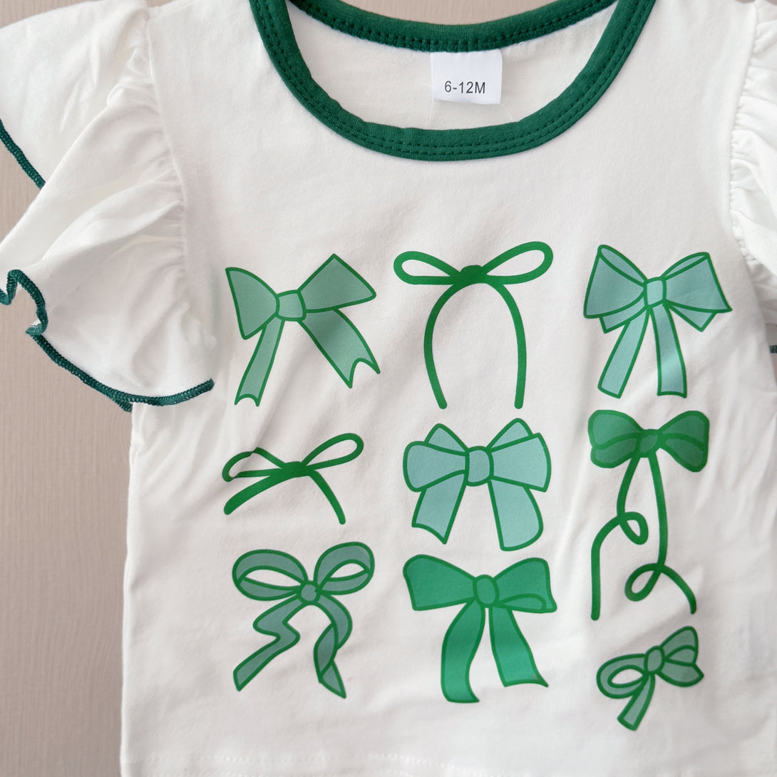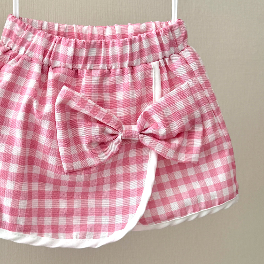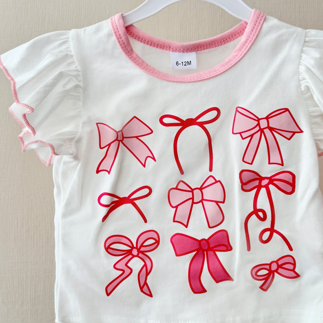 This set includes a white short-sleeved top with ruffled sleeves and pink trim. The top is adorned with different bow prints that add a cute touch. Paired with it are plaid patterned shorts with a large bow on the front. The fabric of the top is soft and breathable and the shorts are lightweight and comfortable, making them perfect for little ones.