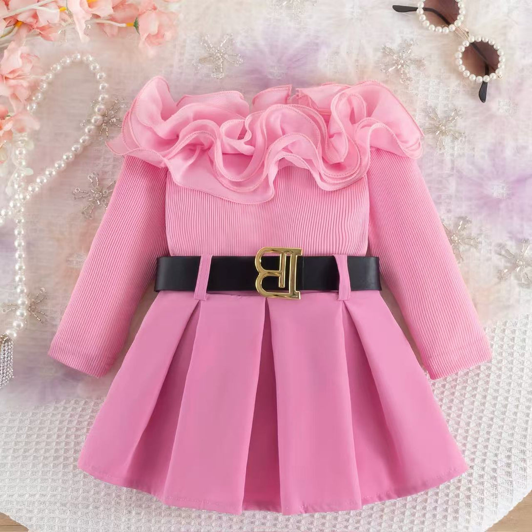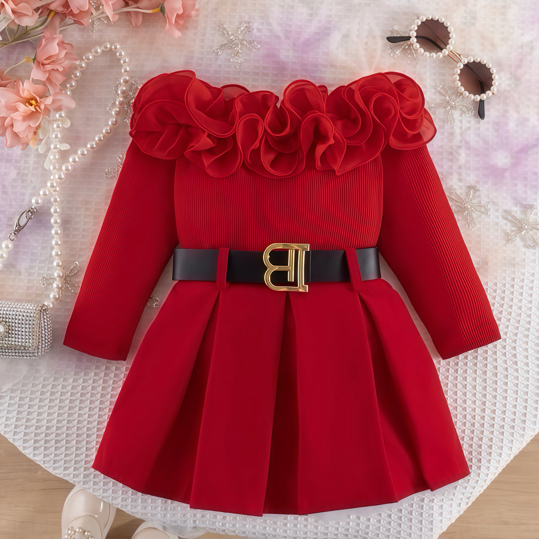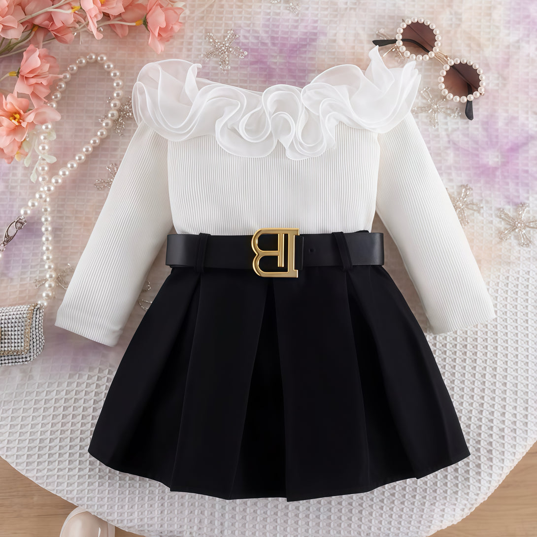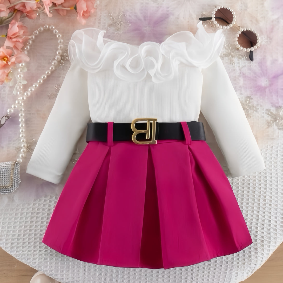 This charming outfit features a ruffled top with delicate off-shoulder detailing, paired with a pleated skirt. The look is completed with a stylish black belt and gold buckle, adding a touch of elegance. Perfect for special occasions or festive gatherings, this set combines comfort with a chic, modern design.