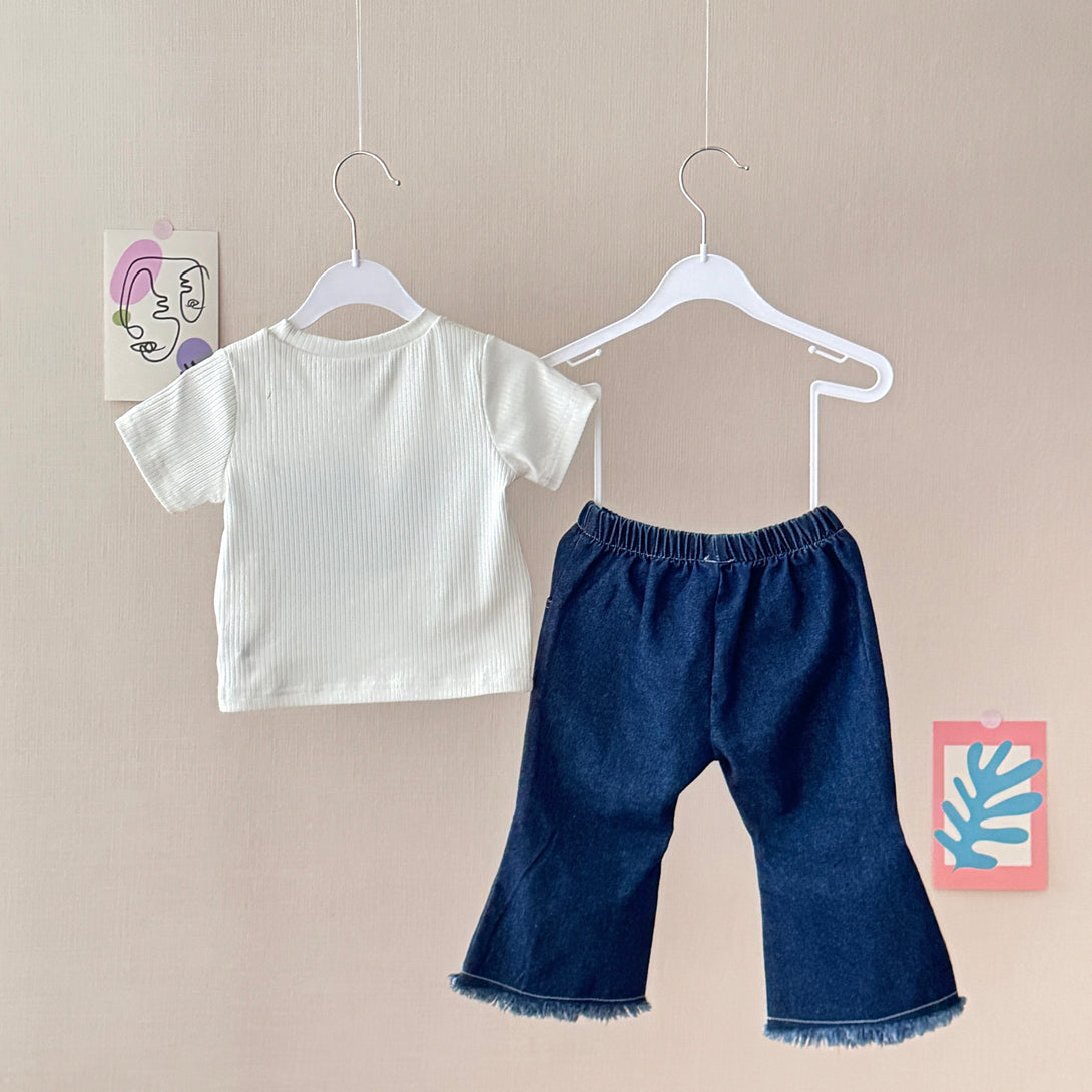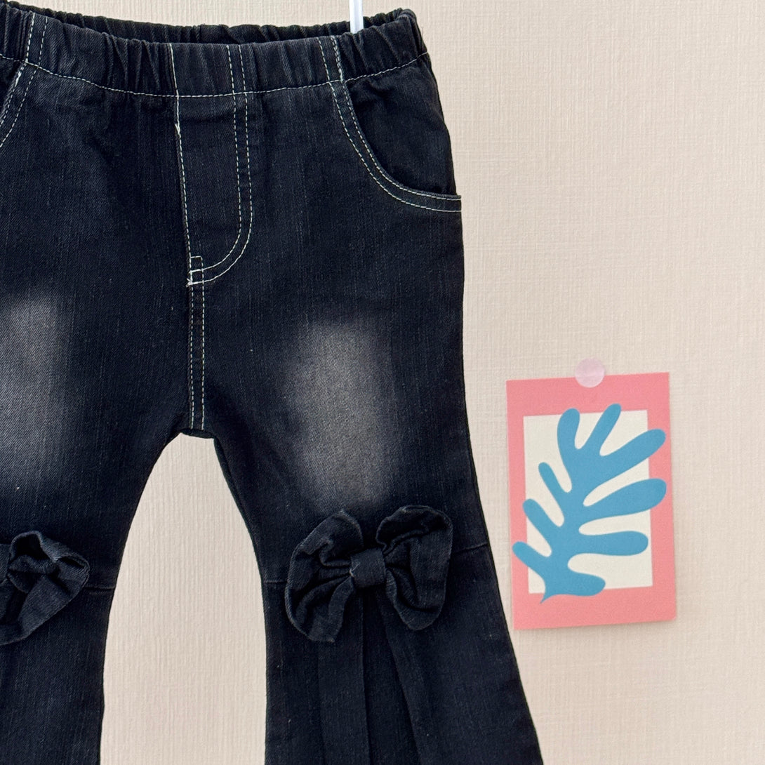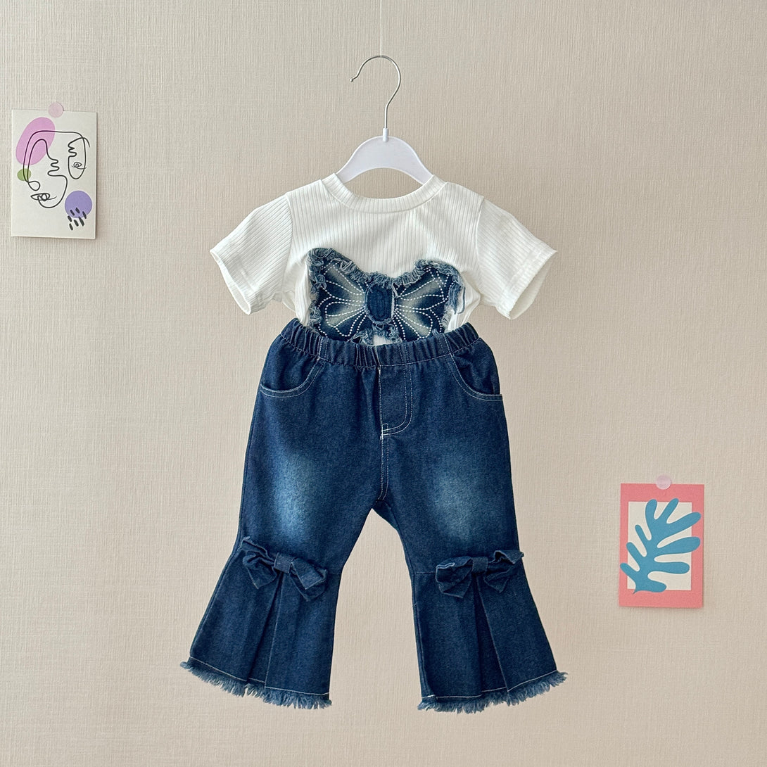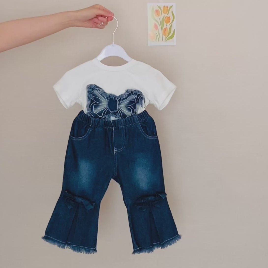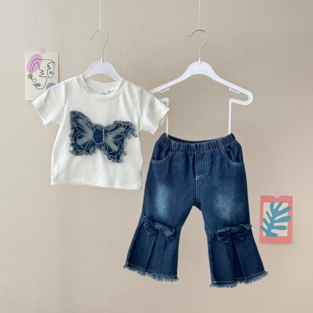 This stylish two-piece set features a ribbed cotton T-shirt with a chic denim bow applique and a pair of flared denim pants adorned with matching bows. The soft, breathable fabric ensures comfort, while the trendy design adds a fashionable touch. Available in blue, pink, and black.