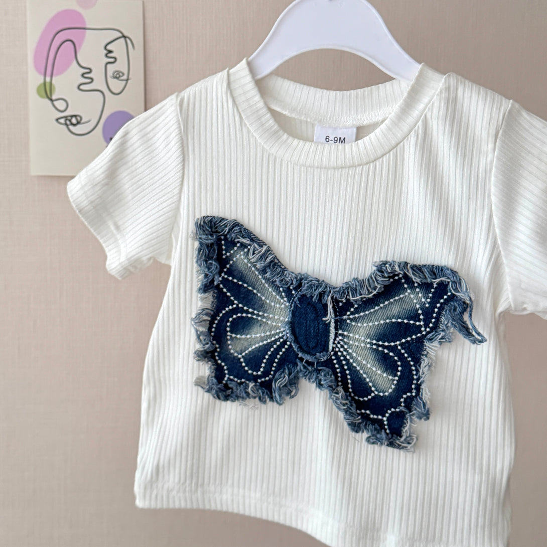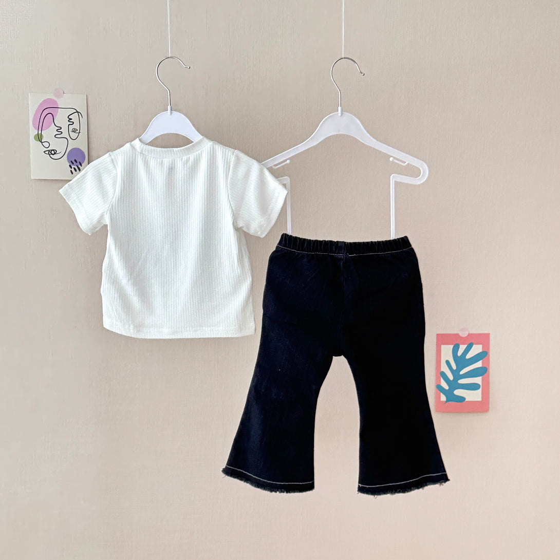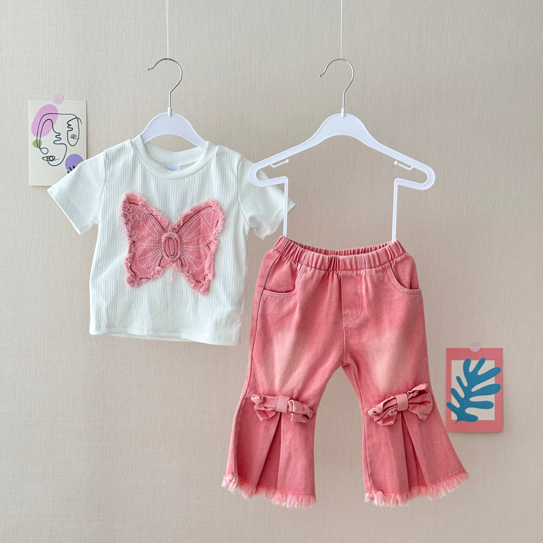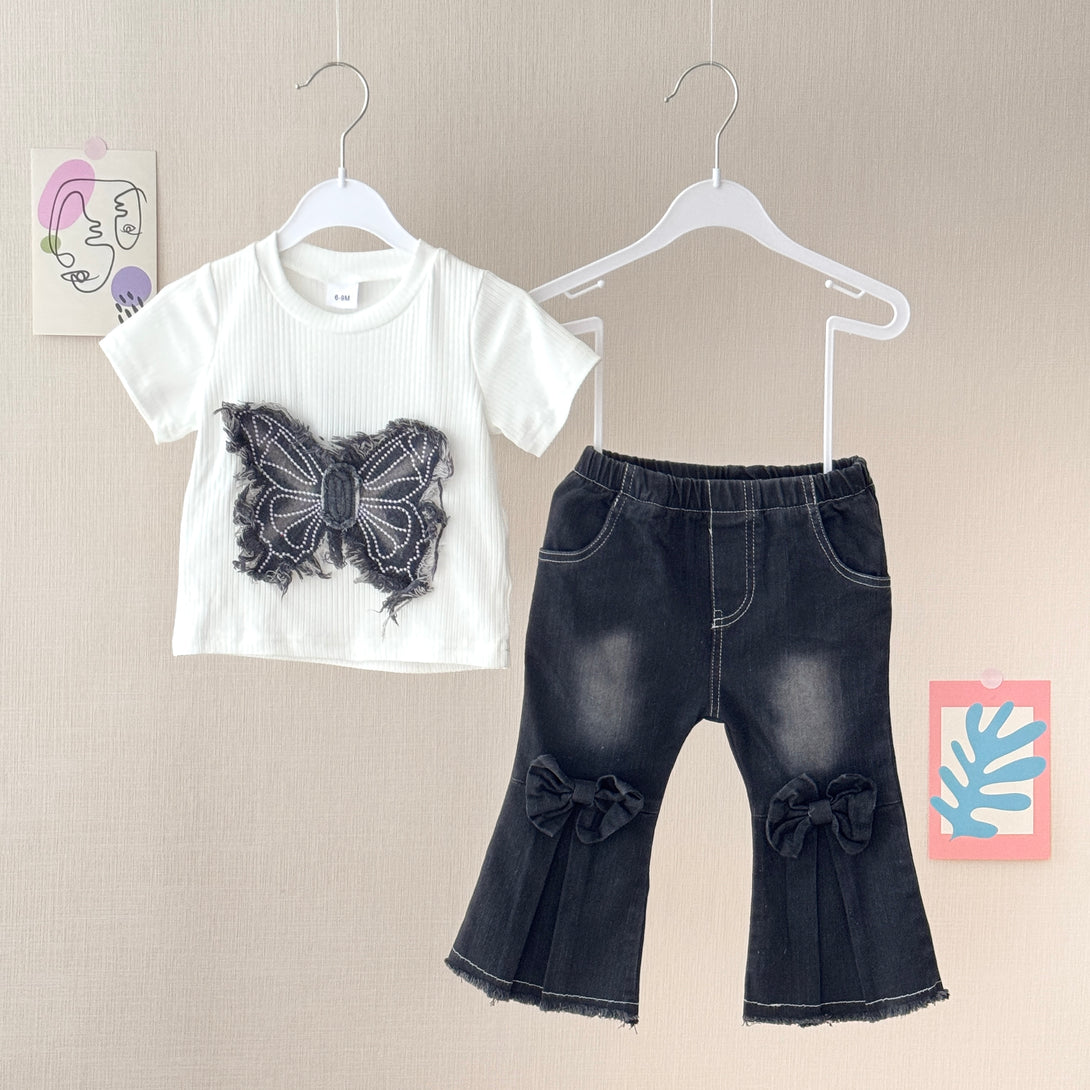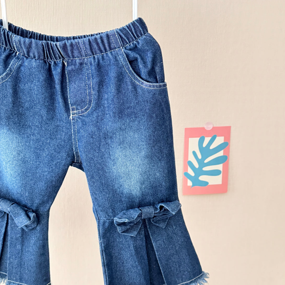 This stylish two-piece set features a ribbed cotton T-shirt with a chic denim bow applique and a pair of flared denim pants adorned with matching bows. The soft, breathable fabric ensures comfort, while the trendy design adds a fashionable touch. Available in blue, pink, and black.