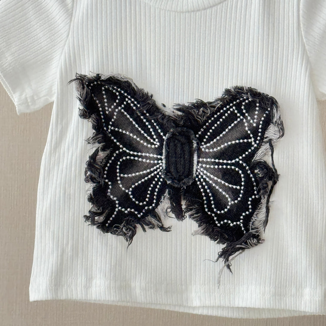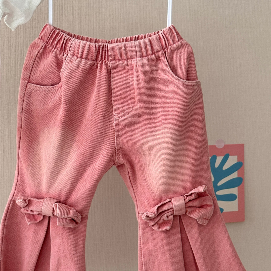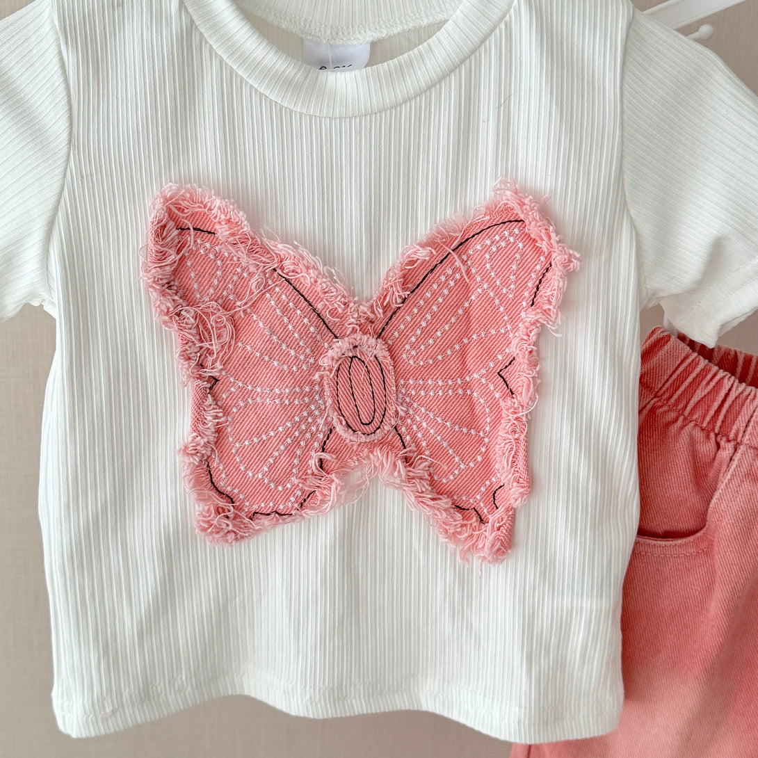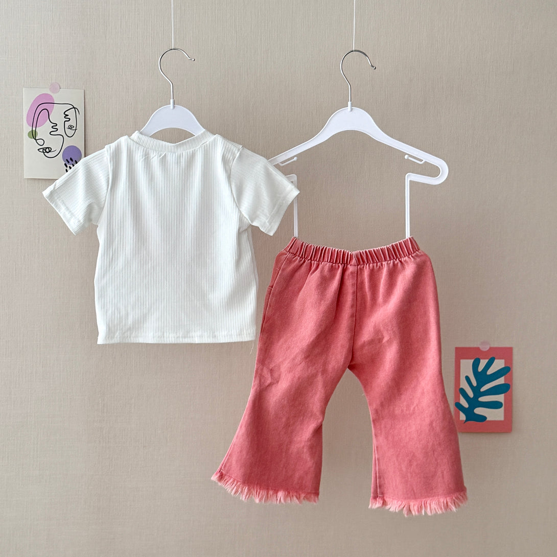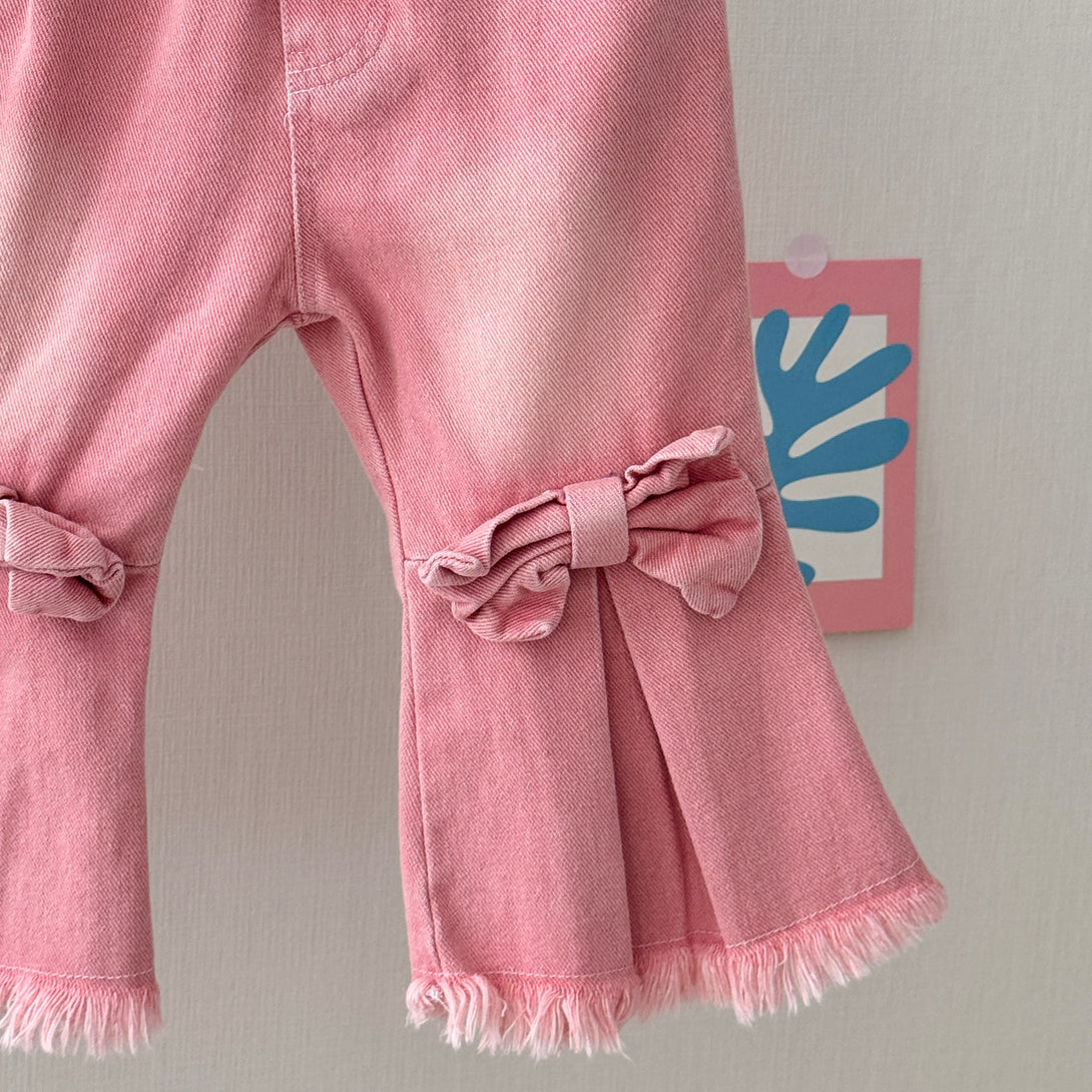 This stylish two-piece set features a ribbed cotton T-shirt with a chic denim bow applique and a pair of flared denim pants adorned with matching bows. The soft, breathable fabric ensures comfort, while the trendy design adds a fashionable touch. Available in blue, pink, and black.