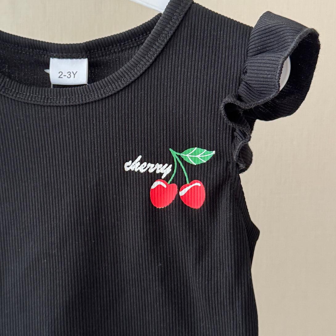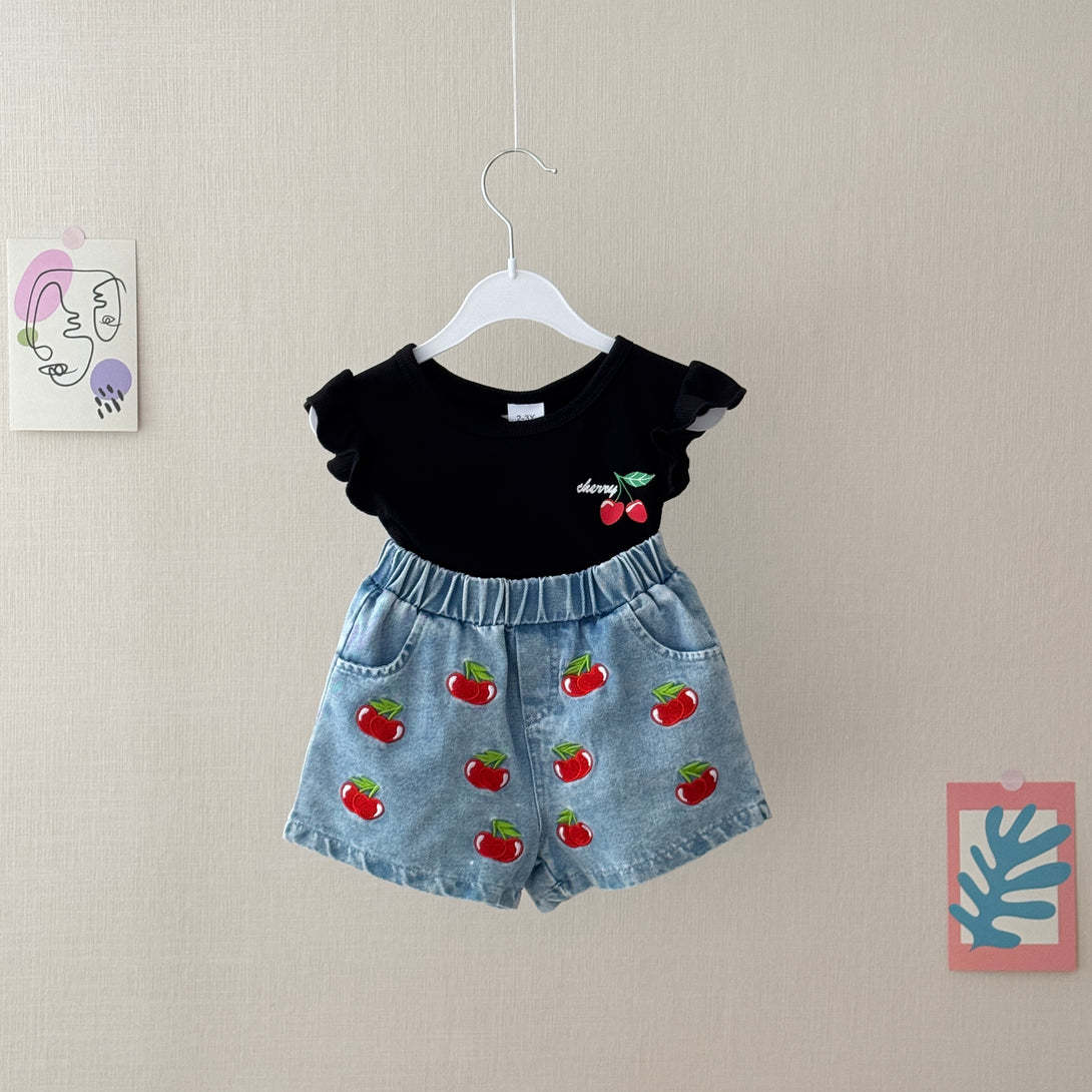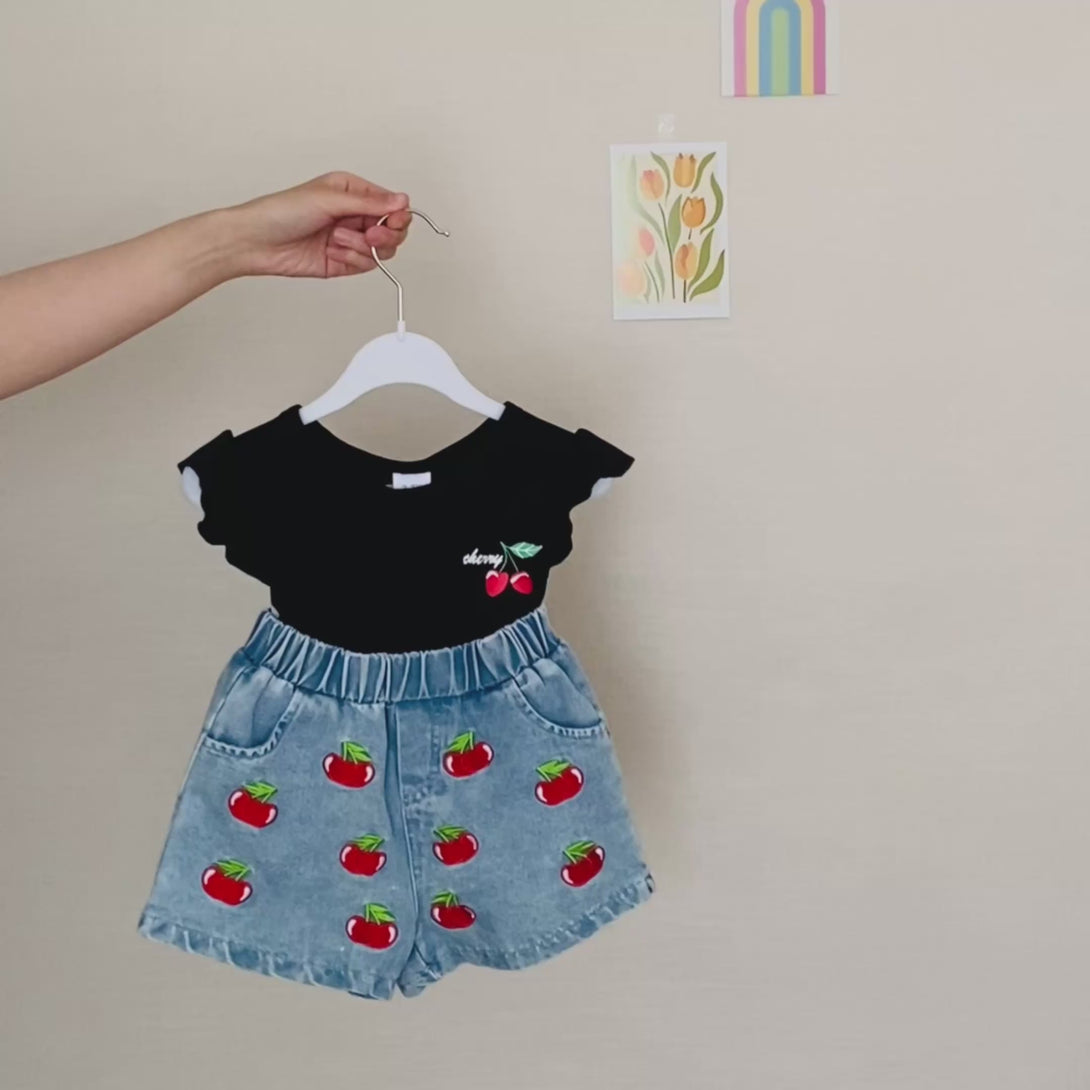 Cute cherry-themed set featuring a soft ribbed top with ruffle sleeves and matching denim shorts. Lightweight, breathable, and perfect for a stylish summer look.