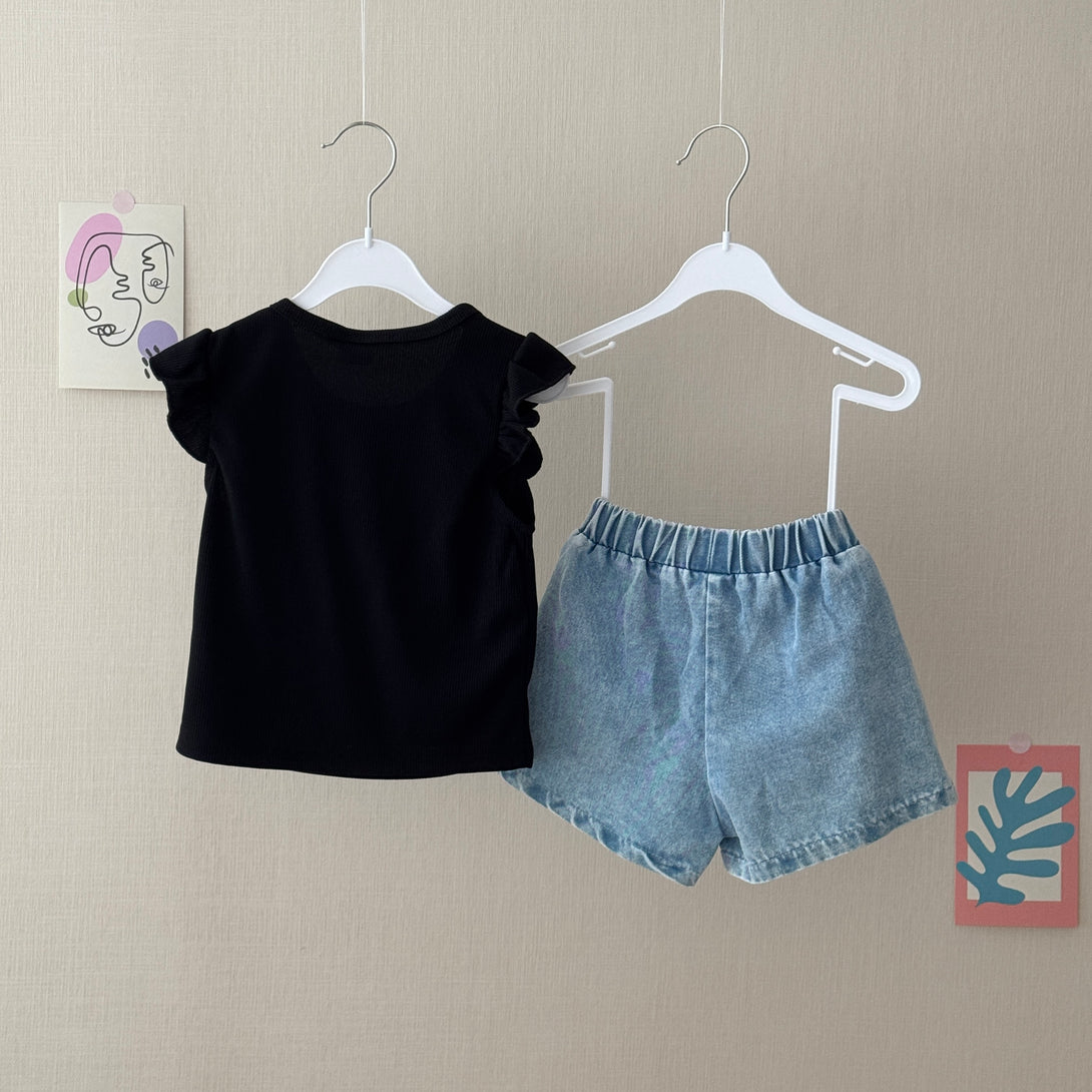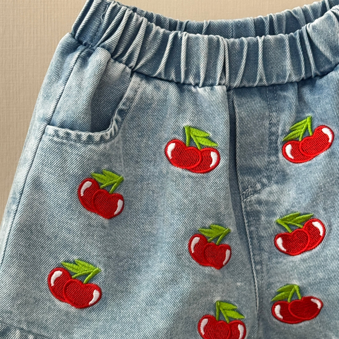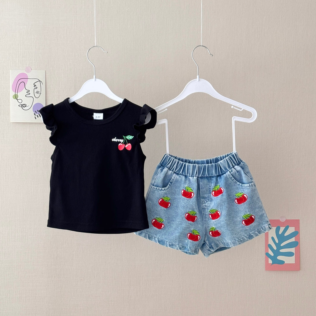 Cute cherry-themed set featuring a soft ribbed top with ruffle sleeves and matching denim shorts. Lightweight, breathable, and perfect for a stylish summer look.