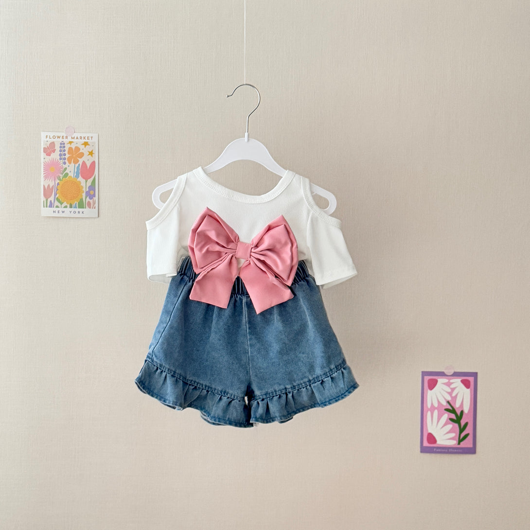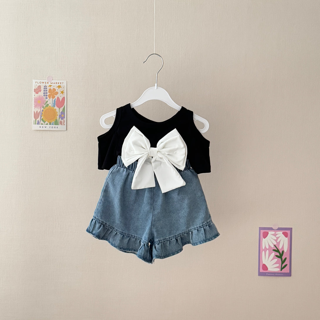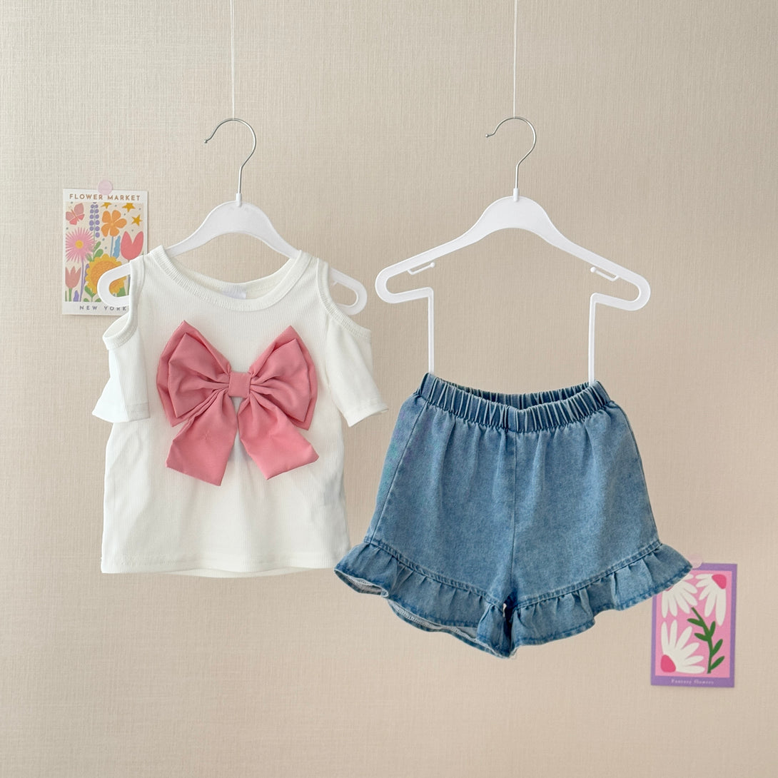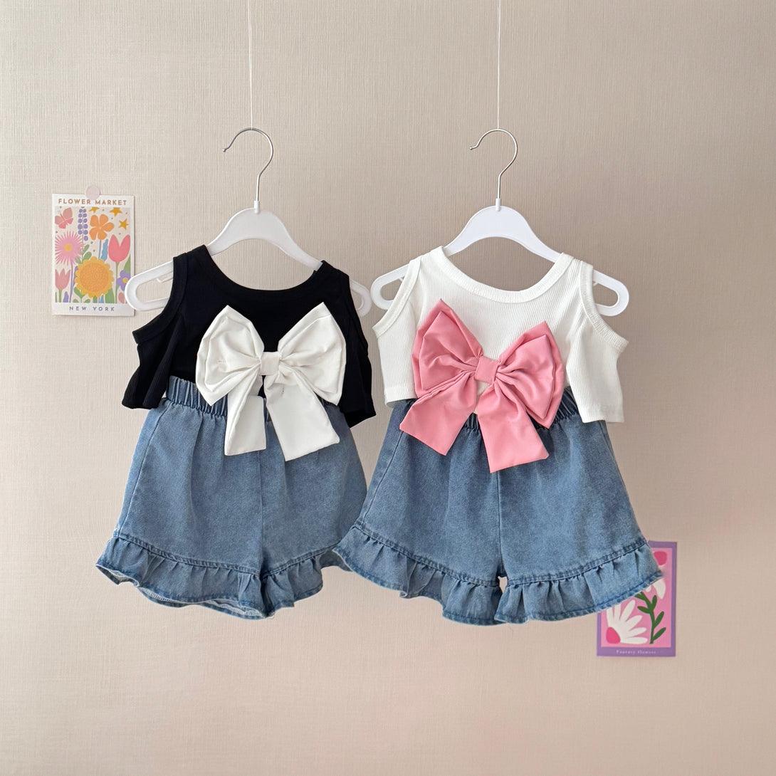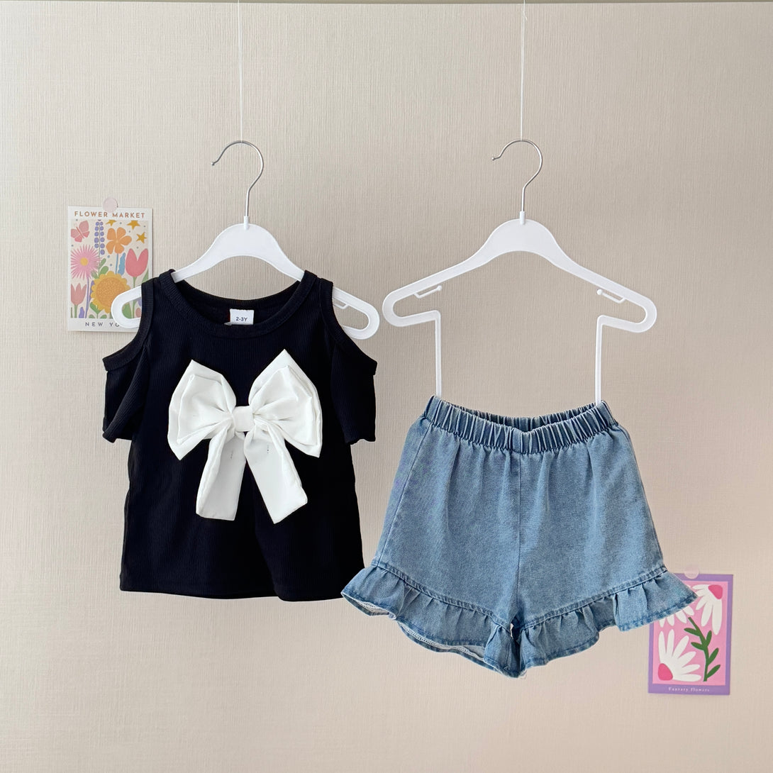 This two-piece outfit features a trendy cold-shoulder ribbed top in classic black or white, adorned with an oversized silky bow for a touch of sweetness. The high-waisted denim shorts with ruffled hems add a cute and stylish flair, making this set ideal for casual outings or special occasions. Crafted from soft, breathable fabric, it ensures comfort while keeping your child looking effortlessly chic.