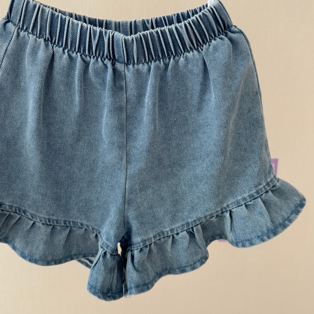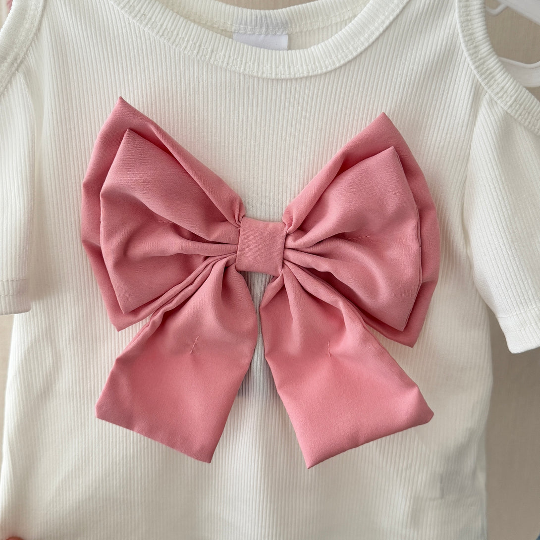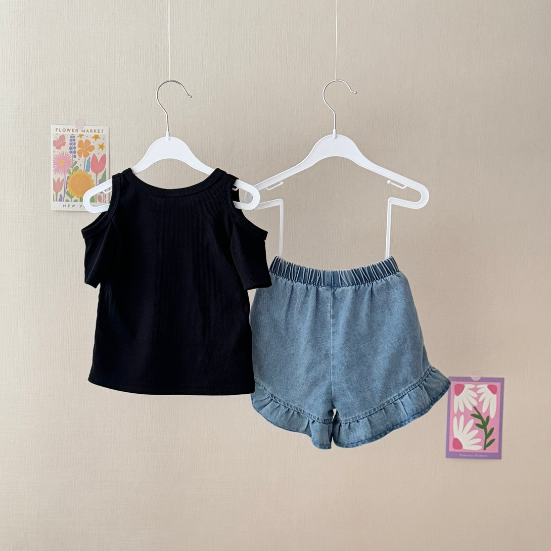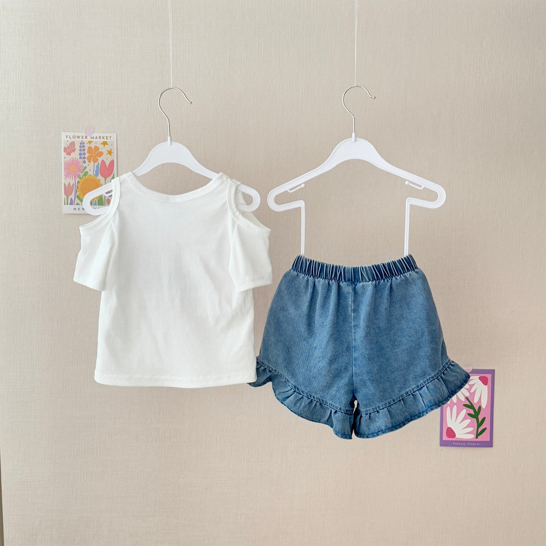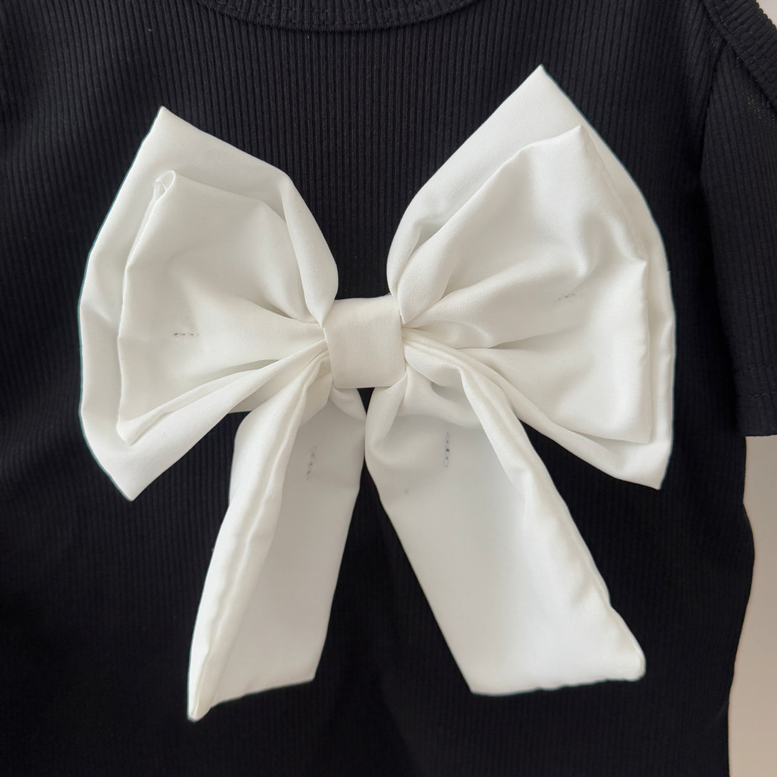 This two-piece outfit features a trendy cold-shoulder ribbed top in classic black or white, adorned with an oversized silky bow for a touch of sweetness. The high-waisted denim shorts with ruffled hems add a cute and stylish flair, making this set ideal for casual outings or special occasions. Crafted from soft, breathable fabric, it ensures comfort while keeping your child looking effortlessly chic.