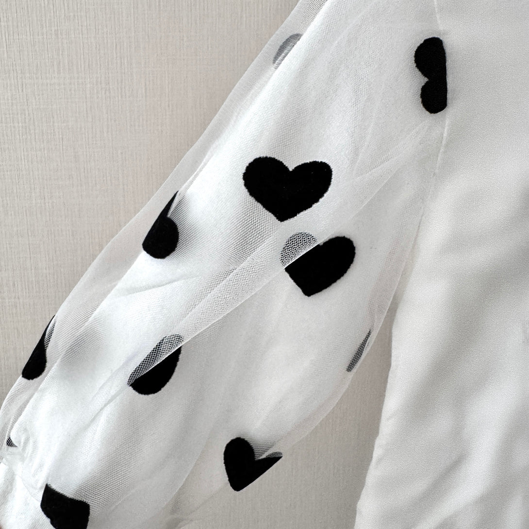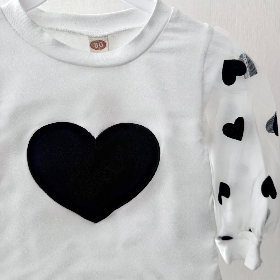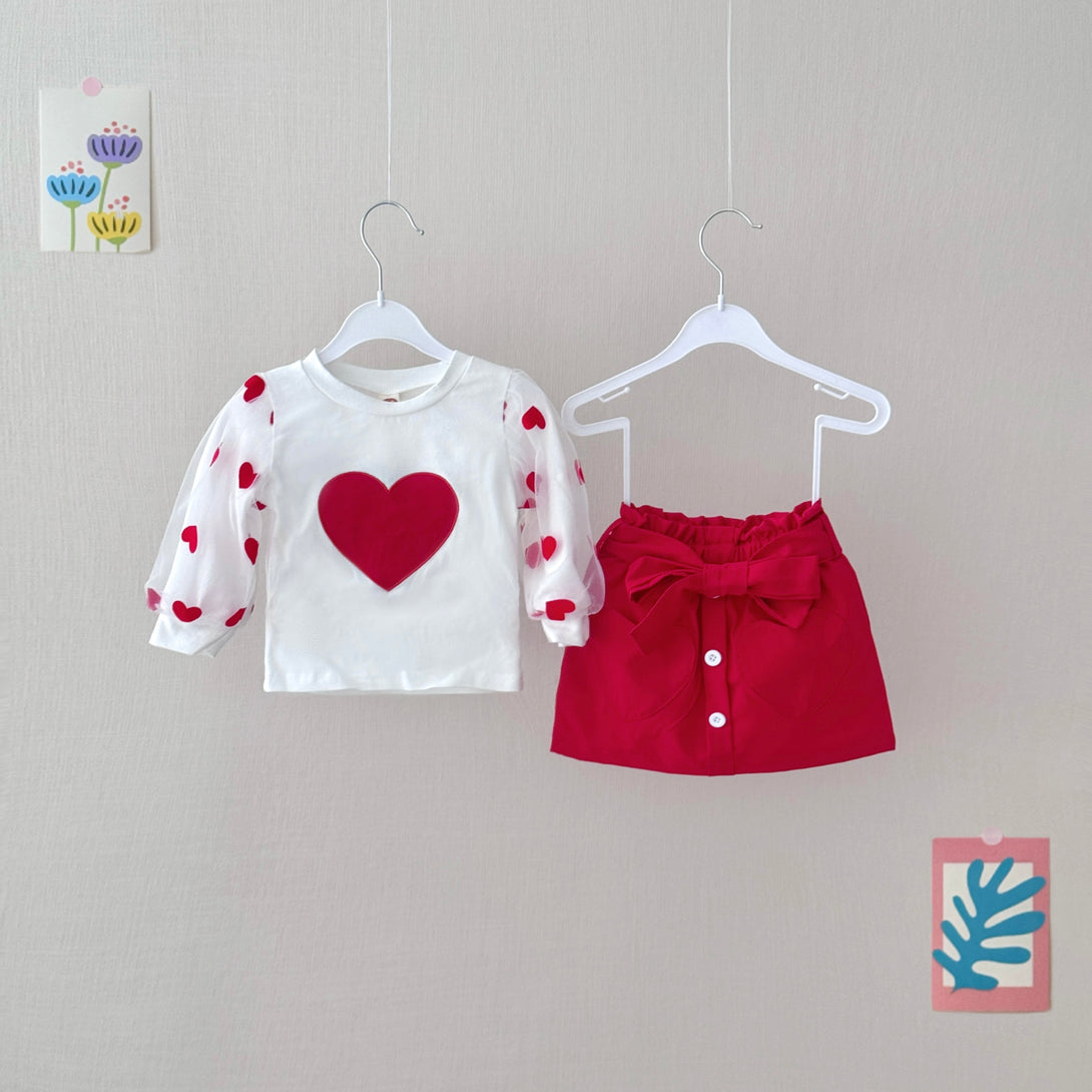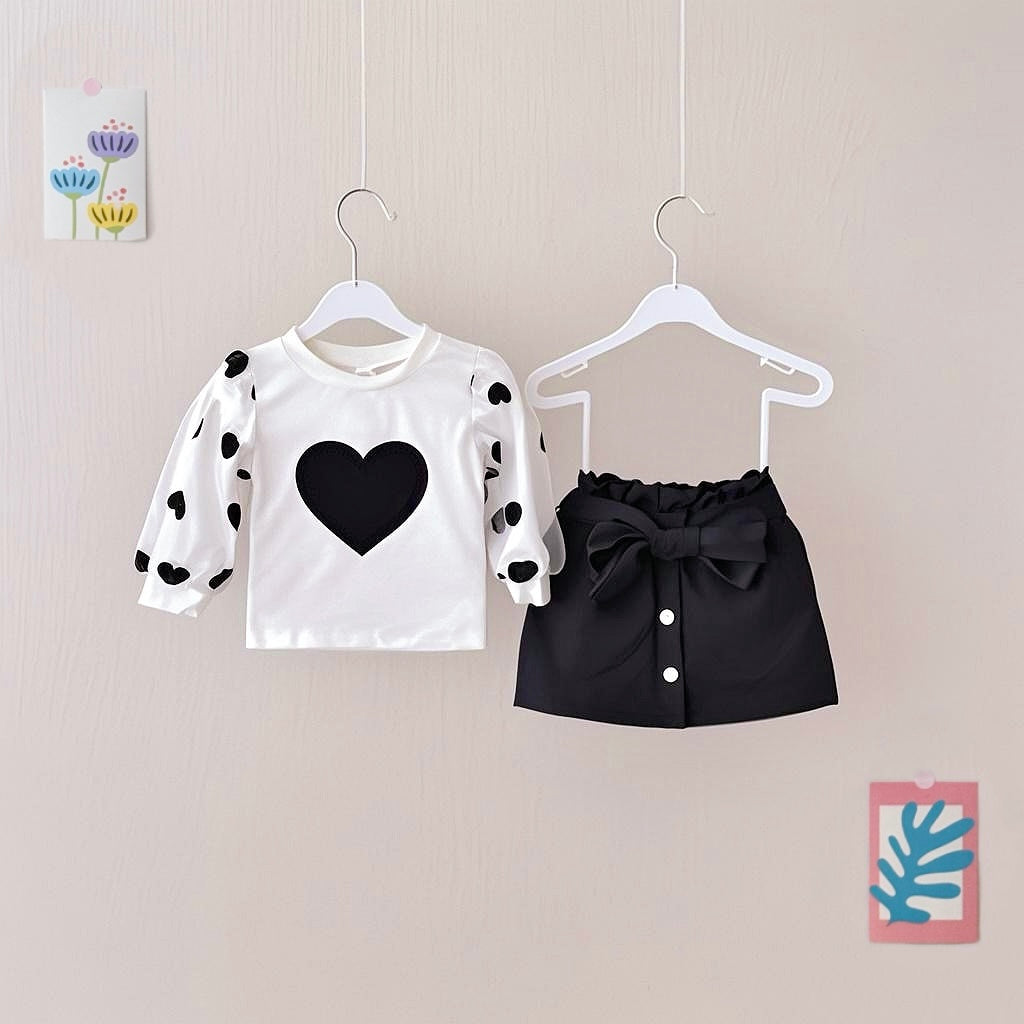 The white lace long-sleeve top in this set is made from a soft and comfortable fabric with hearts on the sleeves, and a large heart in the center of the top for added cuteness. Paired with it is a lovely short skirt with a large bow belt, heart-shaped pockets and white buttons. The skirt is made from durable and comfortable material for everyday wear. Ideal for creating a cute and romantic look.