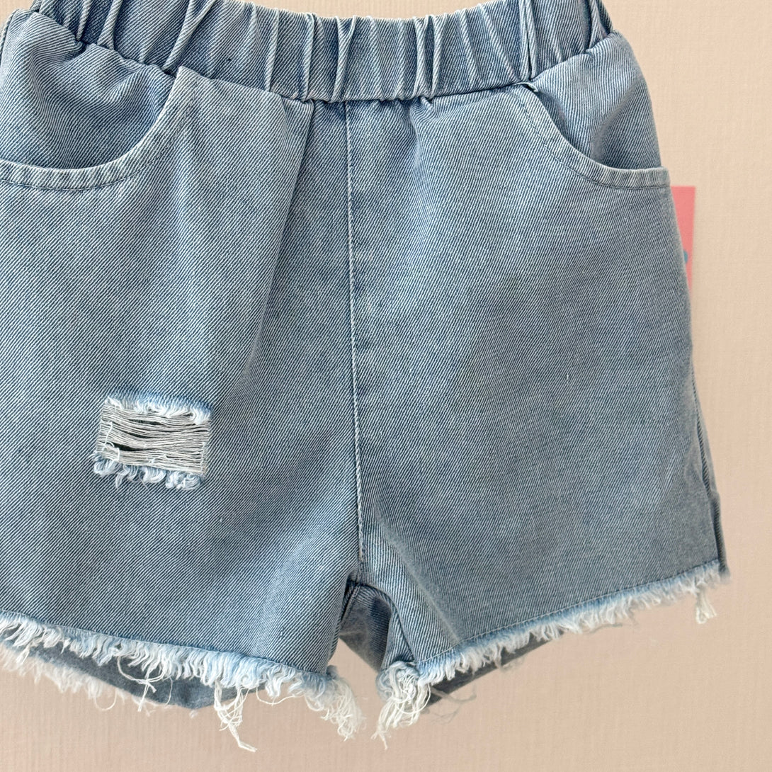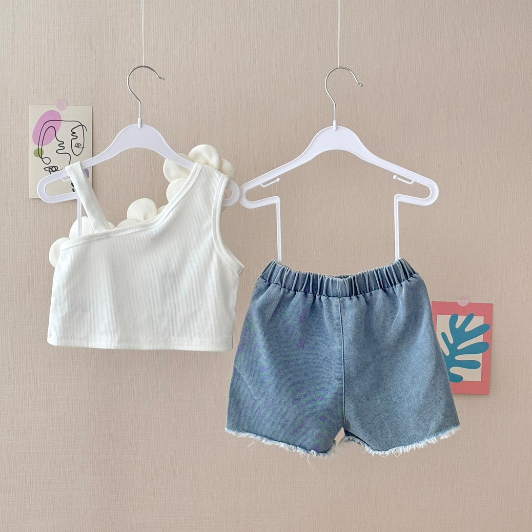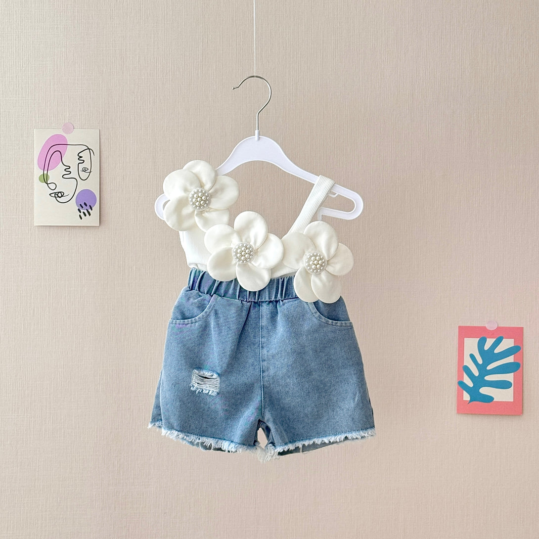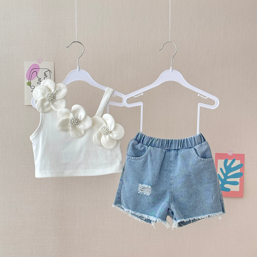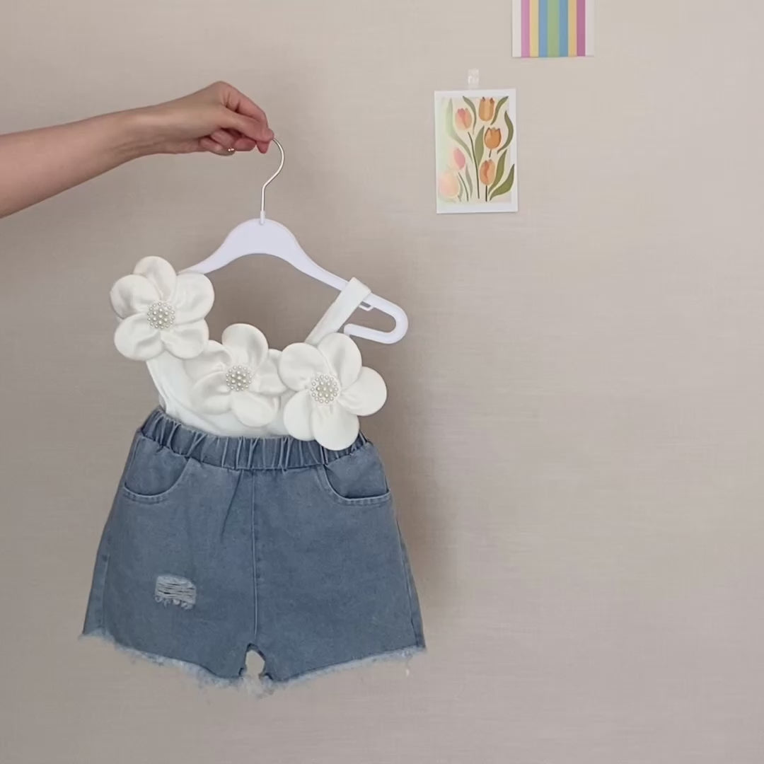 Stylish 2-piece set features a one-shoulder white crop top with pearl-adorned 3D flowers, paired with distressed denim shorts with an elastic waistband. Made from a soft cotton blend and lightweight denim, it’s comfy, breathable, and perfect for summer!