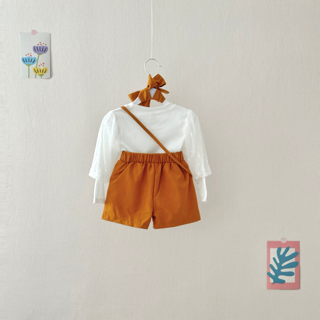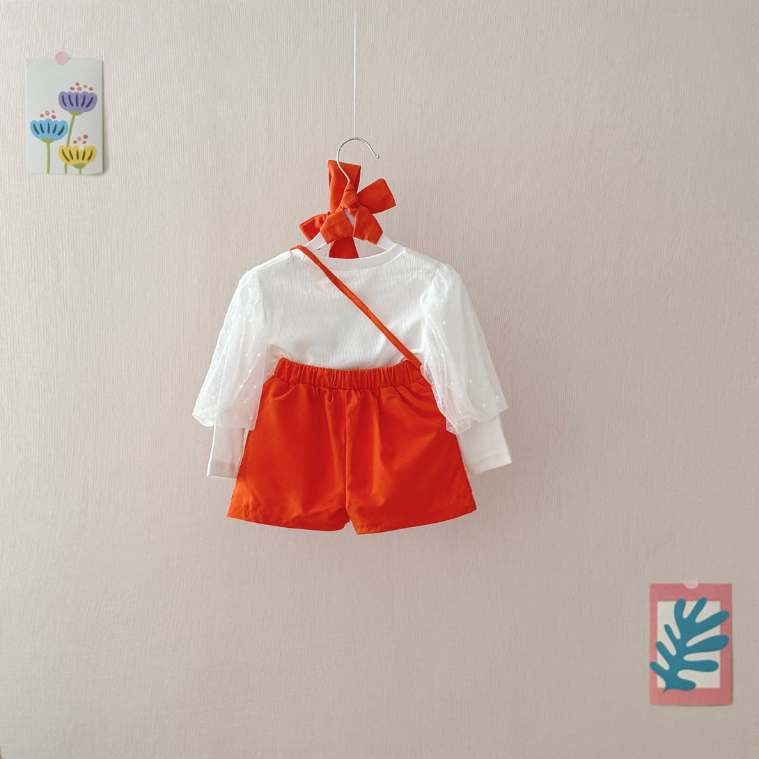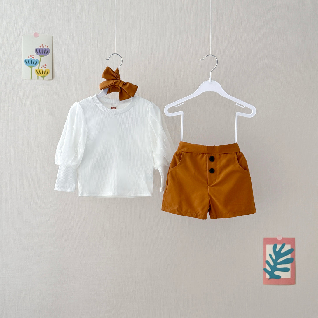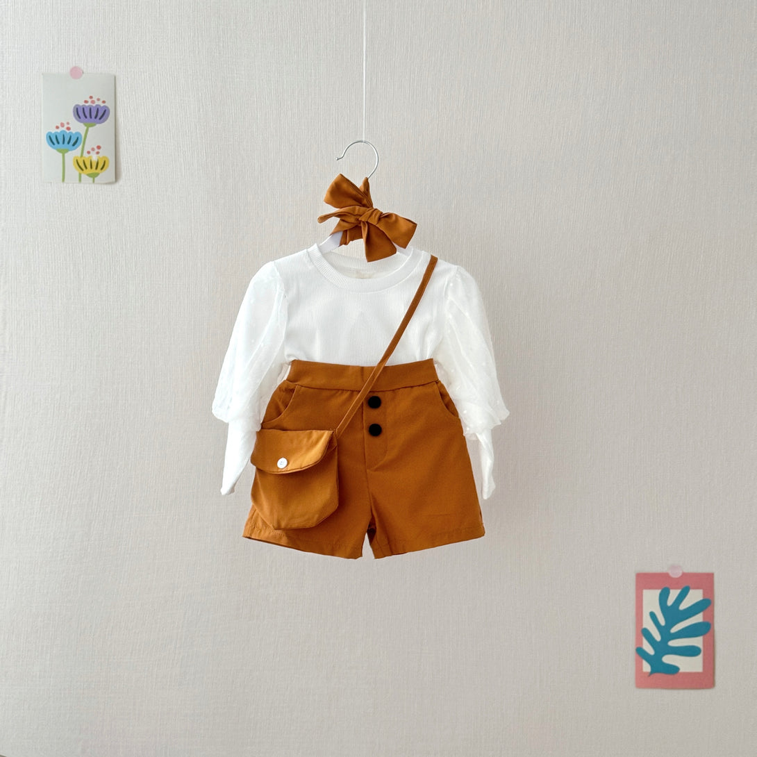 This charming outfit features a long-sleeved top made from a dotted mesh material that creates a puffy sleeve effect. The body of the top has a ribbed texture that is both stylish and comfortable. Paired with it are high-waisted shorts made from durable cotton fabric. The set also comes with a matching crossbody bag for a more fashion forward look.