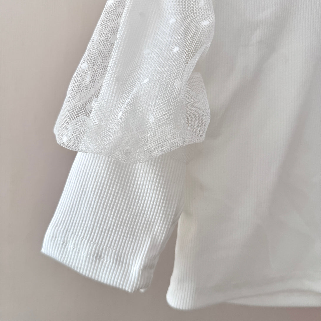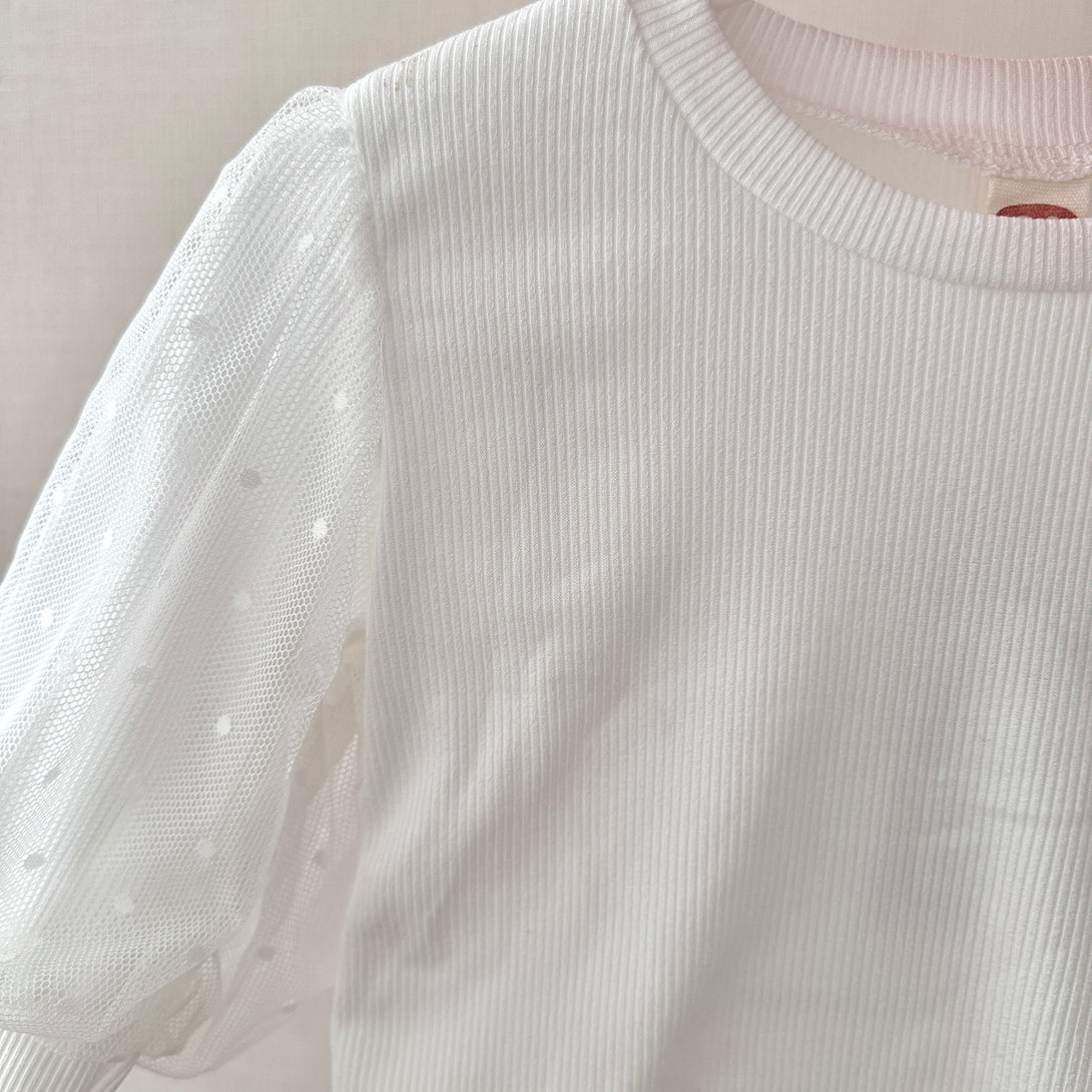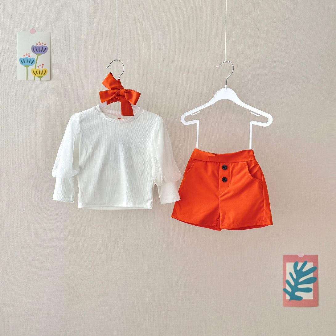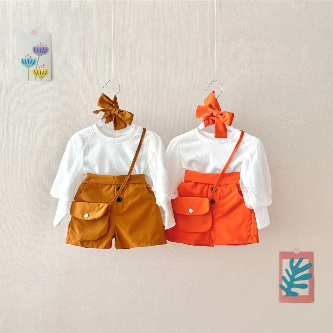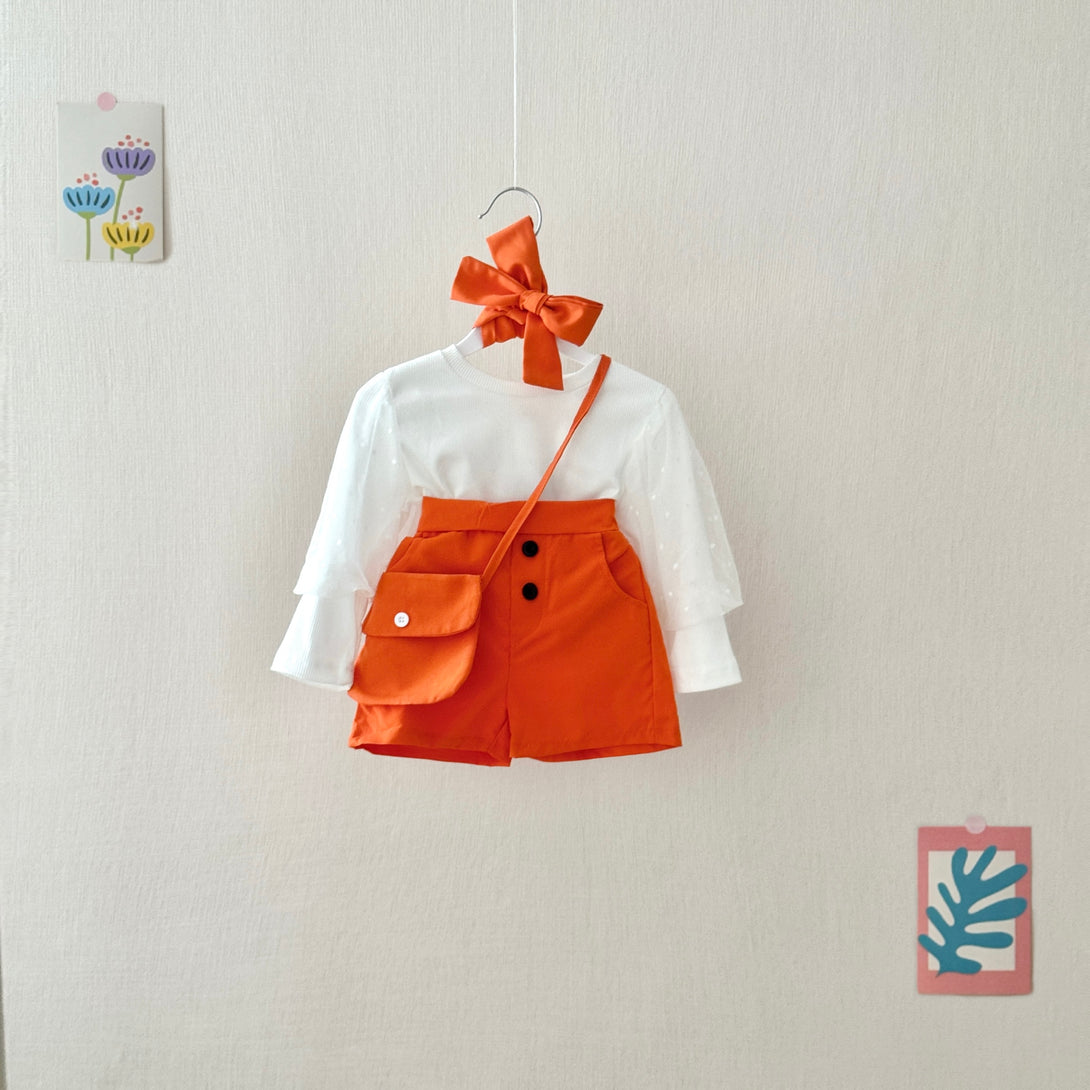 This charming outfit features a long-sleeved top made from a dotted mesh material that creates a puffy sleeve effect. The body of the top has a ribbed texture that is both stylish and comfortable. Paired with it are high-waisted shorts made from durable cotton fabric. The set also comes with a matching crossbody bag for a more fashion forward look.